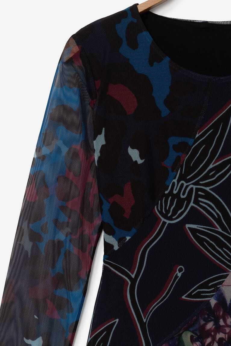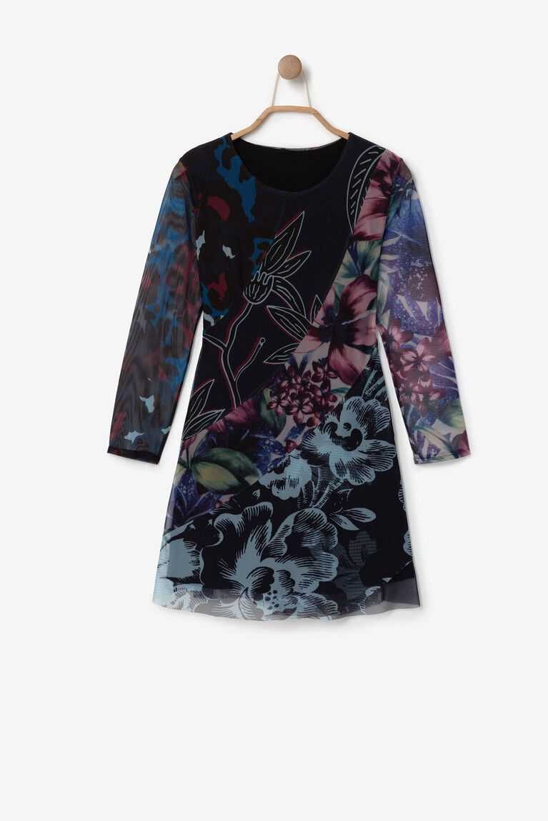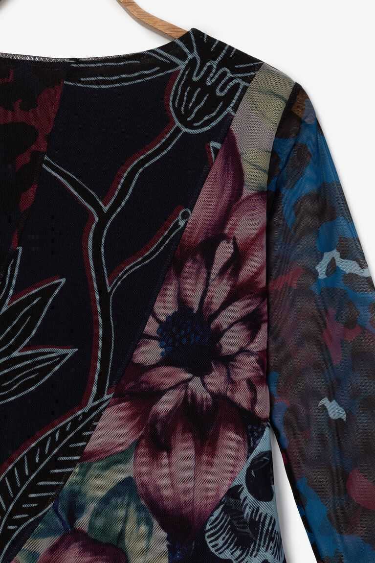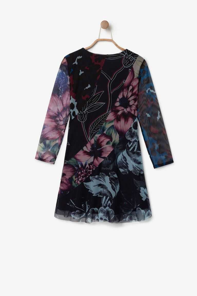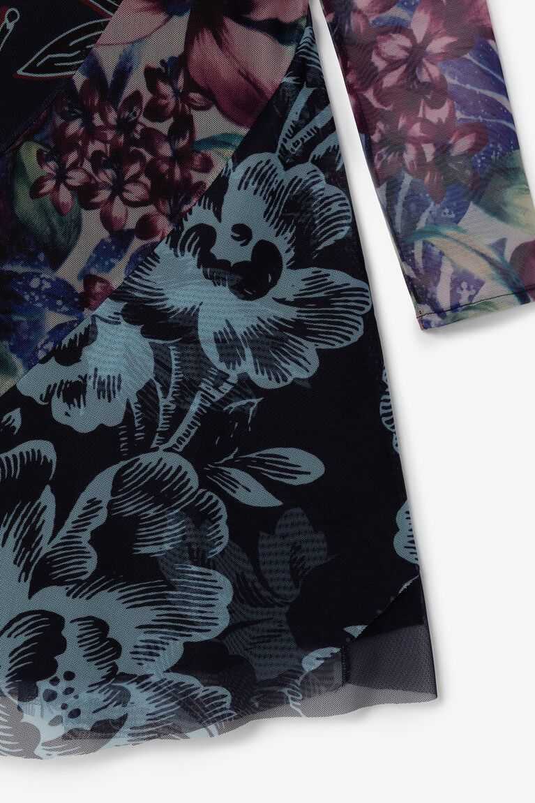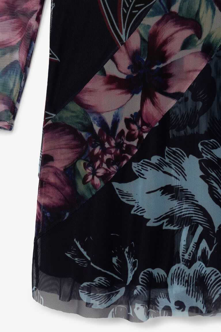 Don't miss one of this season's greatest trends: the 3D effect; on this dress, it creates a fun interplay between the inner sleeveless layer and the outer layer in semi-sheer tulle with a patchwork of floral prints in different styles.