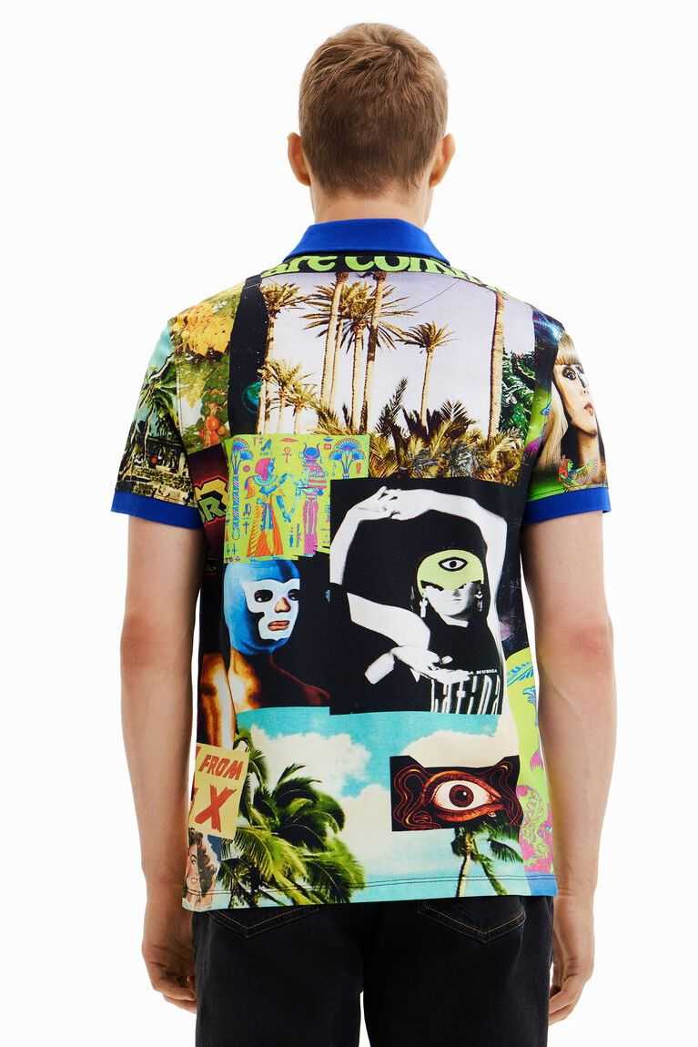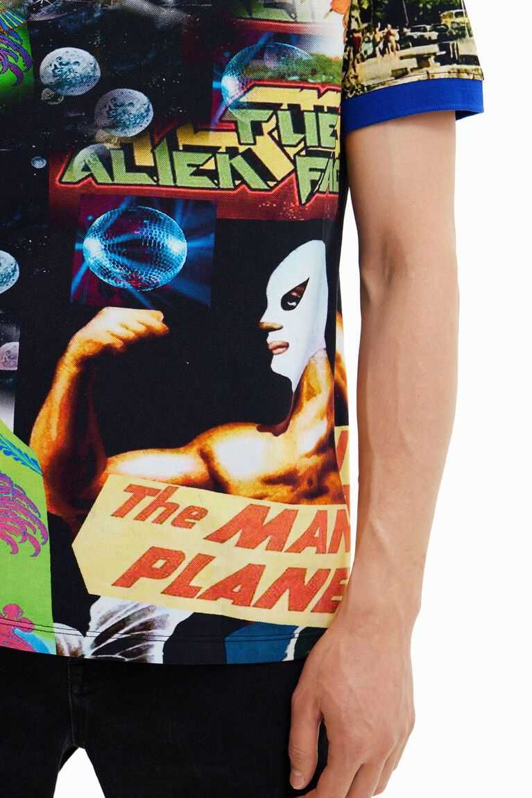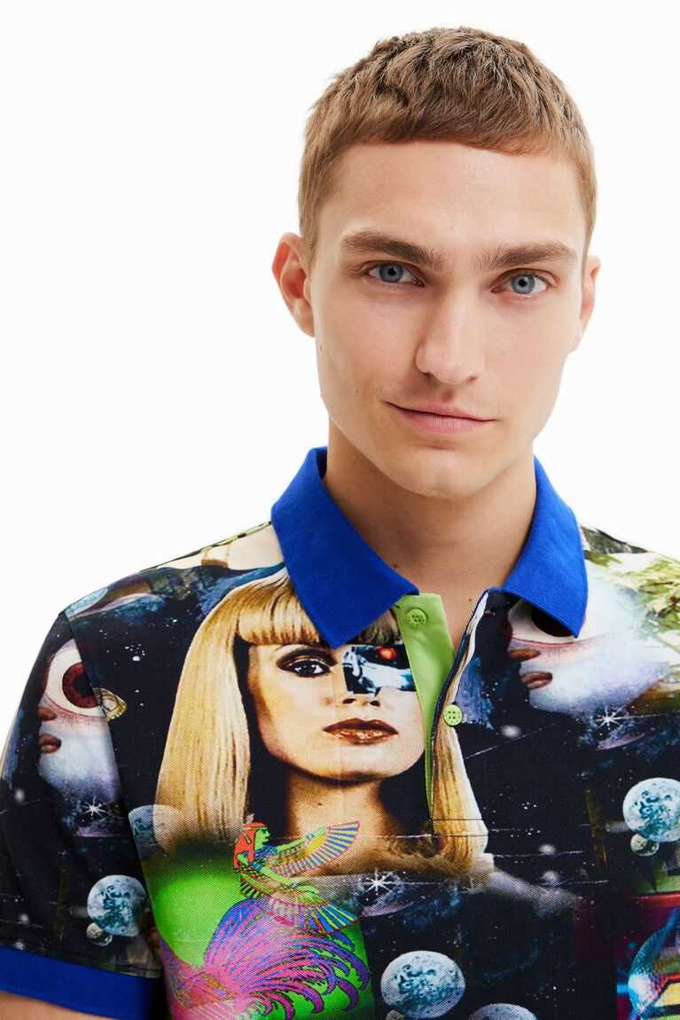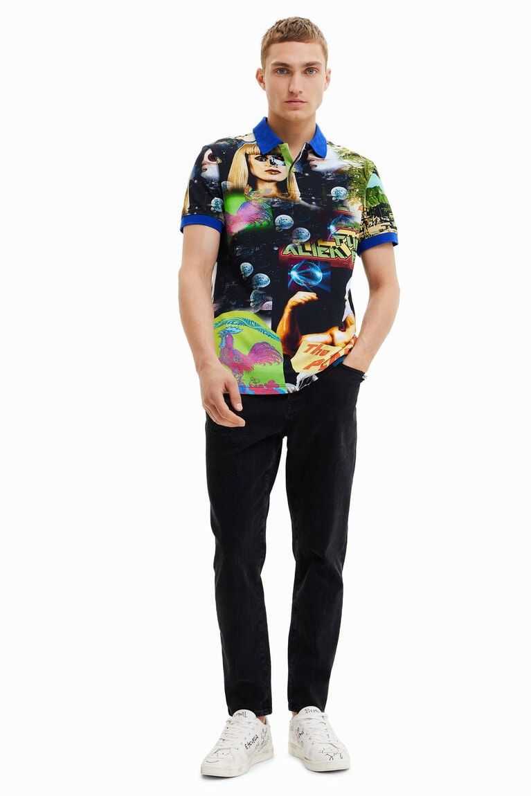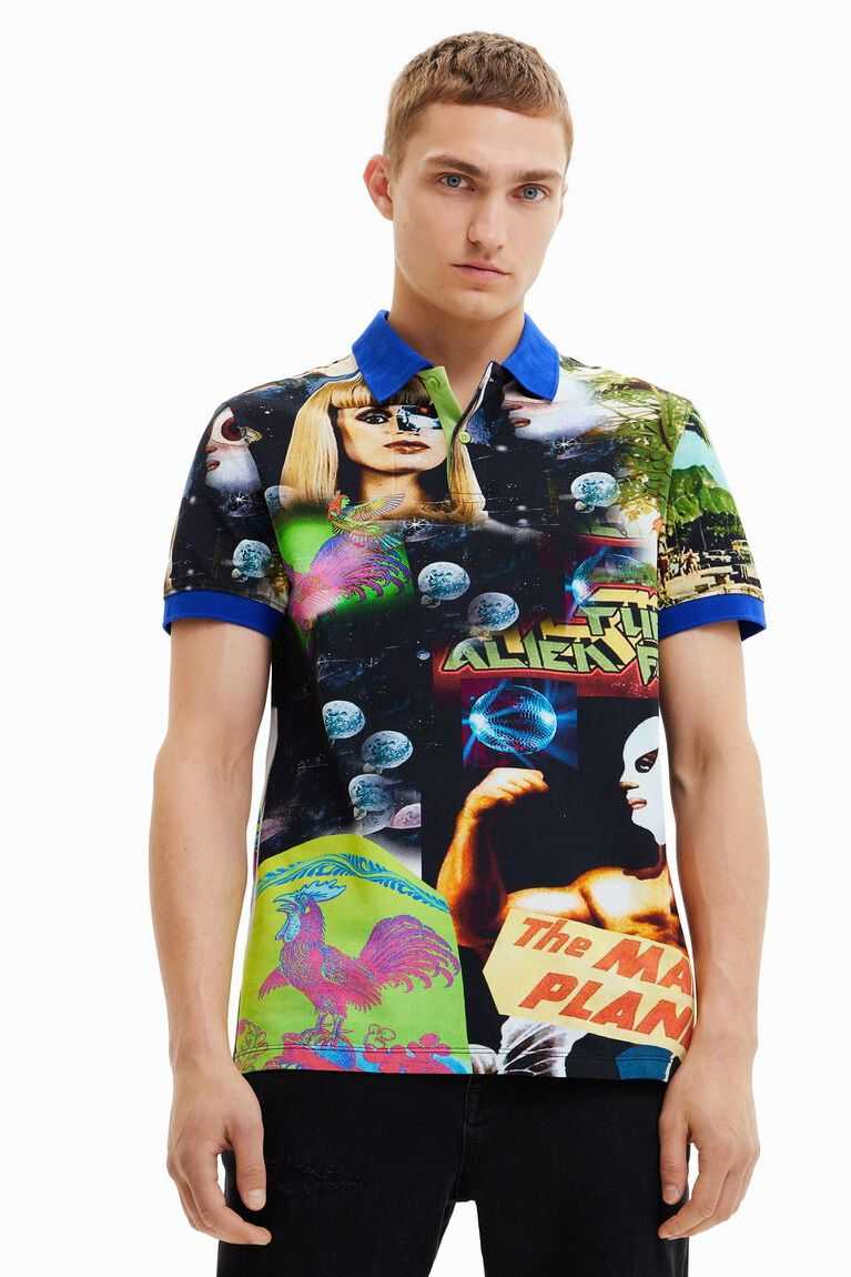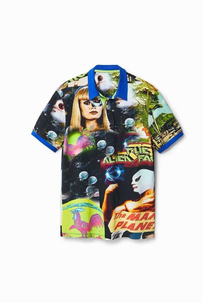 Cotton pique polo shirt with all-over print of a collage of aliens and TV covers with contrasting piping and collar.