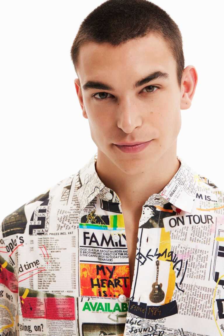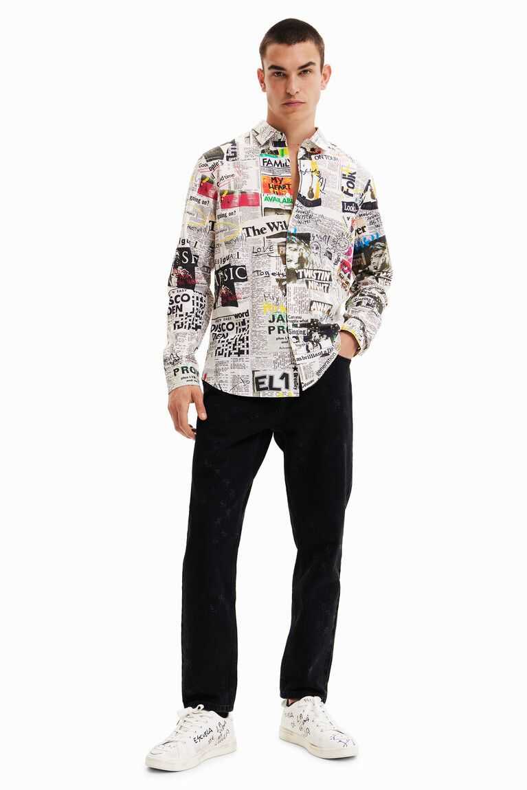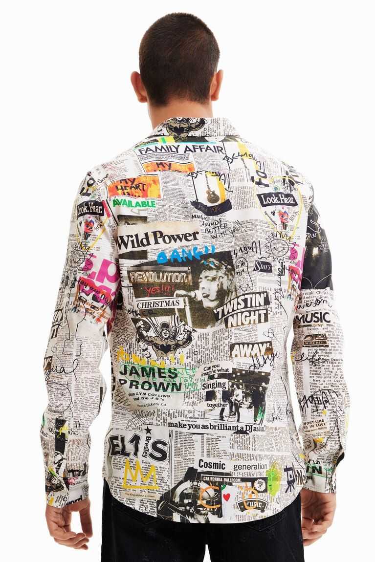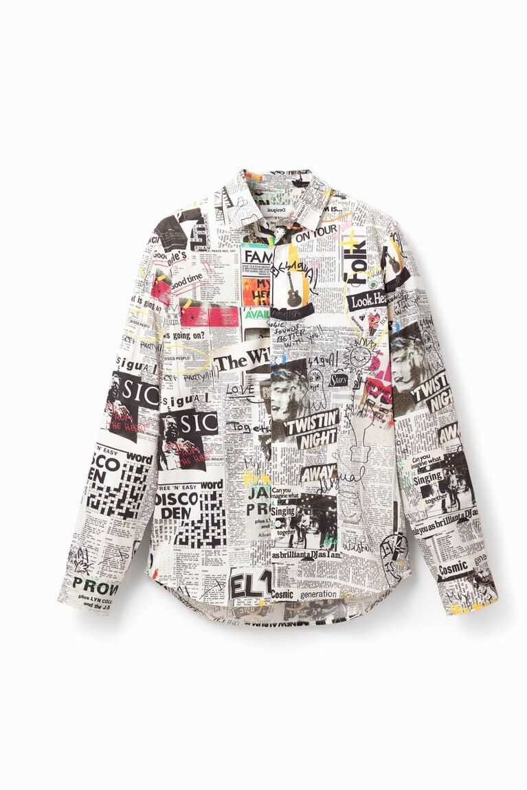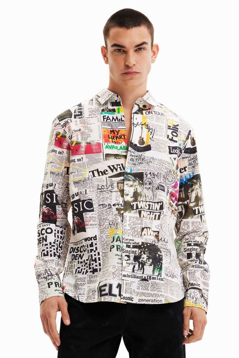 A long-sleeve, regular-fit shirt with a photographic collage-style print of music newspapers and arty details.