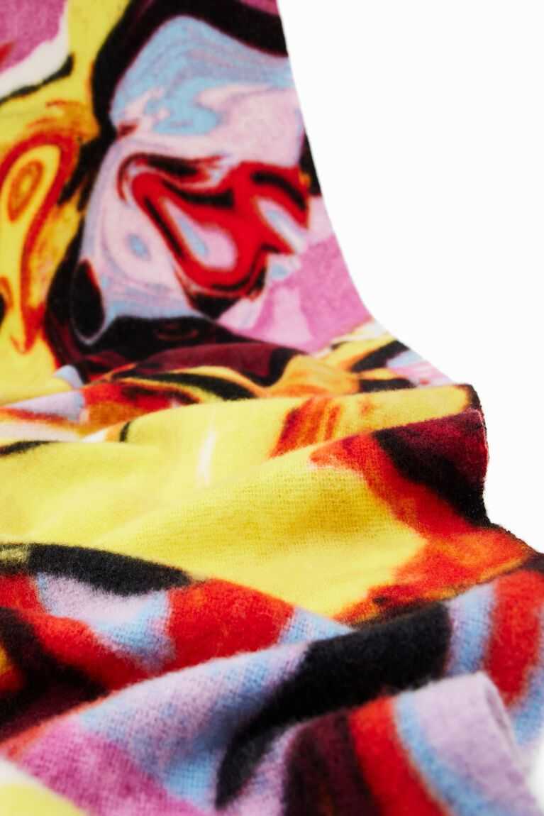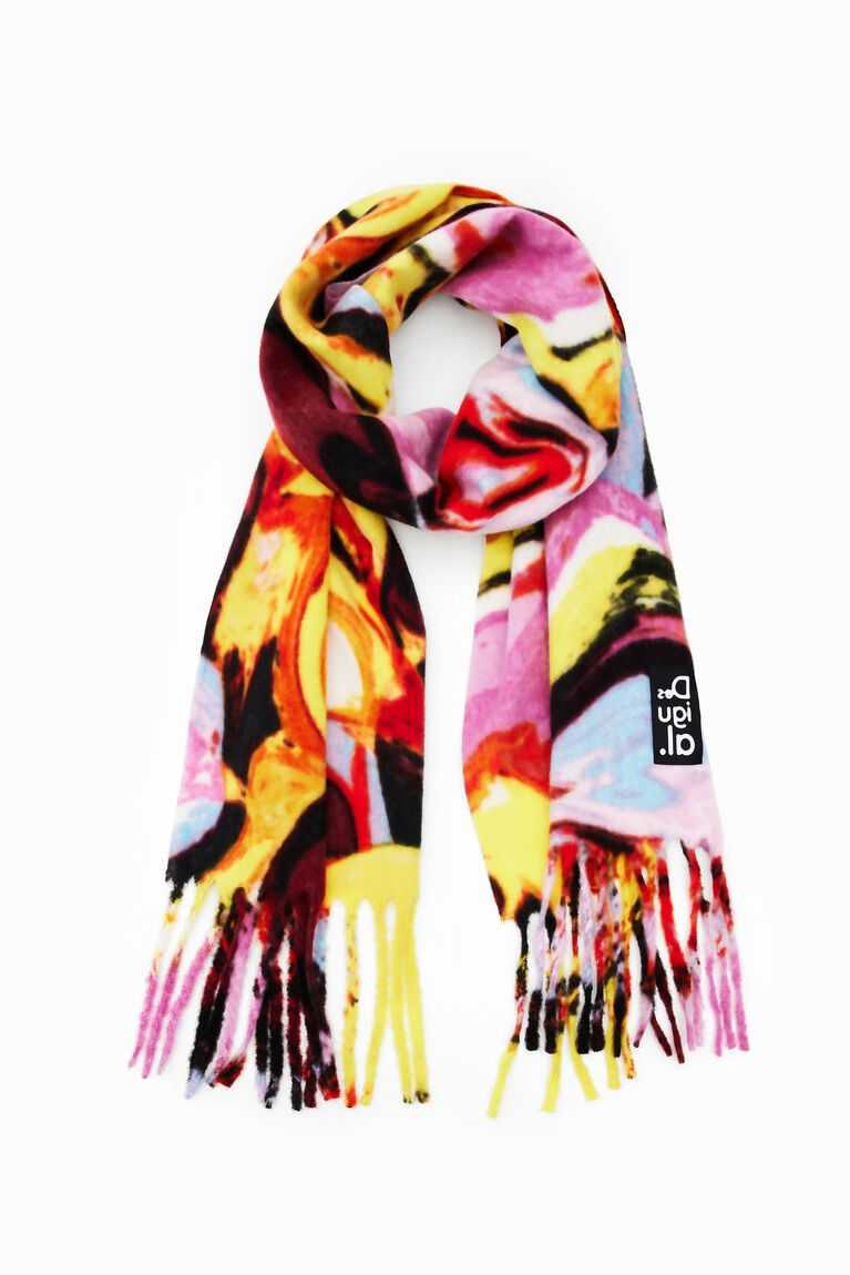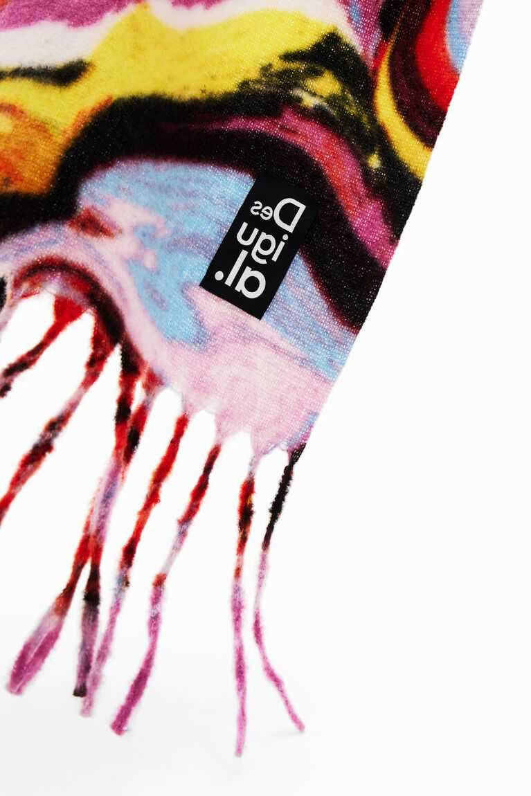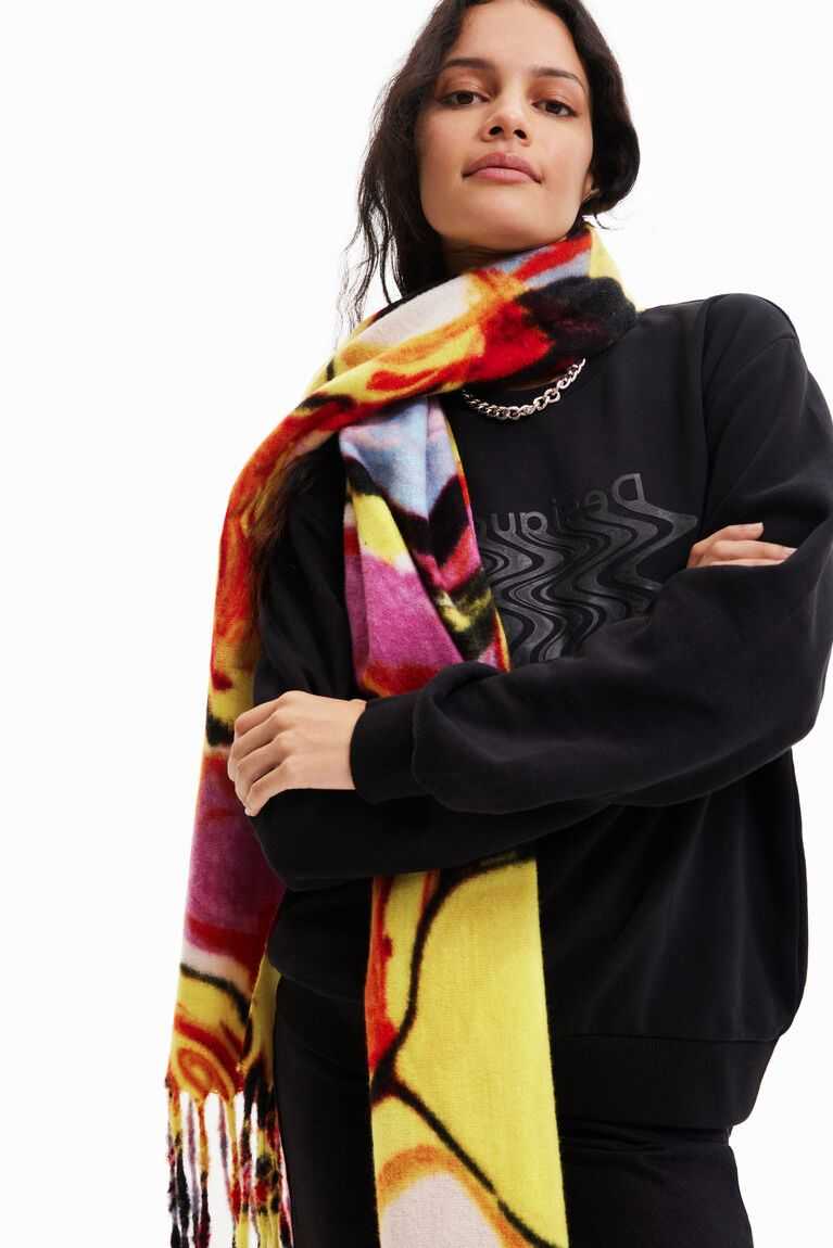 Long and wide scarf with a multicoloured digital print and fringed ends. Combine it with other garments and accessories from the collection.