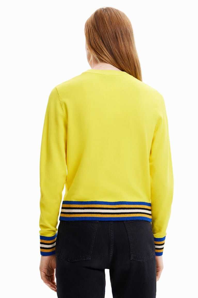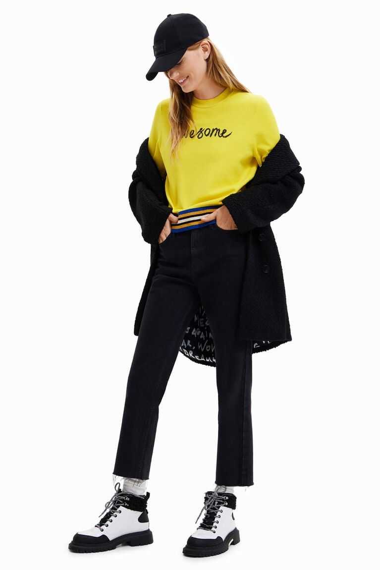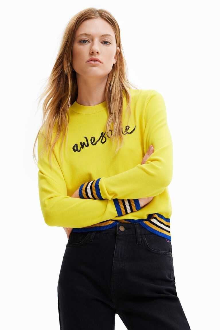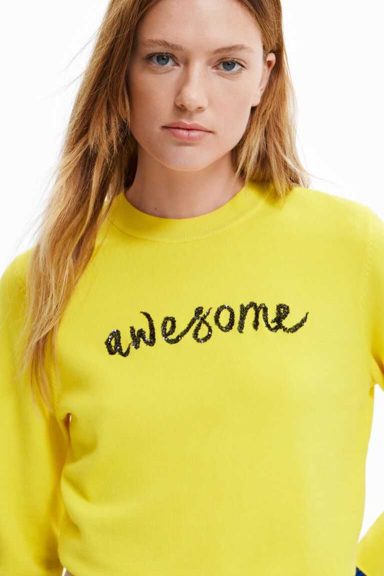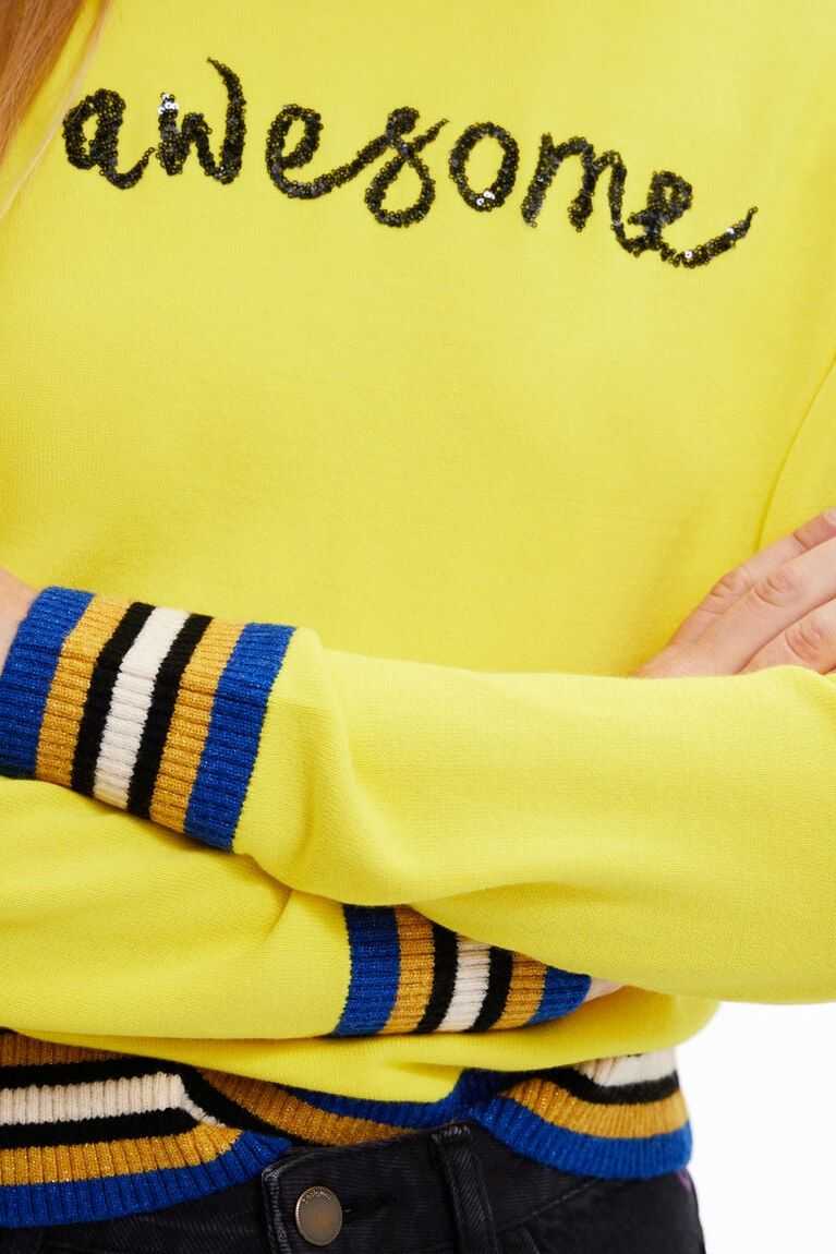 A fine crewneck jumper with sequin embroidery and "Awesome" on the front. Features elasticated cuffs and hem with a striped print.