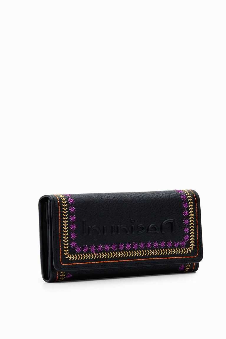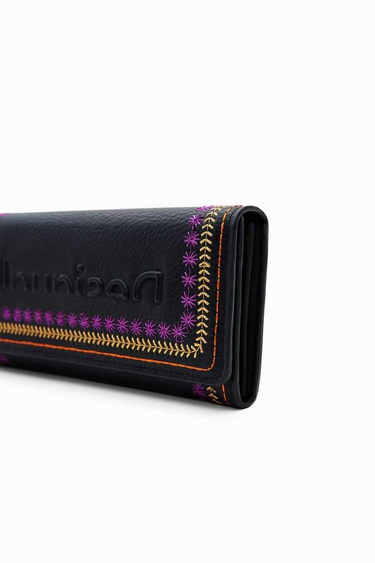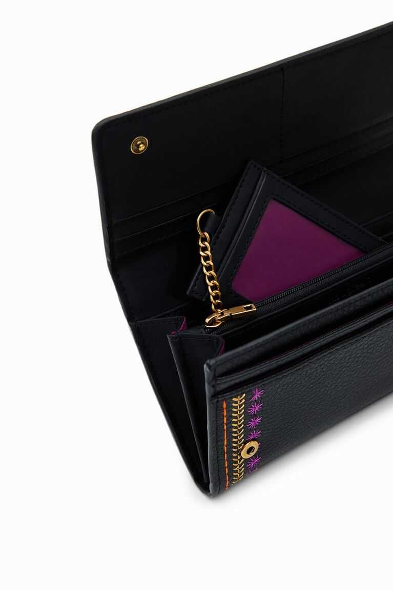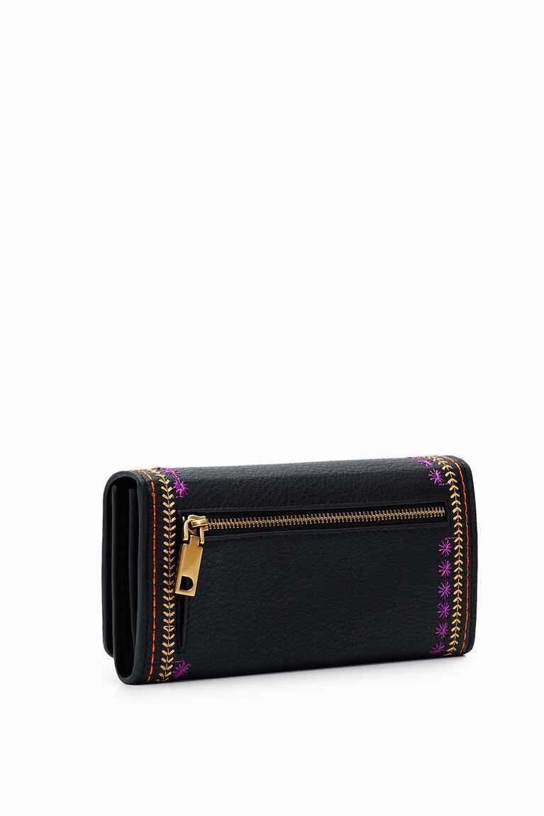 A large-capacity long wallet with a flap and coloured backstitching on the sides. Very versatile and lightweight with multiple pockets and compartments.
