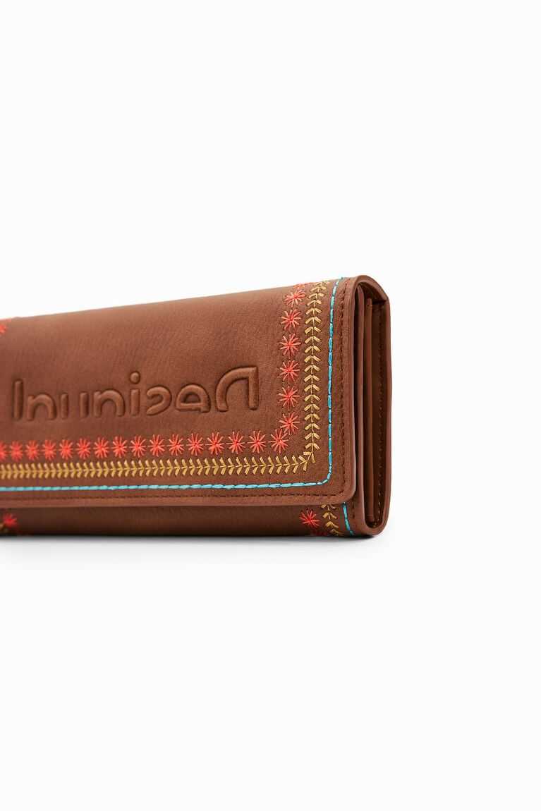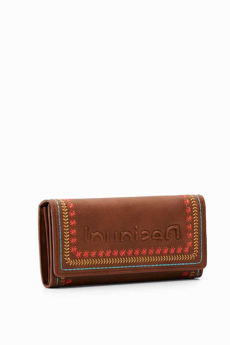 A large-capacity long wallet with a flap and coloured backstitching on the sides. Very versatile and lightweight with multiple pockets and compartments.