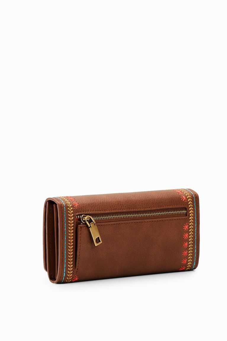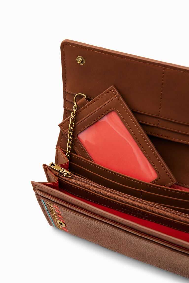 A large-capacity long wallet with a flap and coloured backstitching on the sides. Very versatile and lightweight with multiple pockets and compartments.