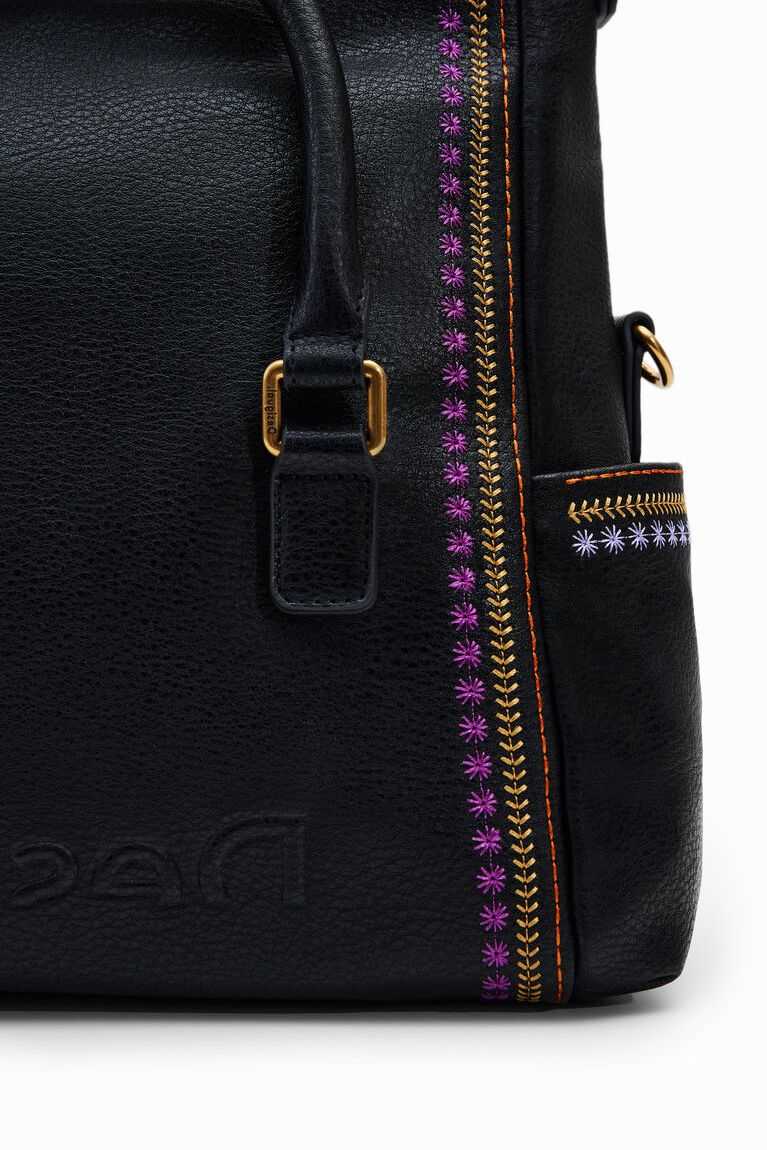 A faux-leather handbag with colourful backstitching on the sides. Features a flap and magnet closure and a large capacity. Remarkably soft and light.