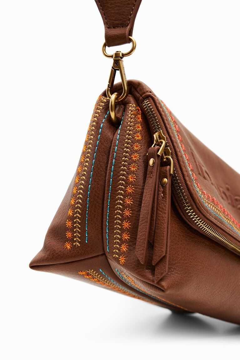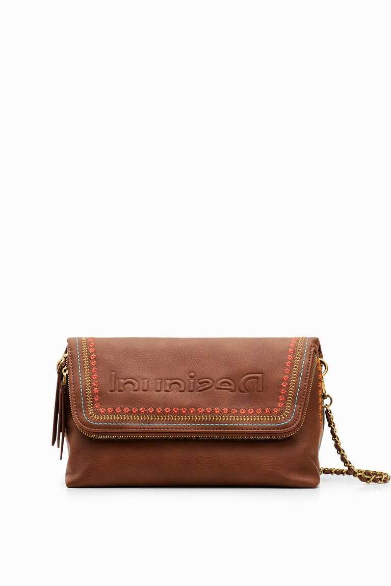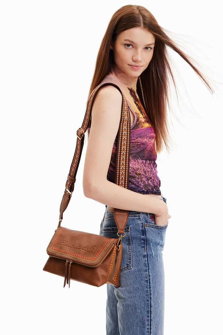 A faux-leather crossbody bag with colourful backstitching on the sides. Features a flap and magnet closure and a large capacity. Remarkably soft and light.