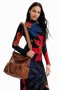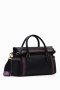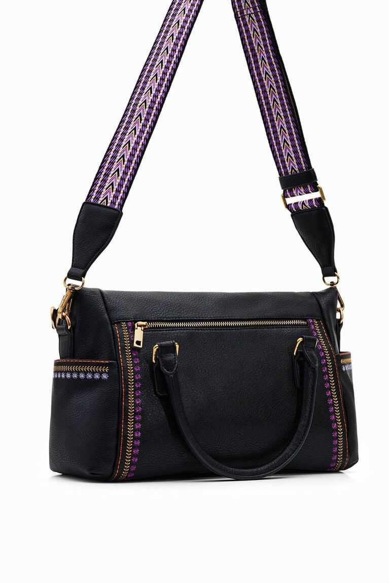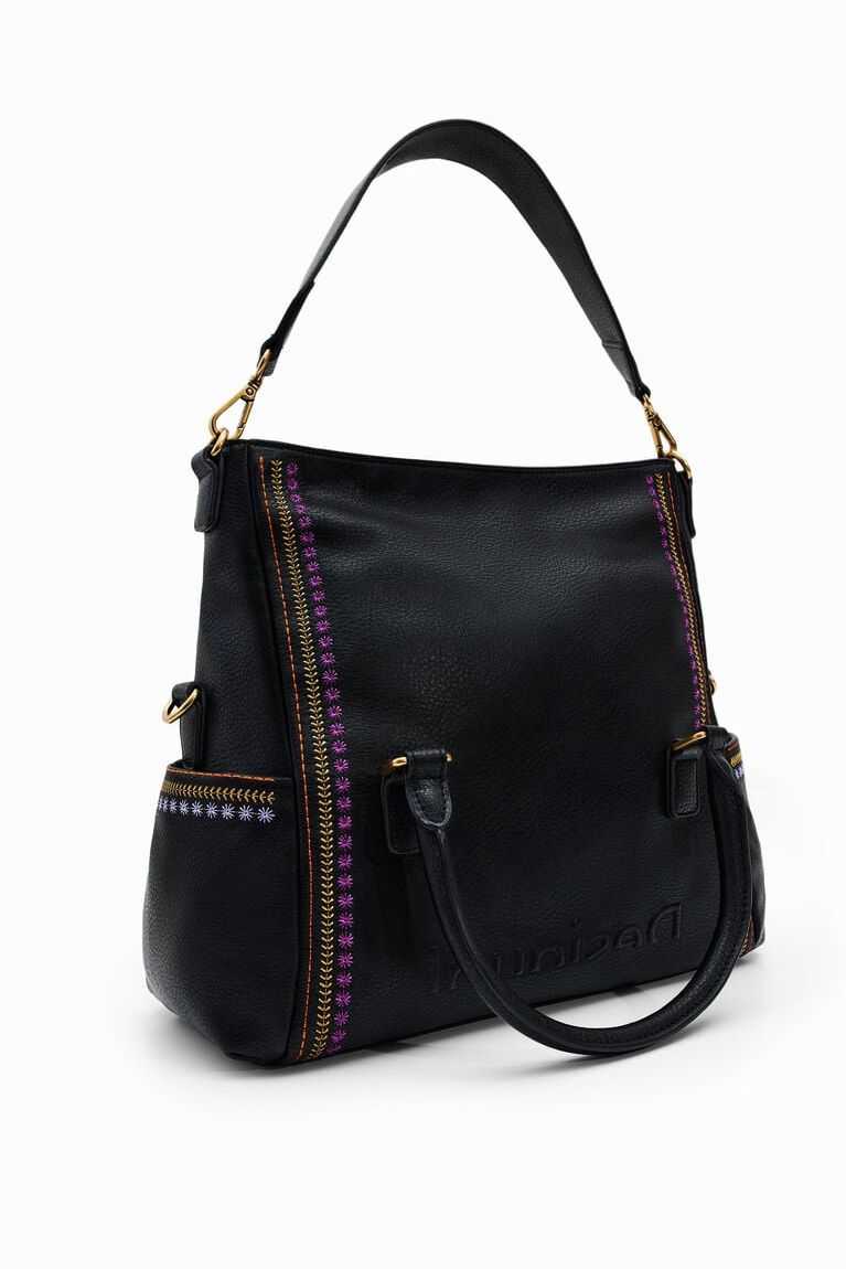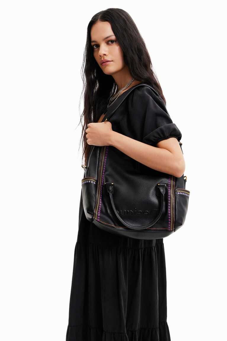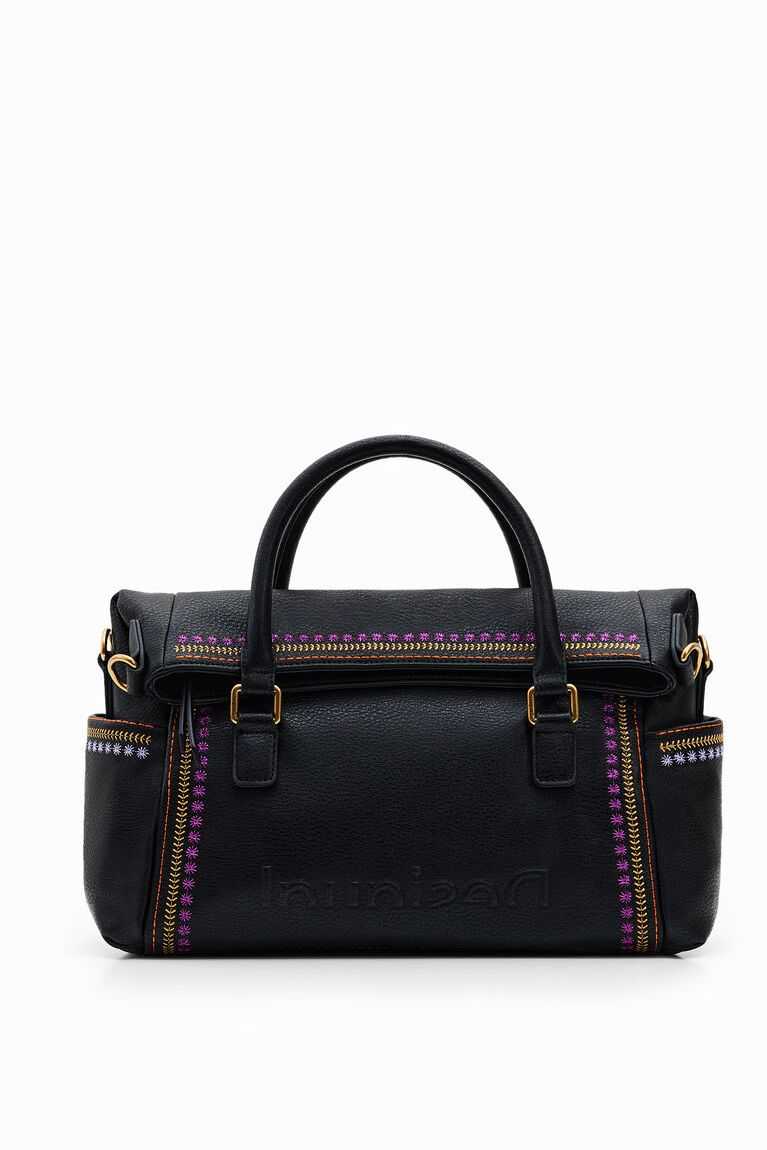 A faux-leather handbag with colourful backstitching on the sides. Features a flap and magnet closure and a large capacity. Remarkably soft and light.