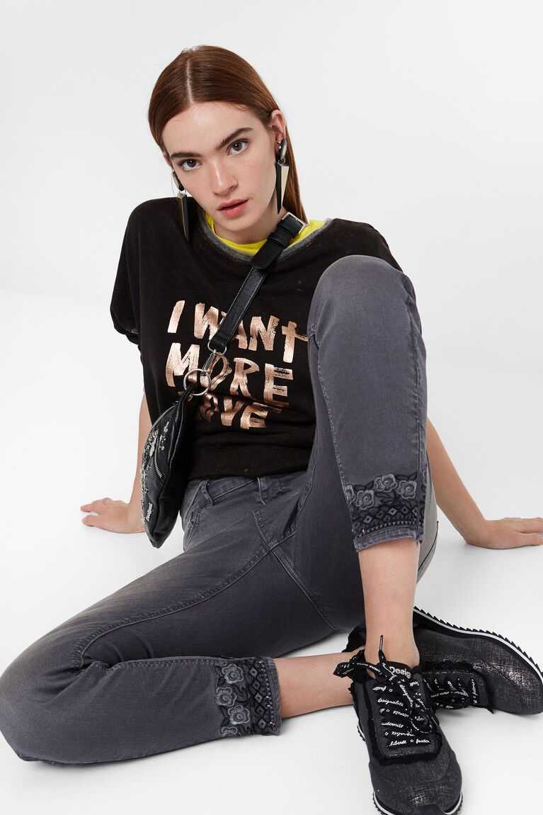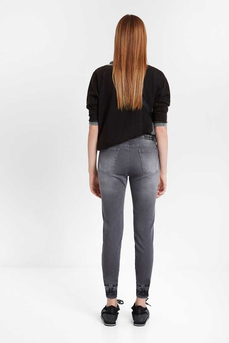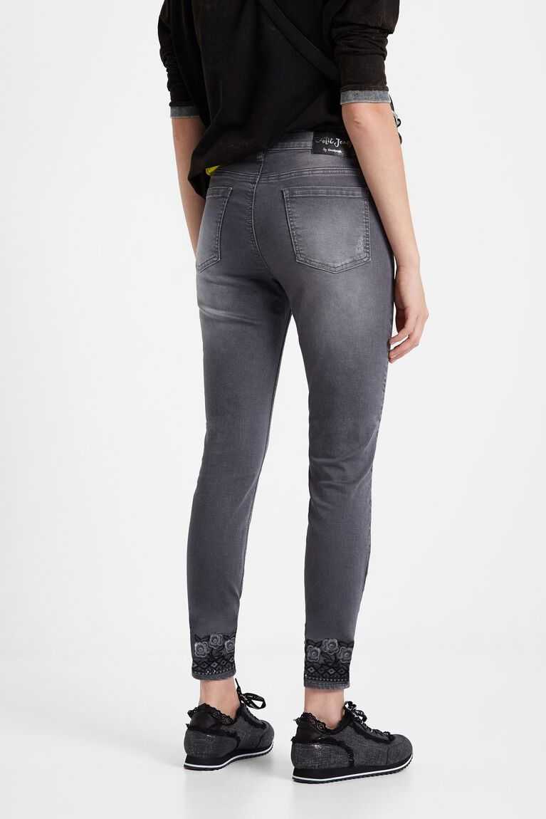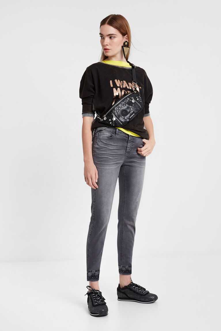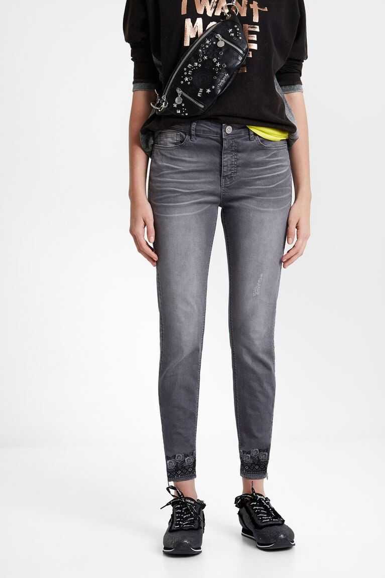 A little boho touch can completely change such a classic garment as denim trousers. This is the case of these skinny worn jeans with floral embroideries and borders of sequins on the zipper-adjusted ankle hem.