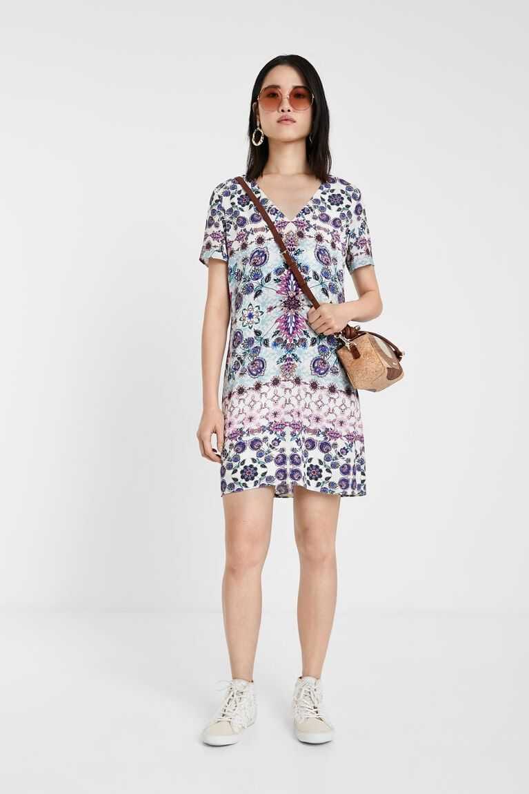 Bet on the boho style for this season. A very cool trend with which you'll get an ideal look. With this dress in form of long T-shirt with short sleeves, and its floral and galactic-inspired boho prints you'll cause a sensation while feeling comfortable at all times.