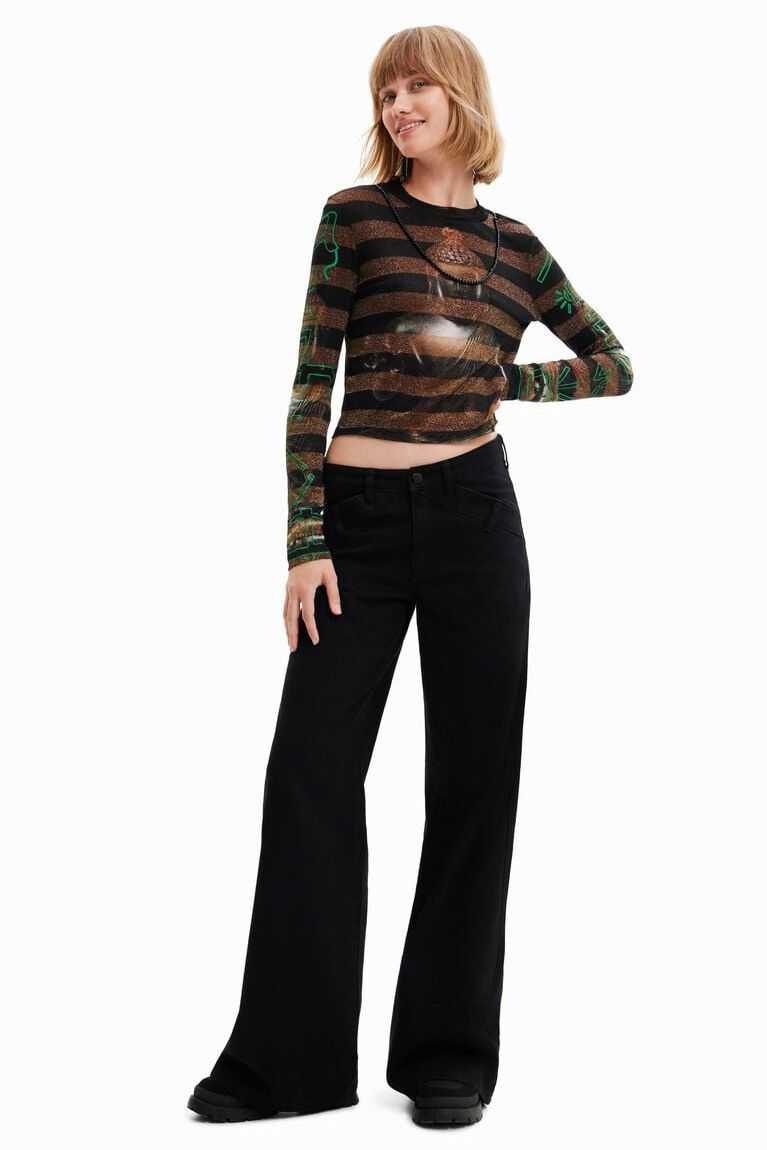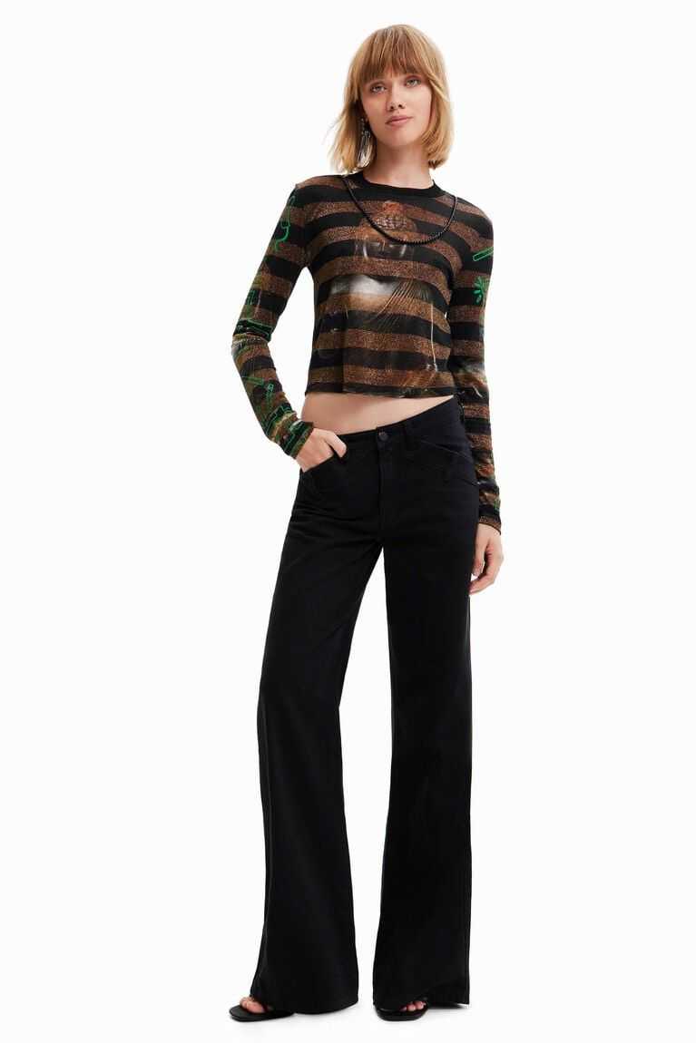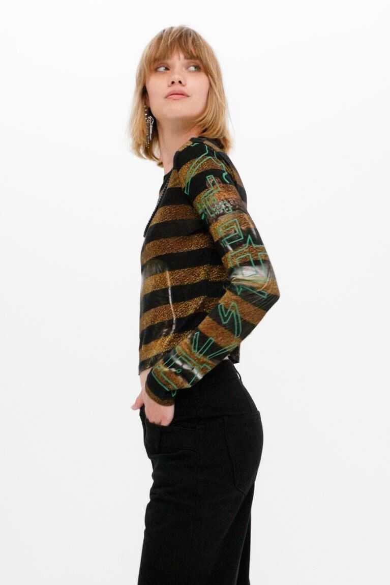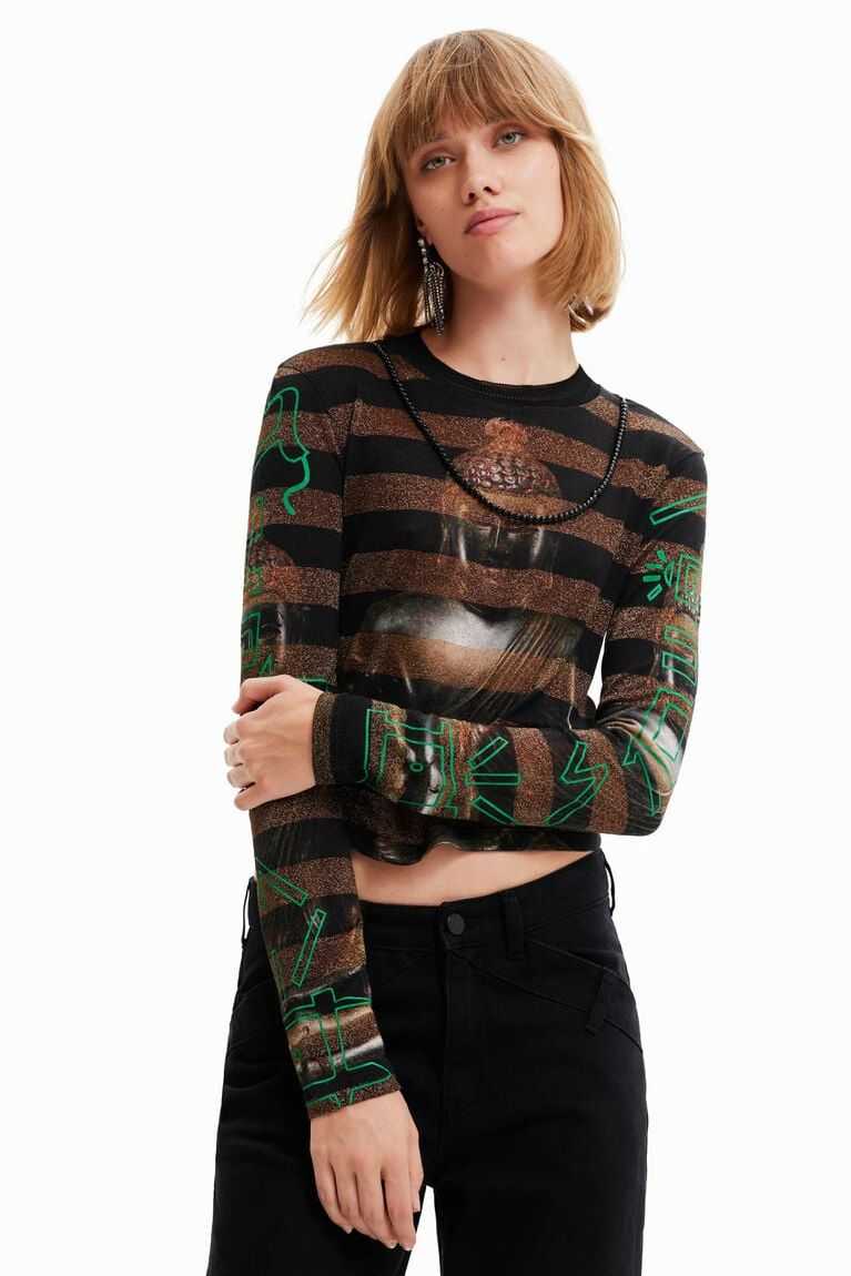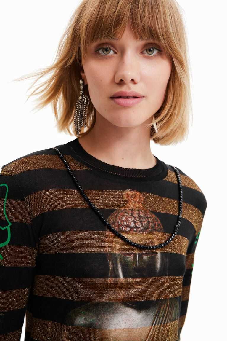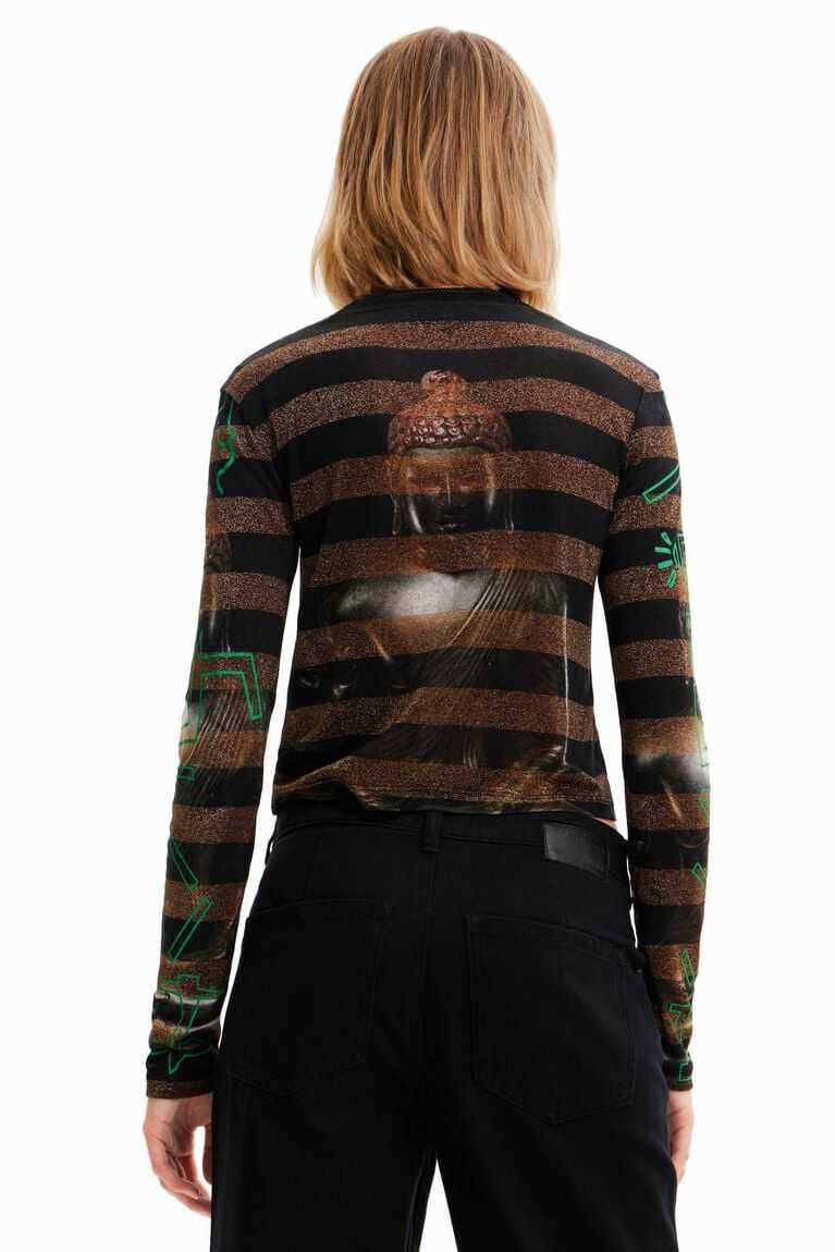 Eastern inspiration decorates this long-sleeve striped T-shirt with a digital Buddha print on the chest and back. With a beaded necklace incorporated into the design.