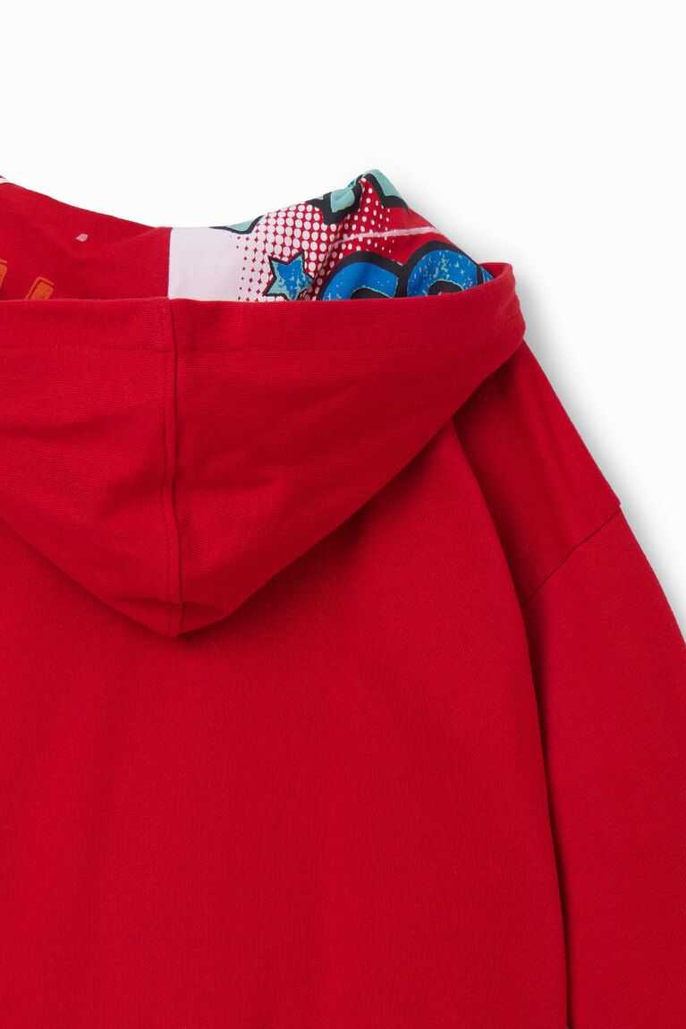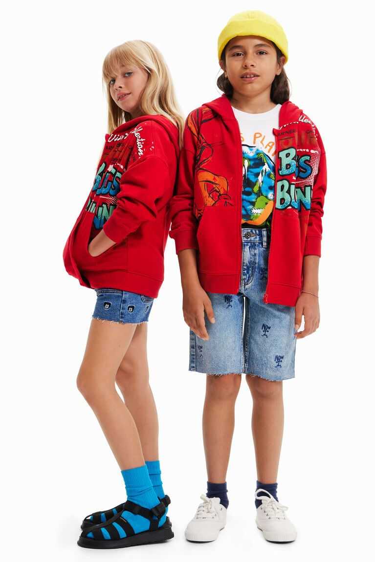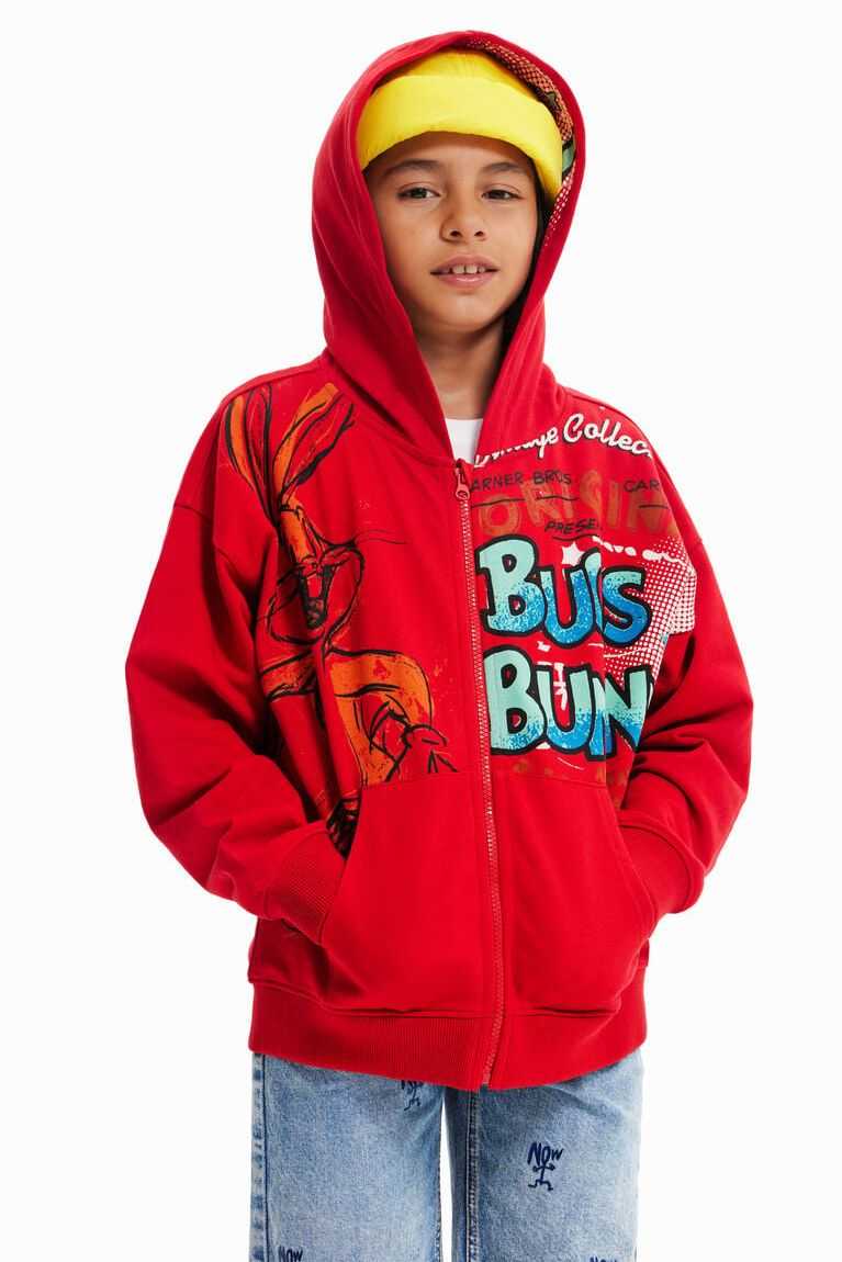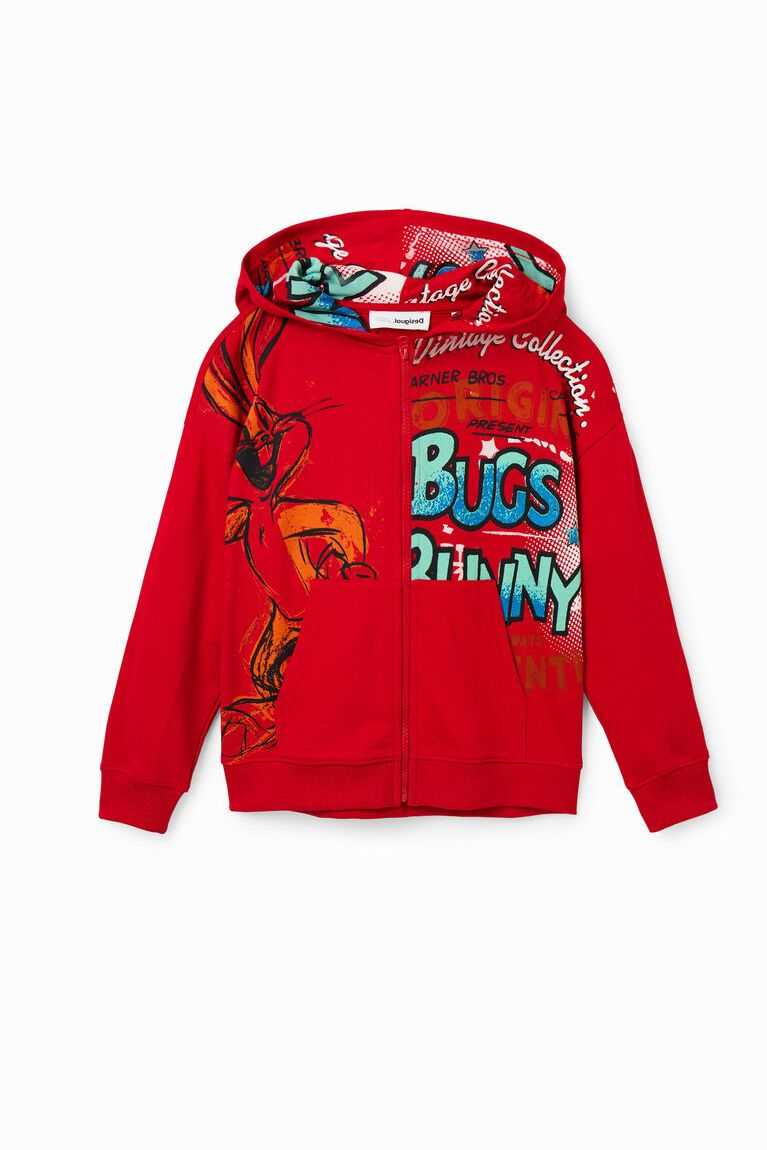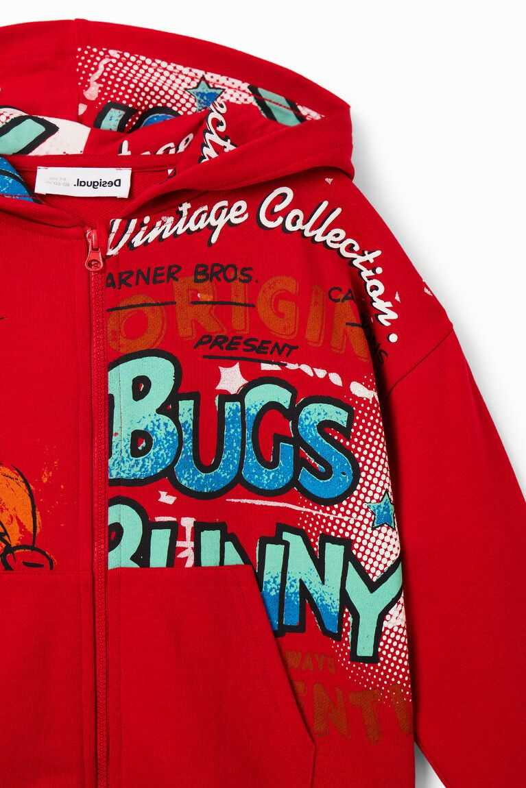 A zip-up hoodie with a print of Bugs Bunny illustrations in a distressed effect.