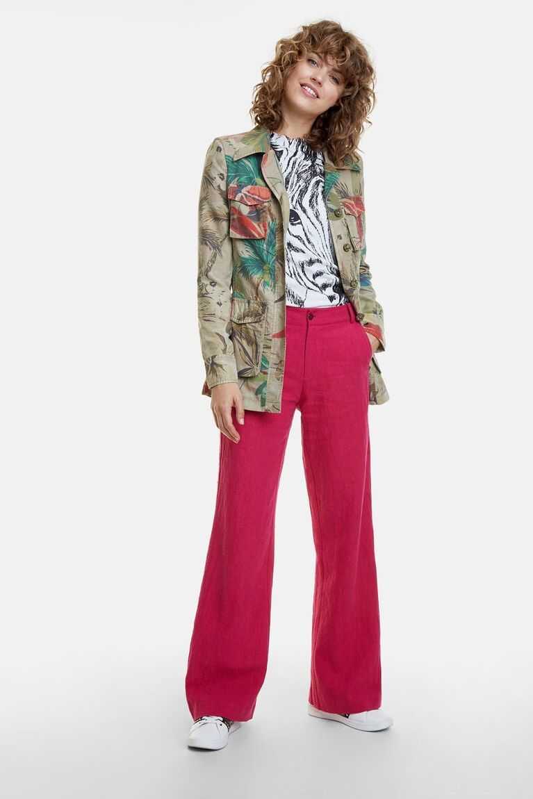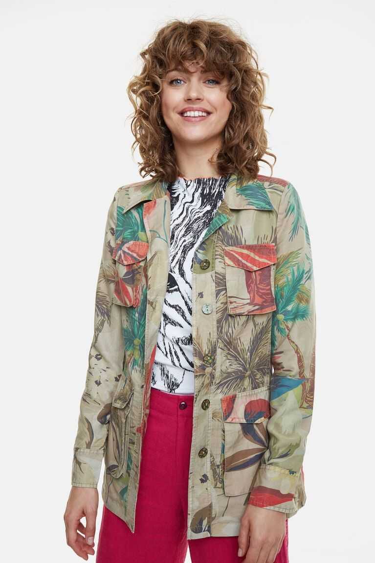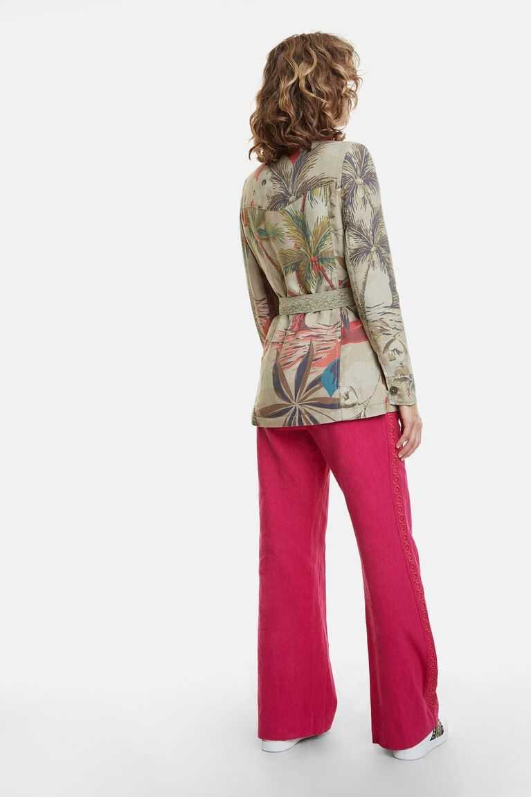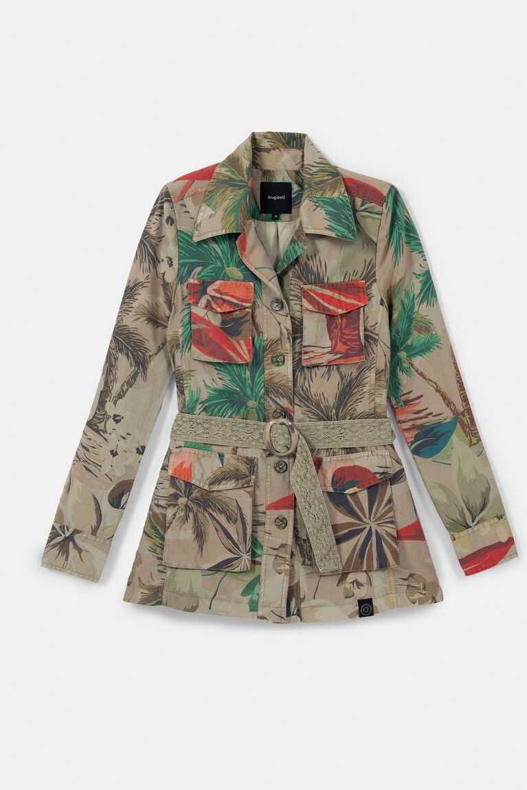 Saharan jackets are one of those between-season garments that are always easy to combine. And if they have a floral print with beach palm trees in beige, like those on this jacket, even more so. Their multiple pockets and the belt give their silhouette a unique touch. Made in Tencel fabric, an eco-friendly fibre with a soft touch and great drape. This comfortable fabric adapts to the skin temperature, and transforms the garment into a jacket that is perfect for the entire season, being cool in summer.