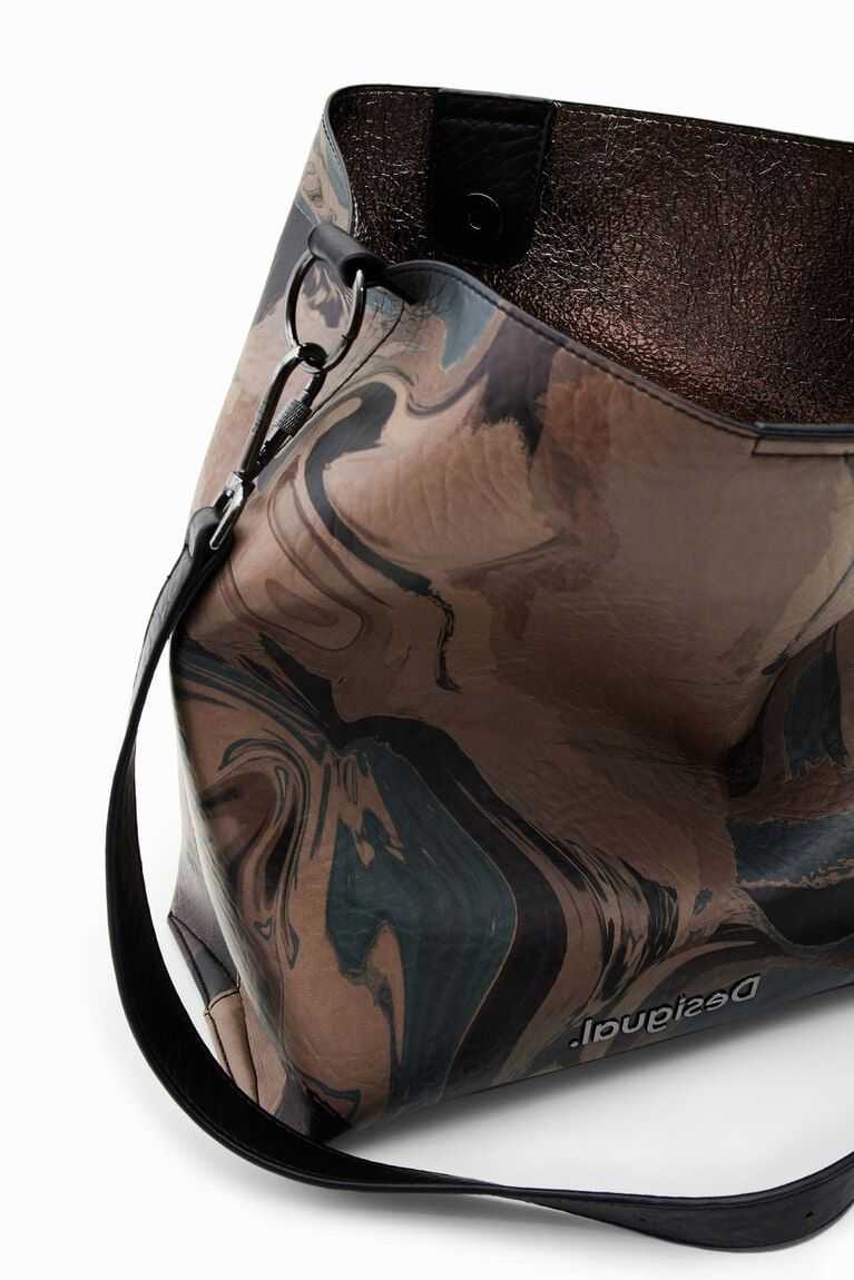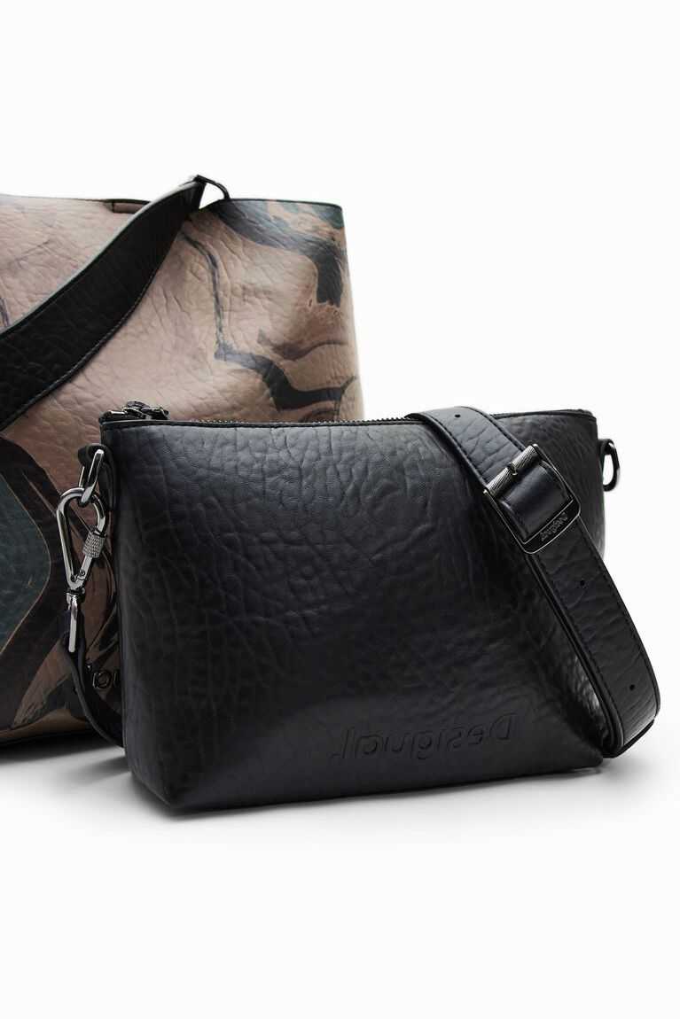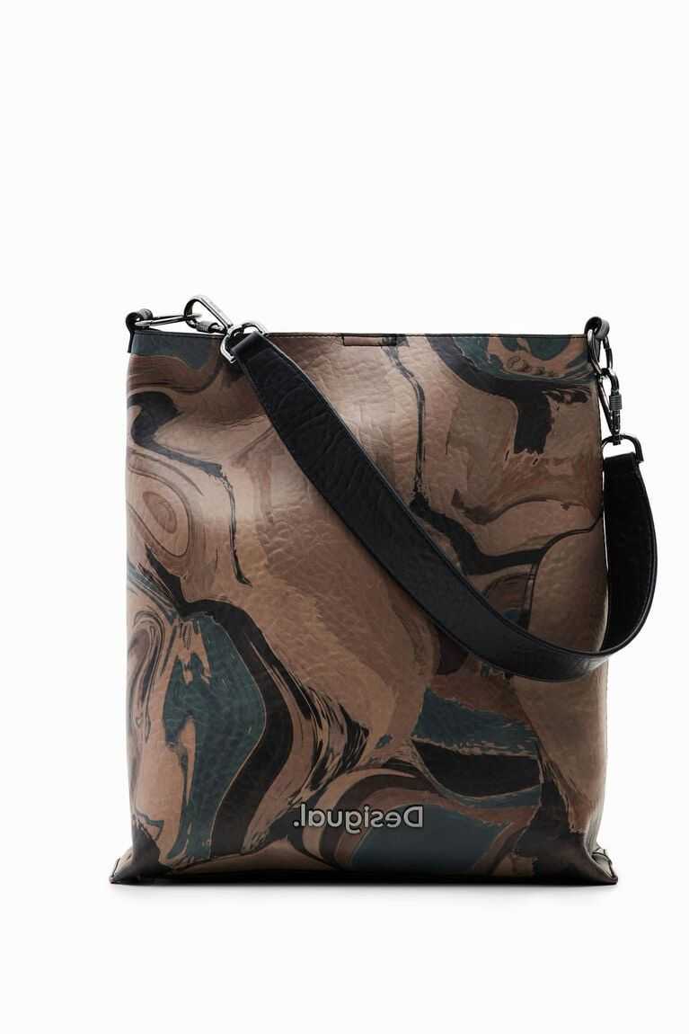 A large-capacity handbag made from faux leather with a camouflage effect in military green tones. Includes a toiletry bag and multiple straps for more versatility.