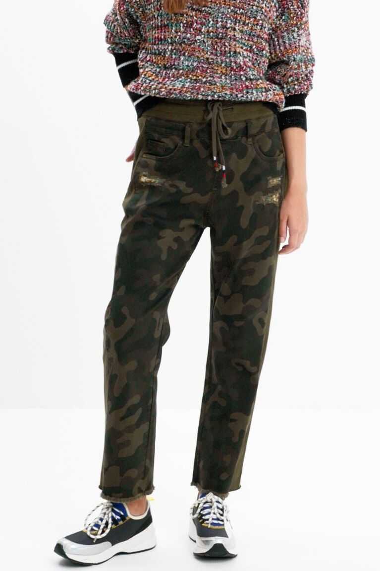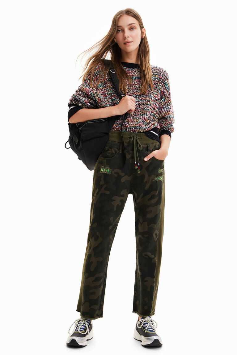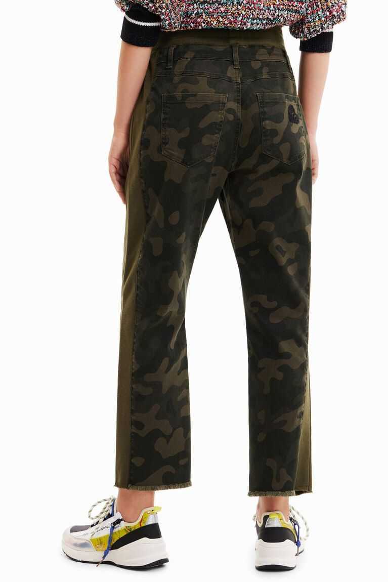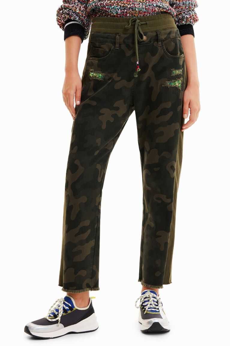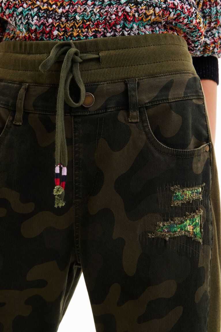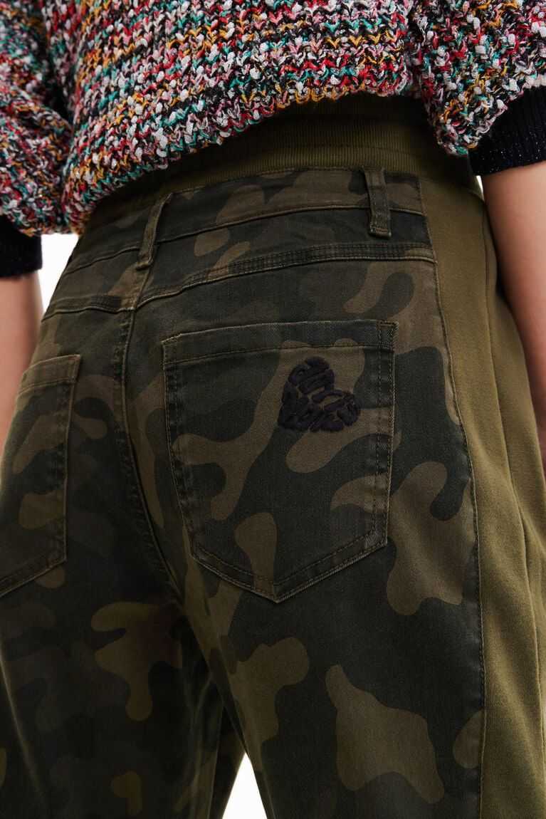 These hybrid jogger trousers in plush with camouflage-print panels feature distressed details that reveal a floral-print fabric.