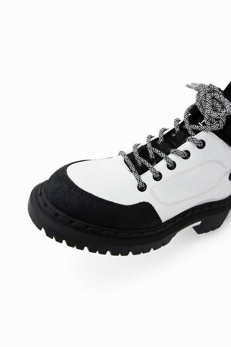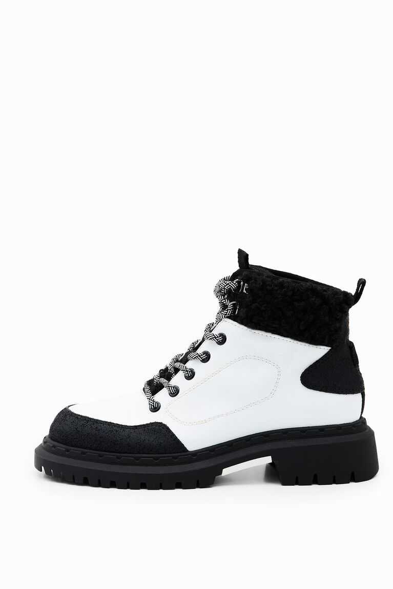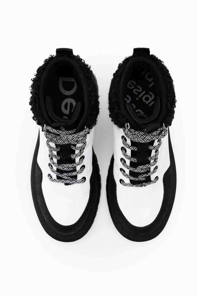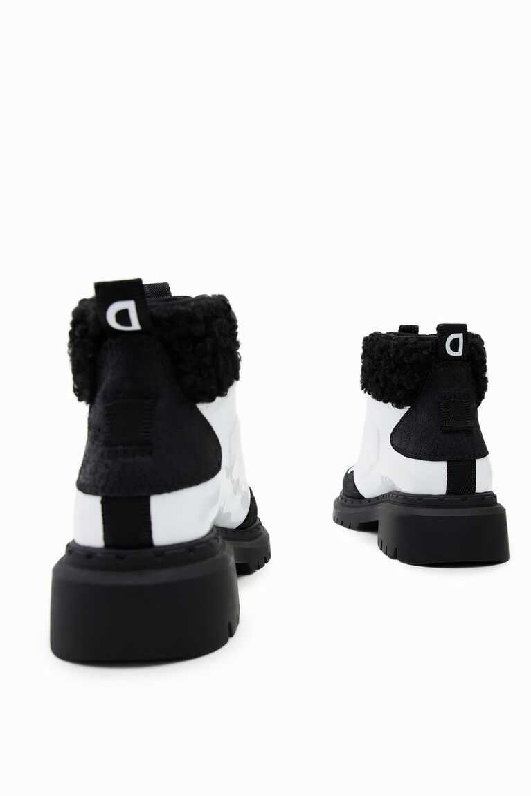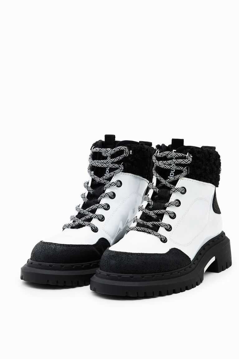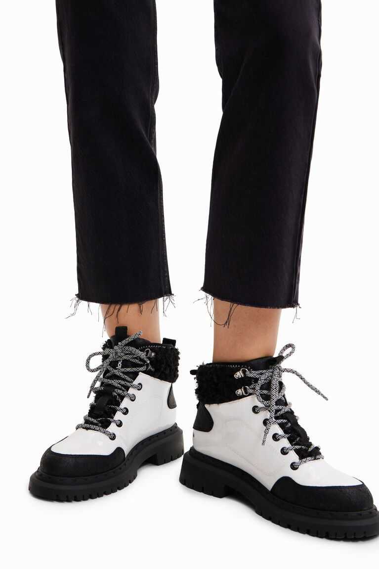Sustainable trekking boots in a combination of colours. Made from patent leather with fur details on the ankle. Featuring two-tone trekking laces and black recycled rubber soles.