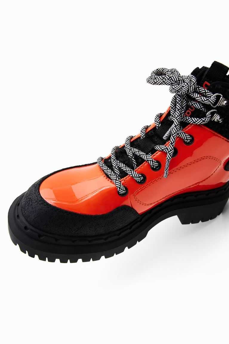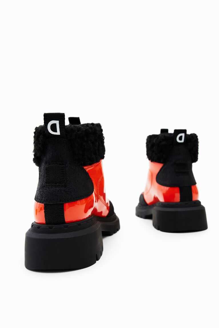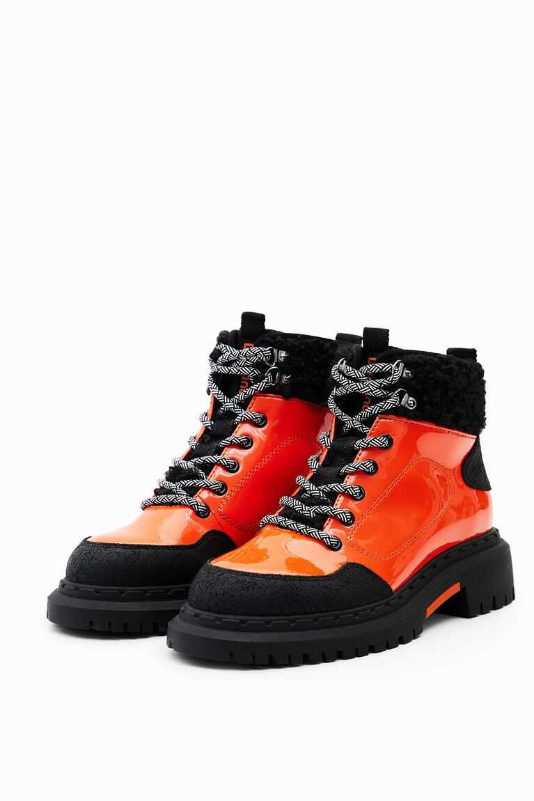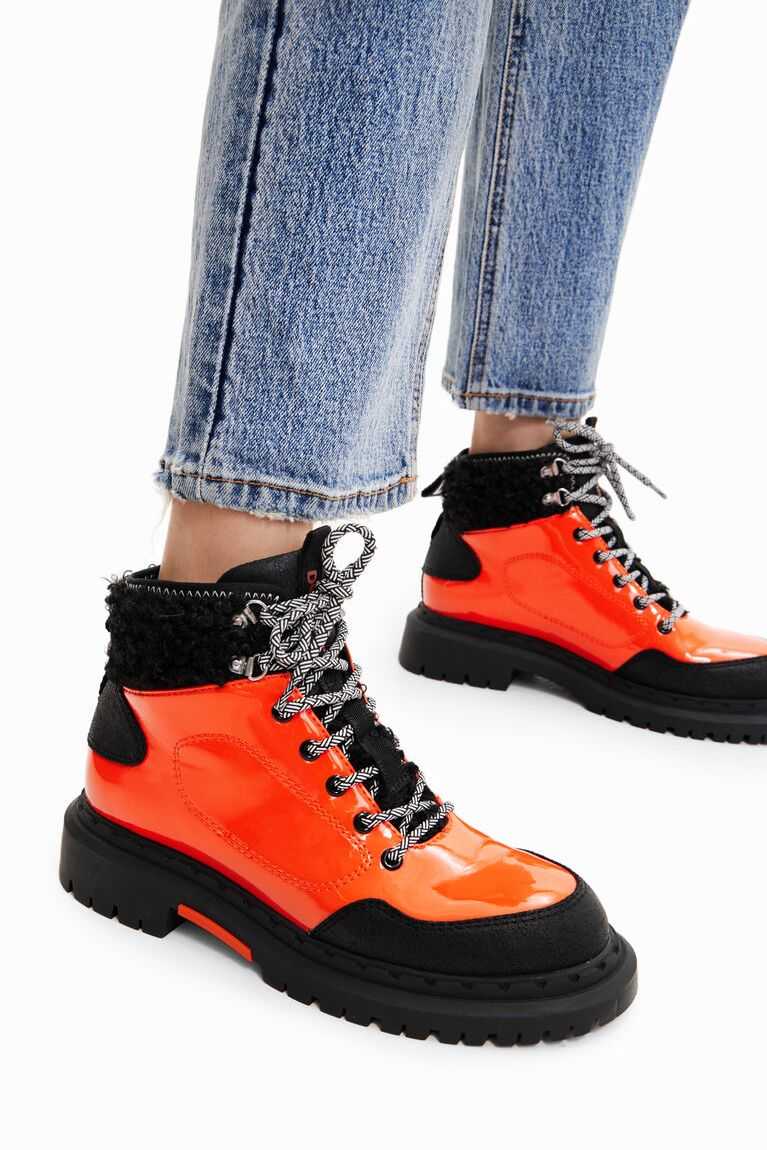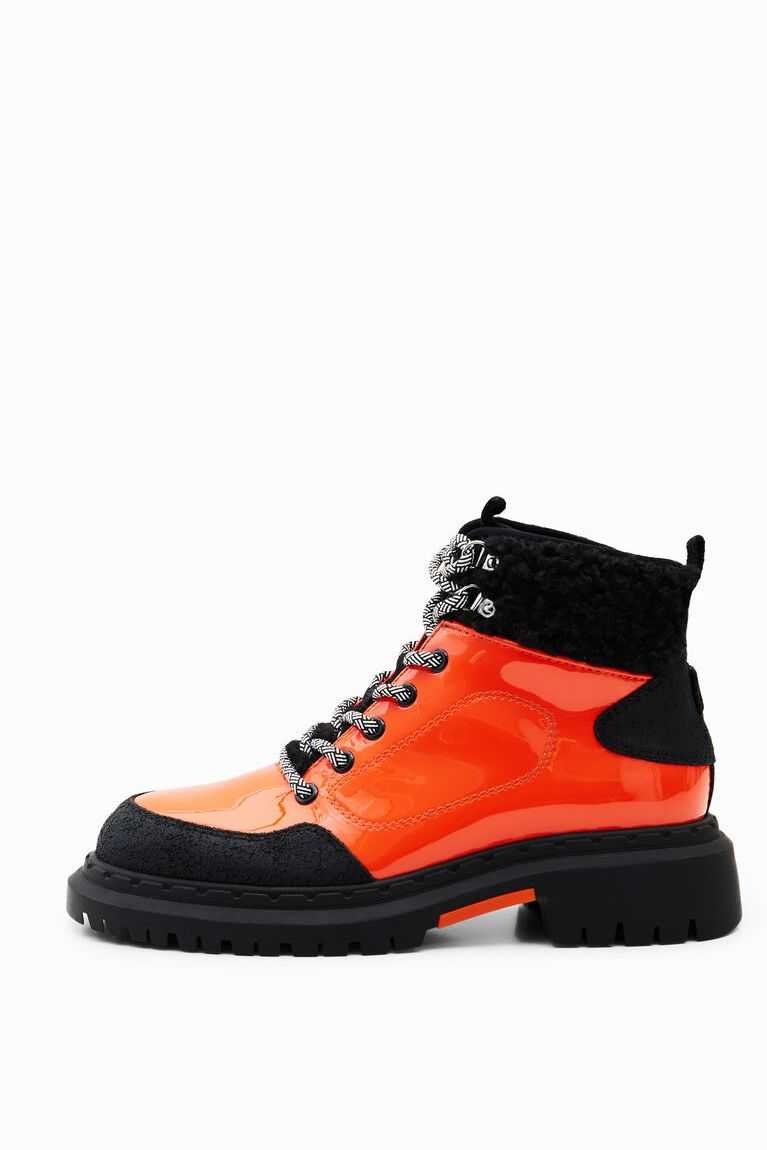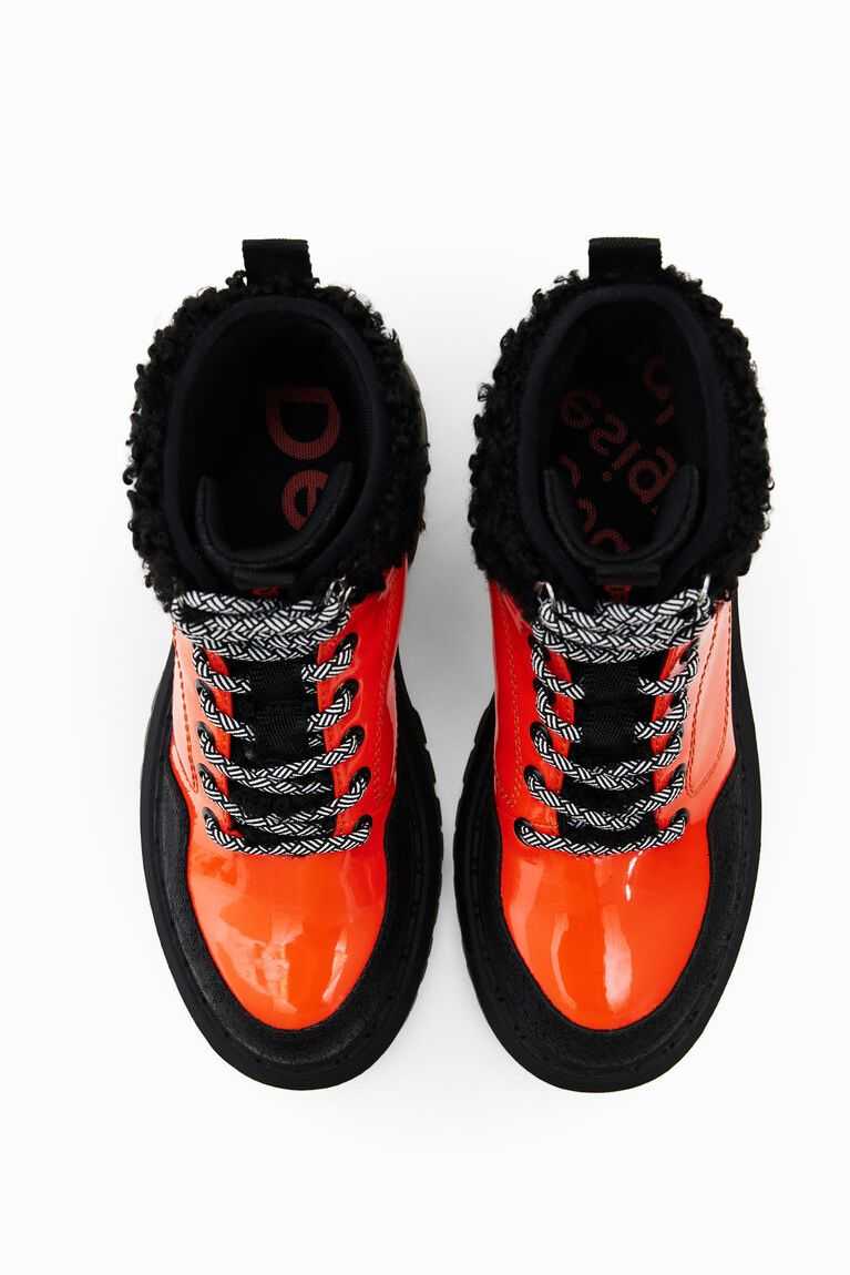Sustainable trekking boots in a combination of colours. Made from patent leather with fur details on the ankle. Featuring two-tone trekking laces and black recycled rubber soles.