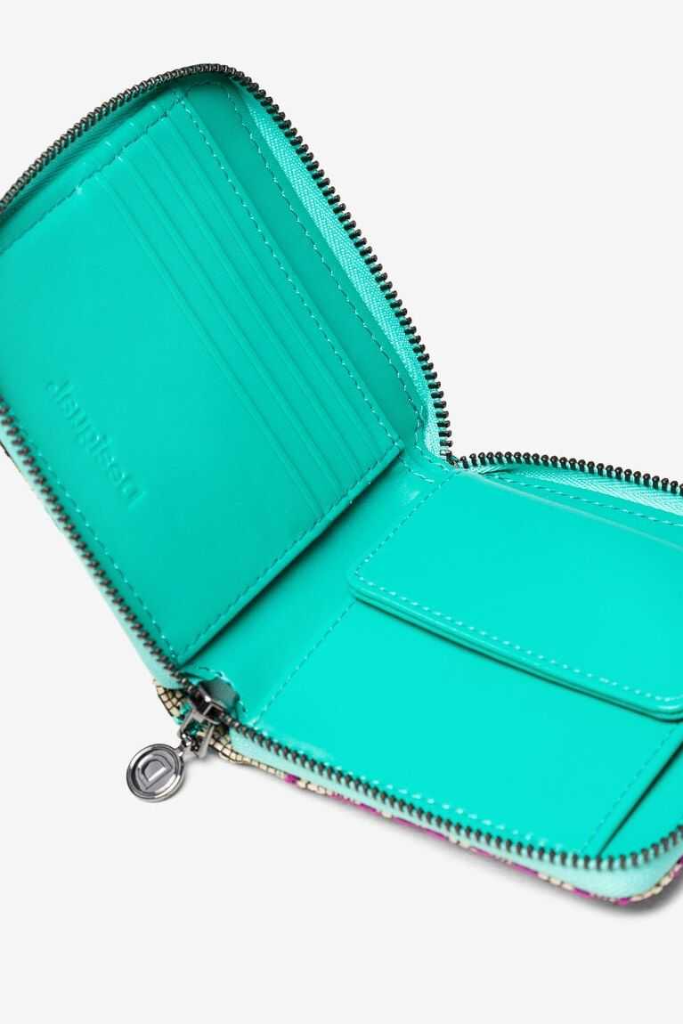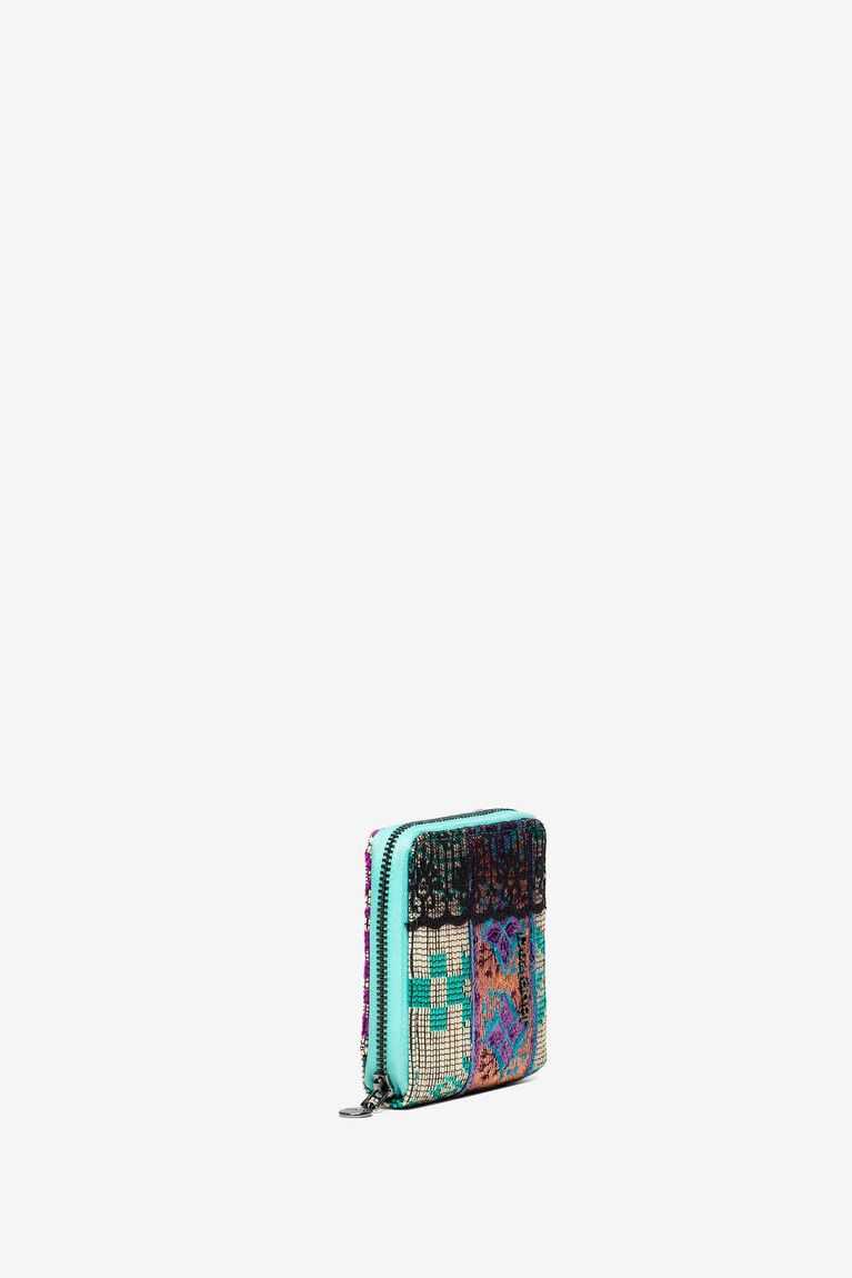 Small square coin wallet with patch print of fabrics and textures in raffia, animal print and lace, and turquoise interior. New Desigual Accessories SS20 collection. Free delivery and returns.
