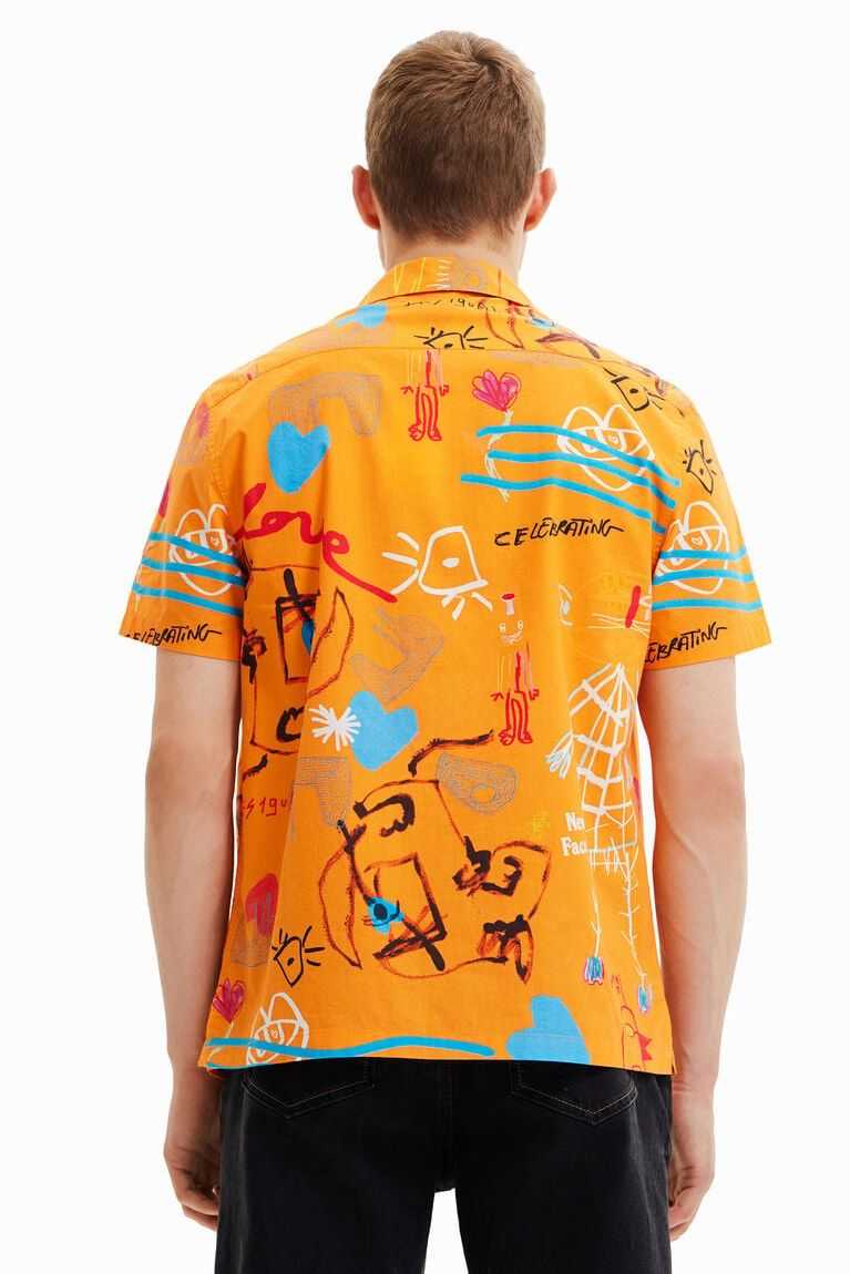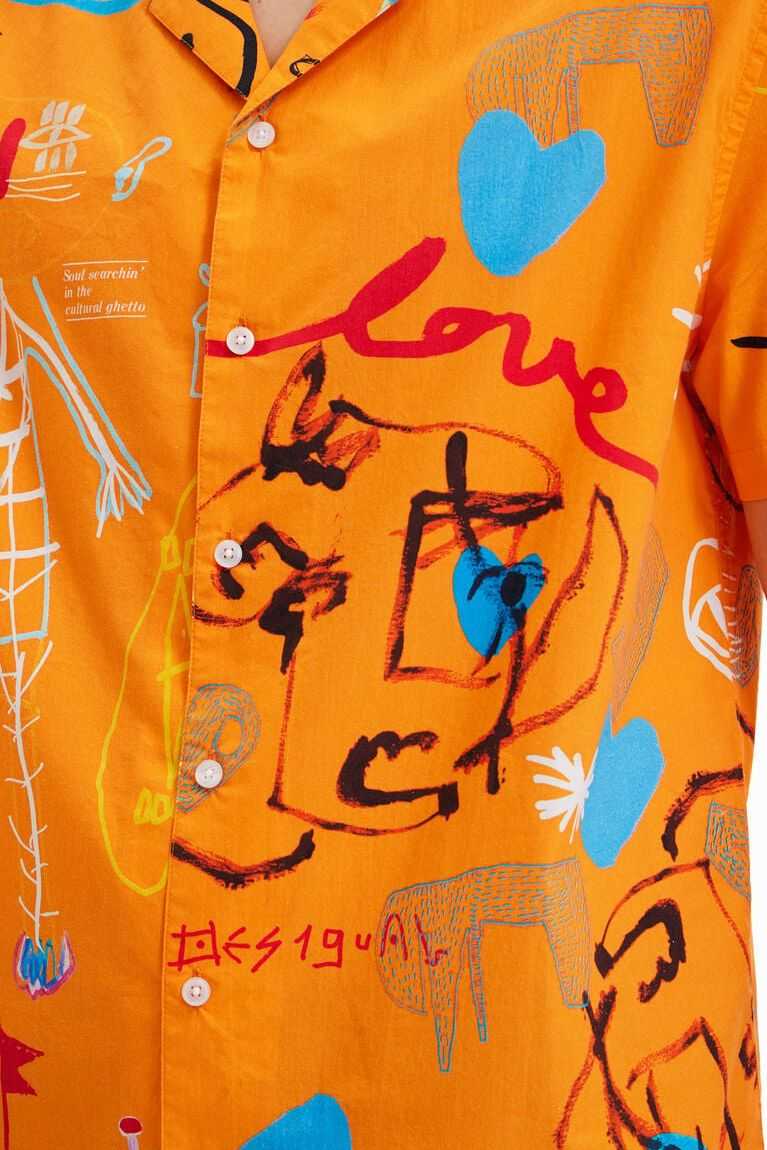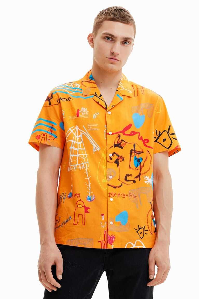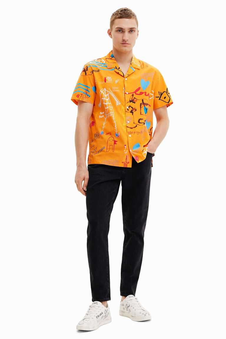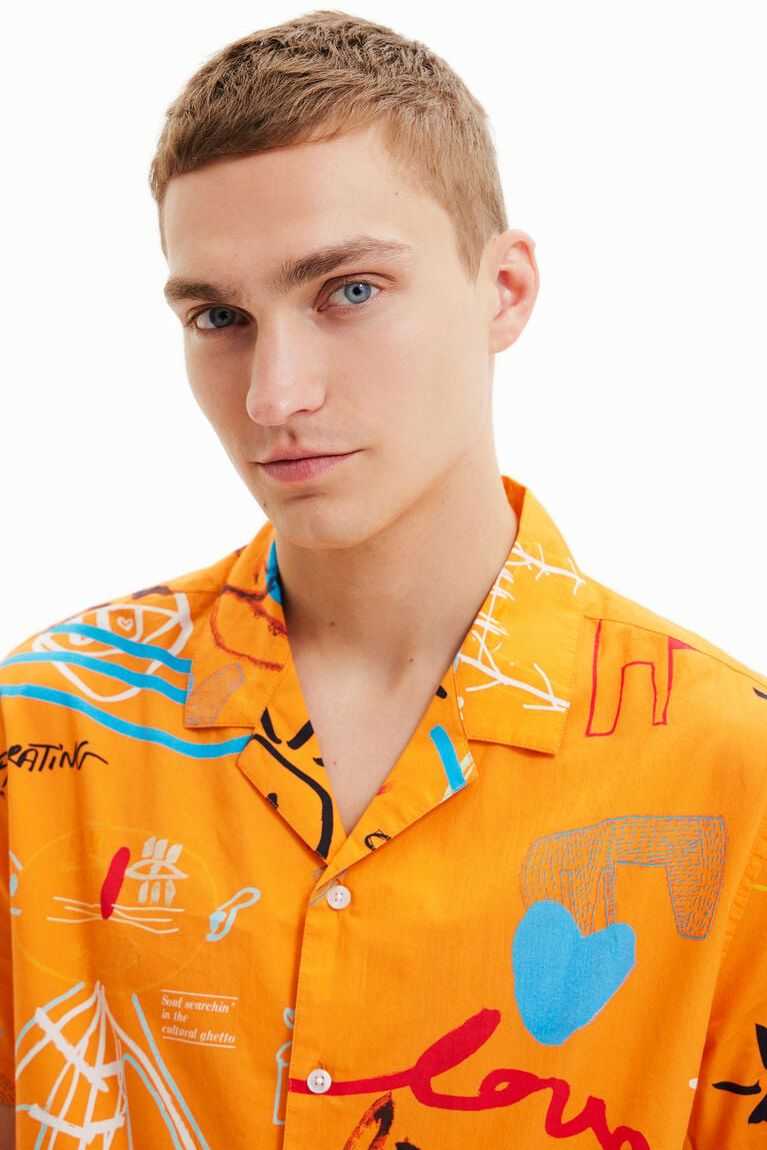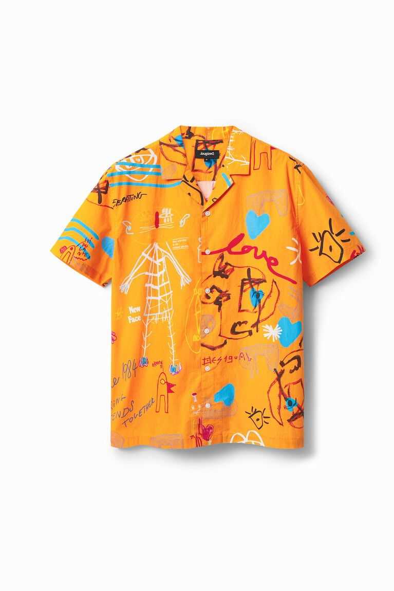 An orange resort shirt, made from cotton, with an all-over collage print of images and messages that appear hand painted.