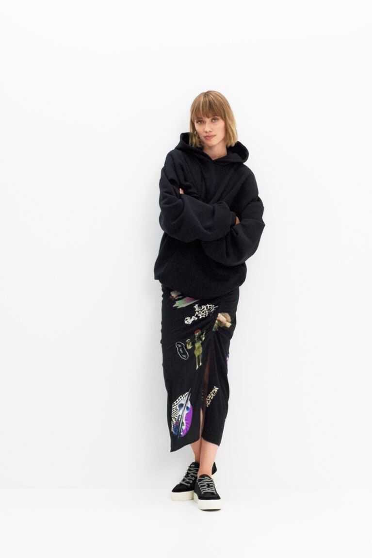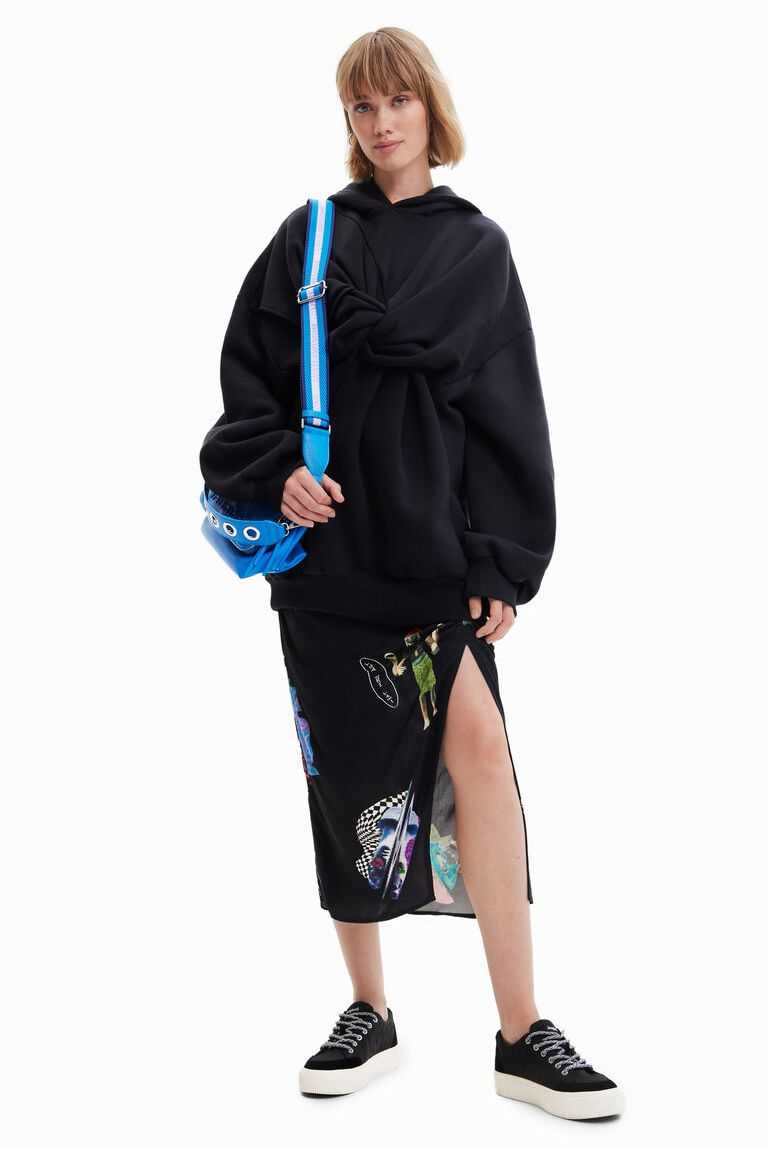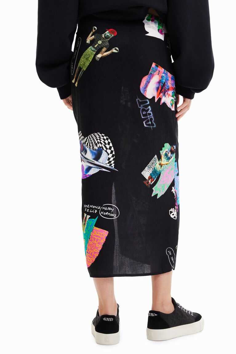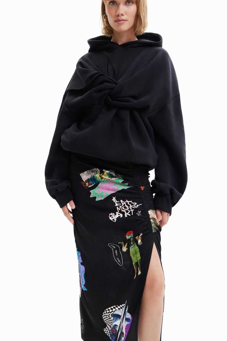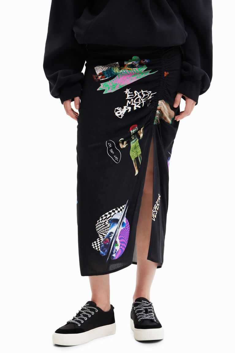 A midi skirt with a slit, draped gathering at the front and a digital graphic collage print.