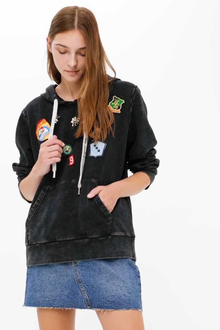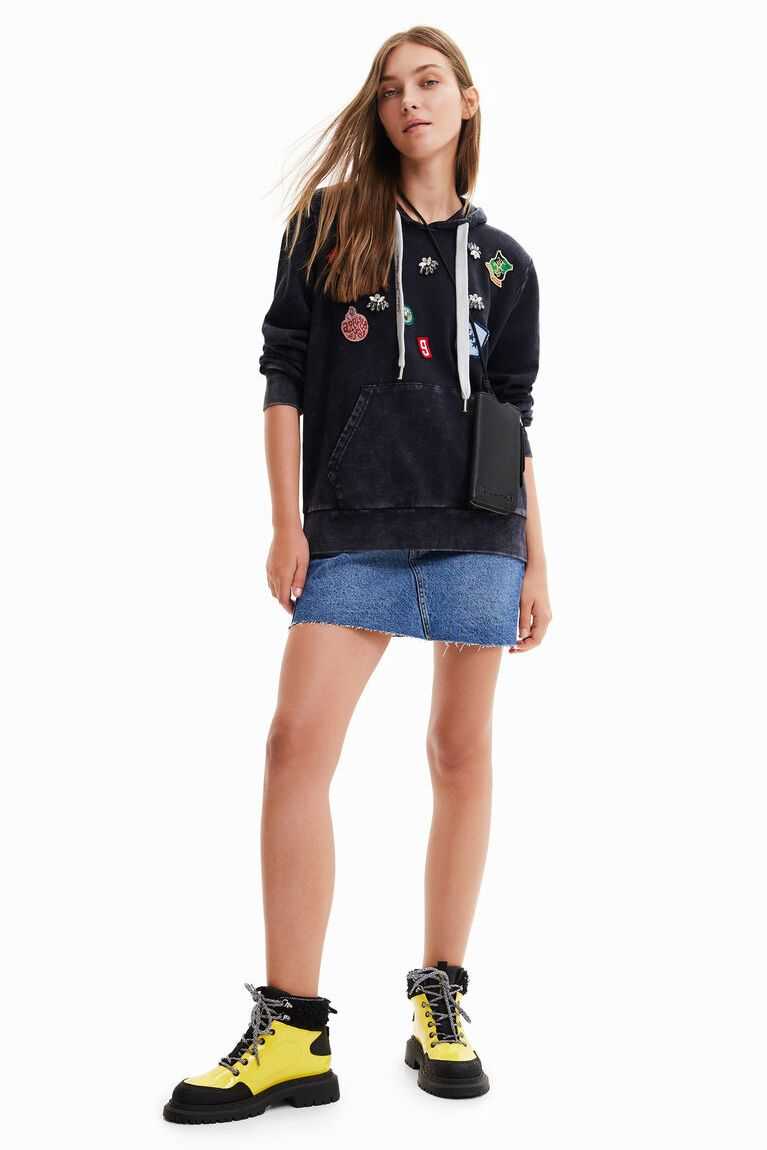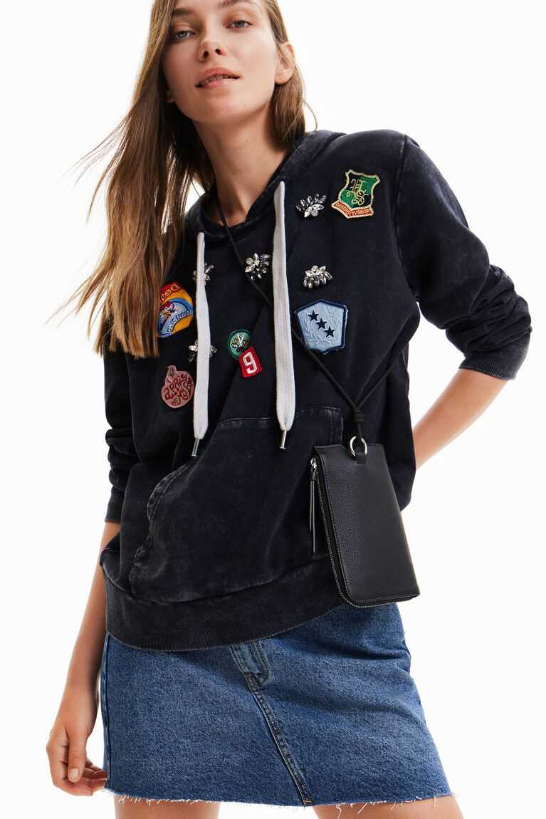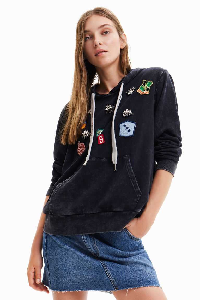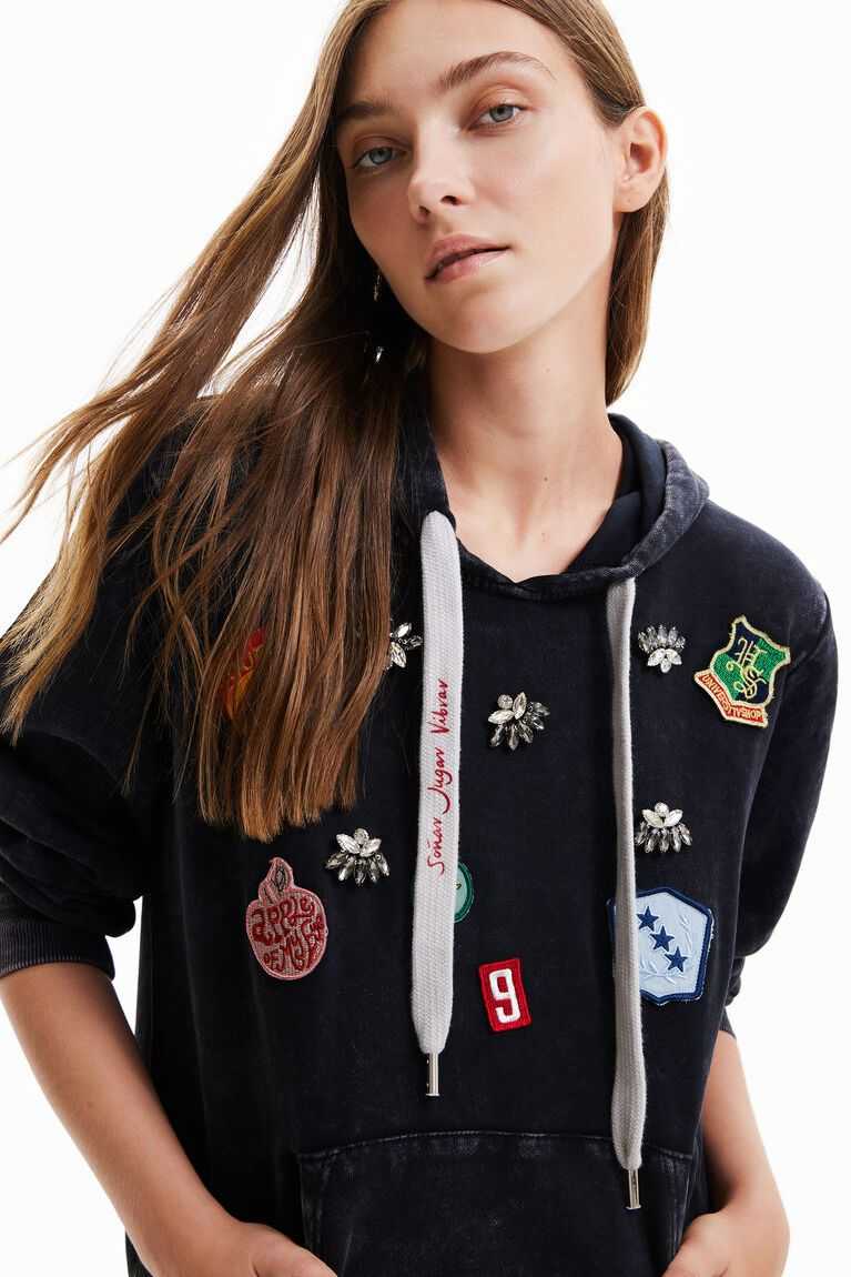 A basic hoodie, but with a twist thanks to its college-style patches with positive messages and shiny details. Made from cotton with a very soft feel.