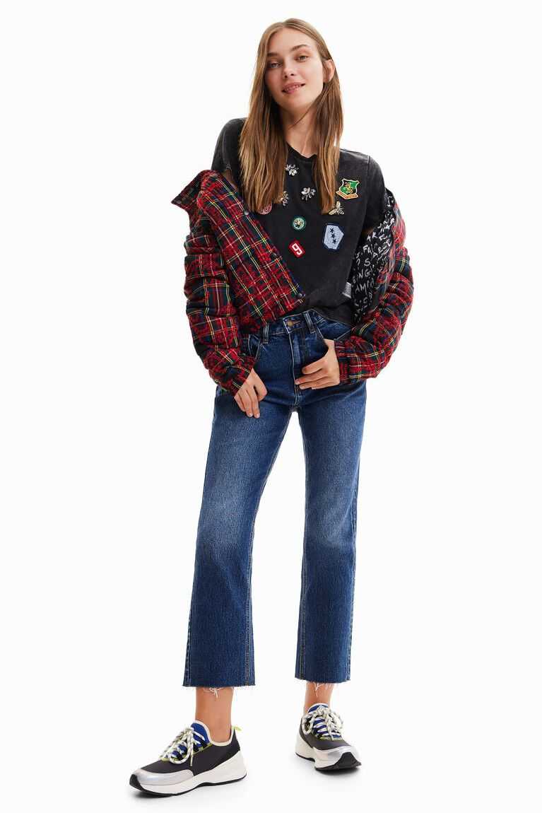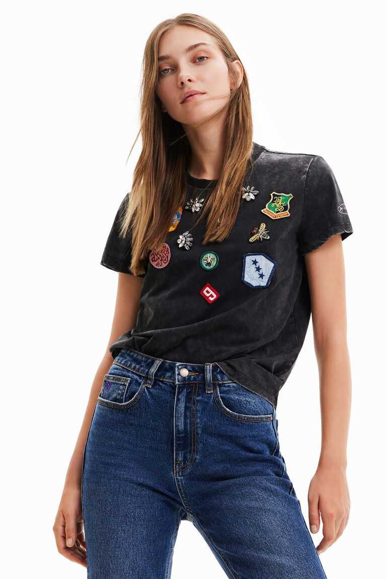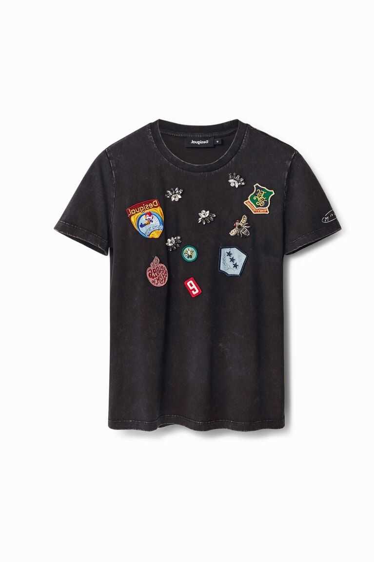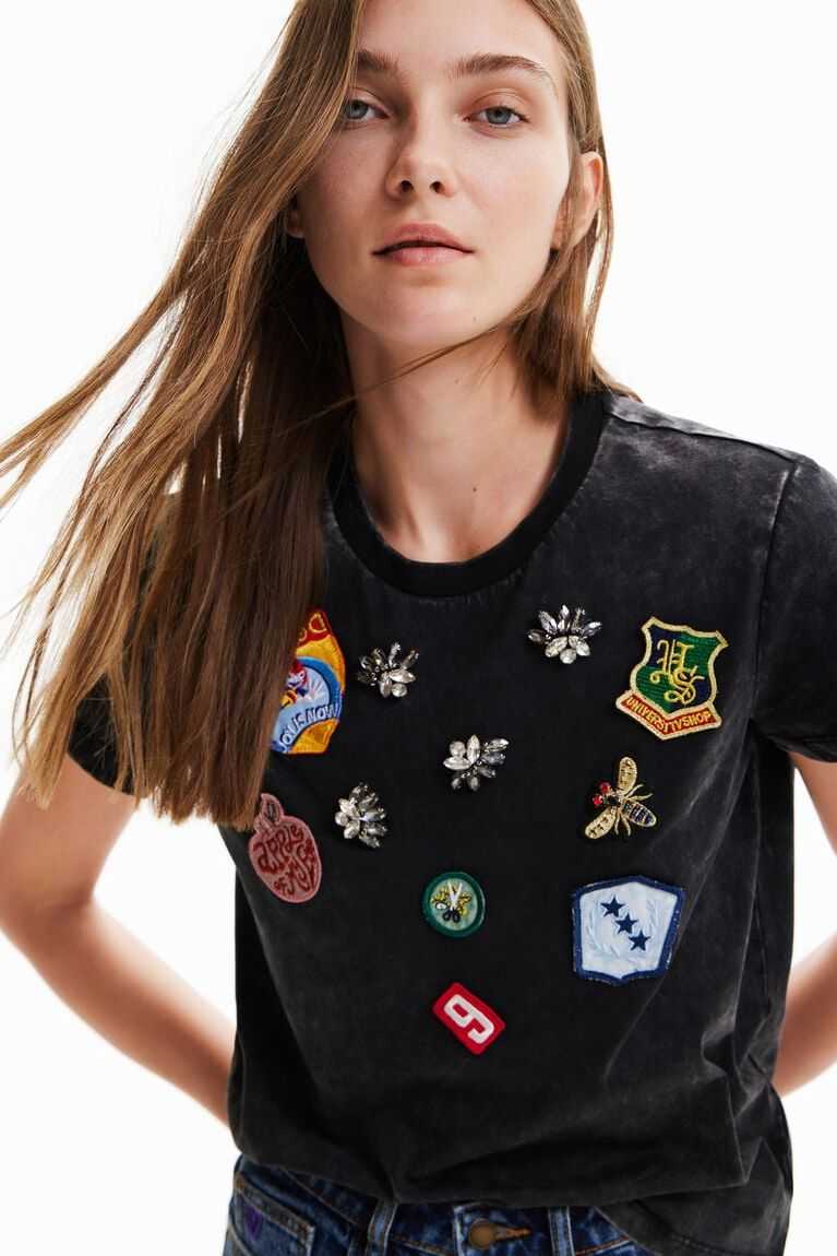A T-shirt that's both basic and different thanks to its fun college-style patches with positive messages. Made from cotton, it also features removable shiny pins.