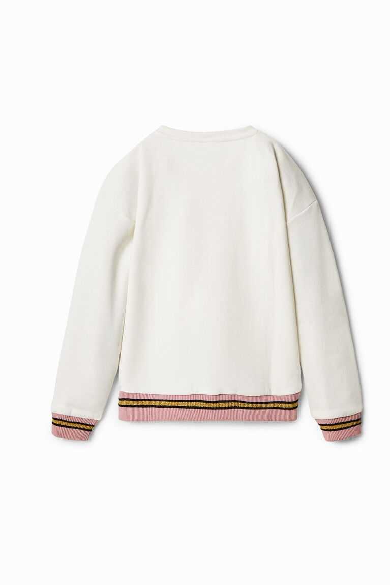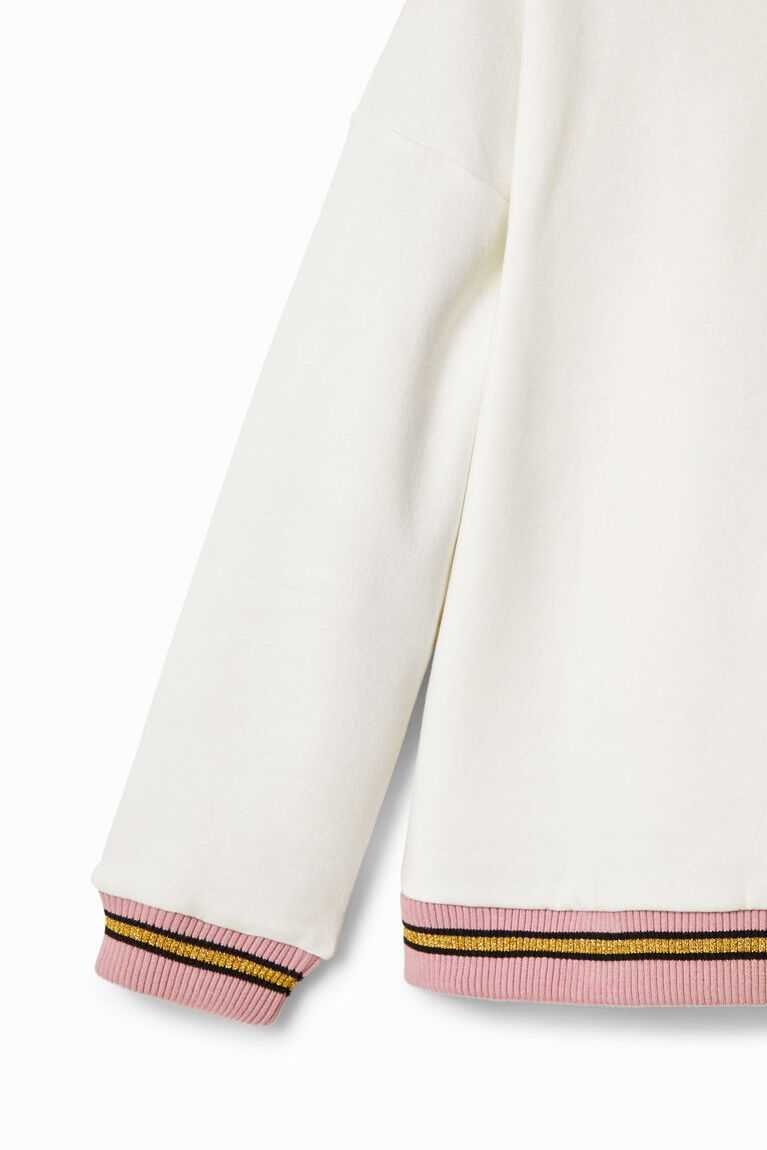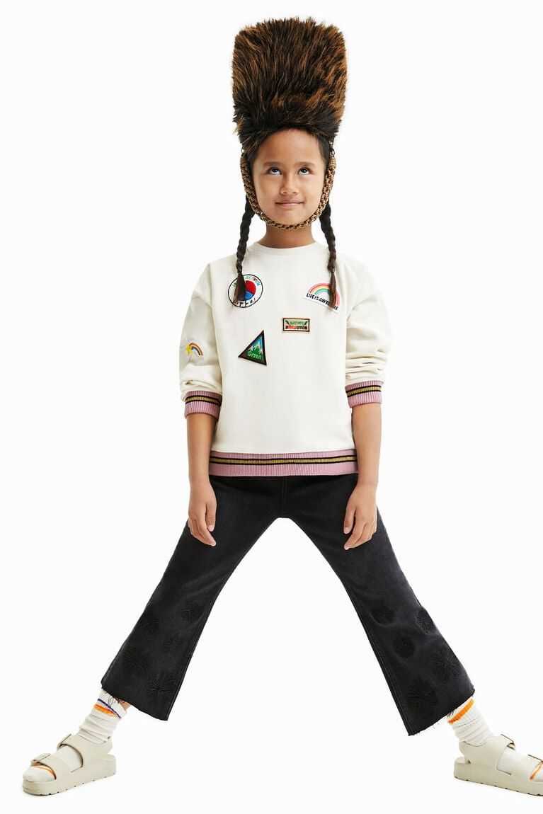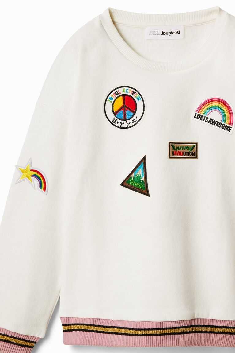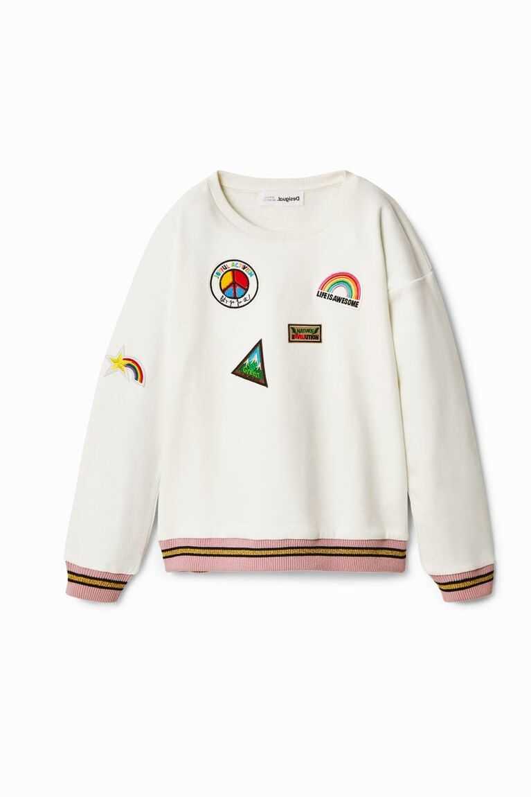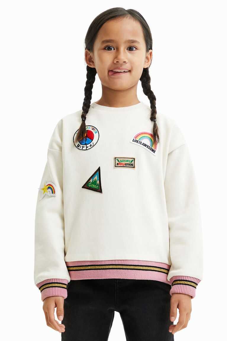 A cotton sweatshirt featuring college-style patches with nature messages on the front. Featuring an elasticated hem and cuffs with contrasting stripes.
