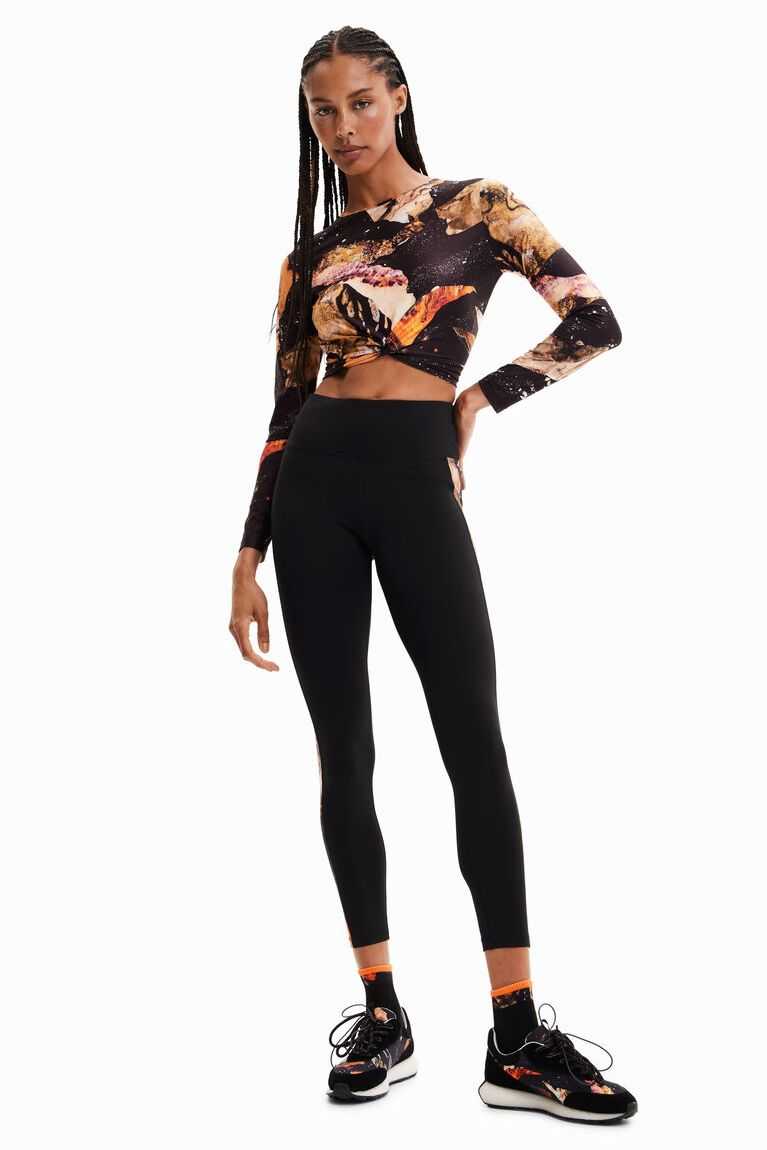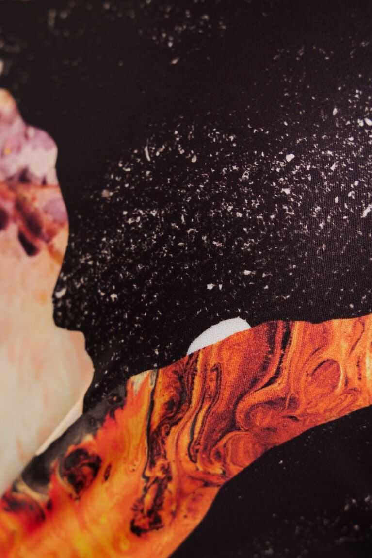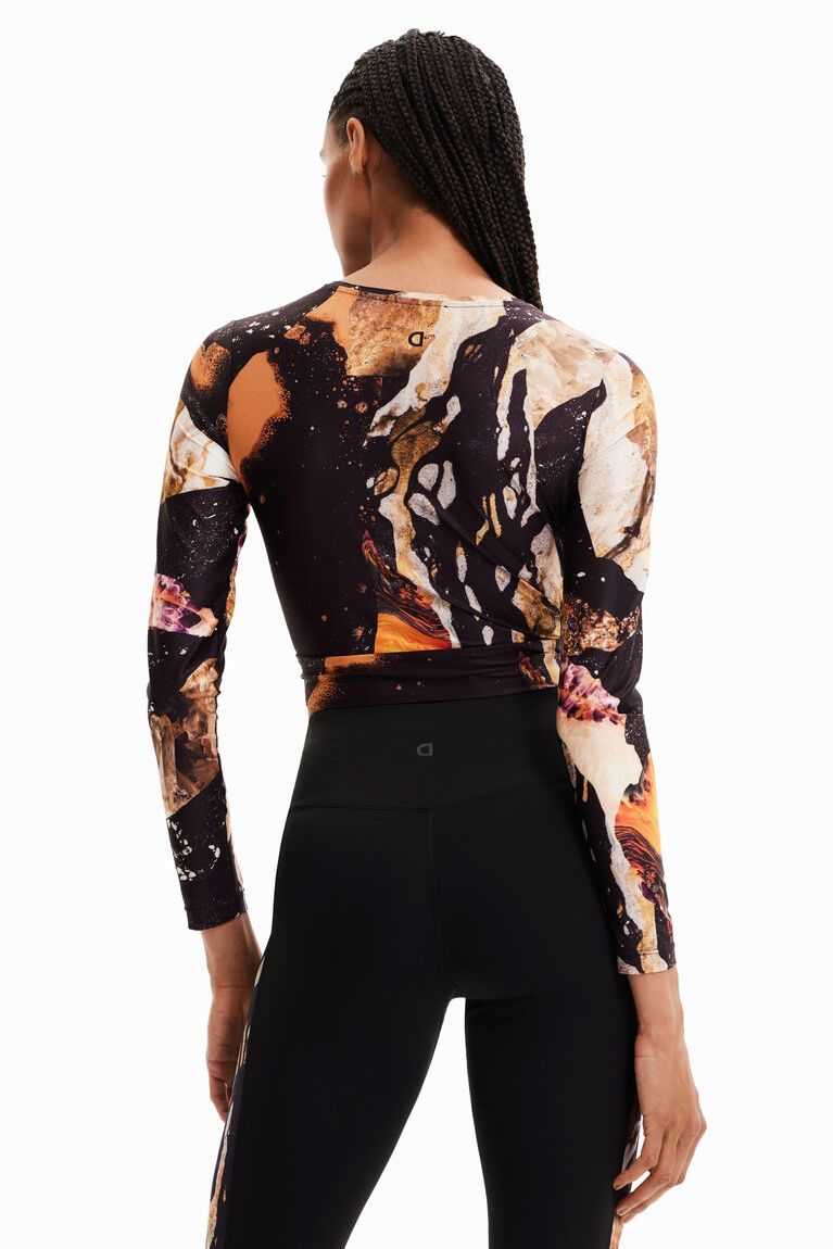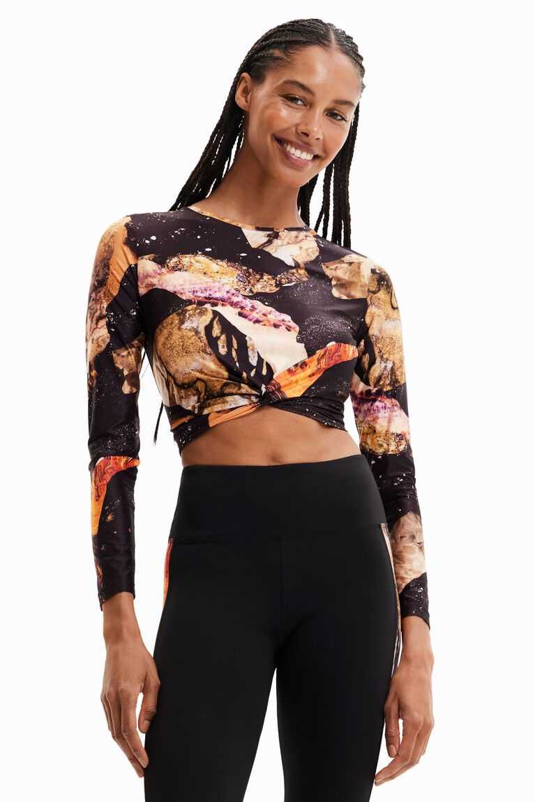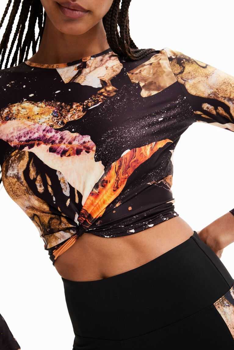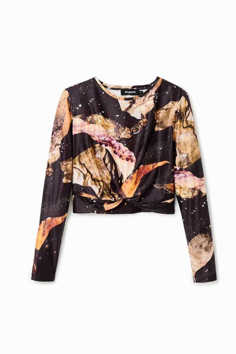 A short, long-sleeve T-shirt with a mineral print and gathering on the front.