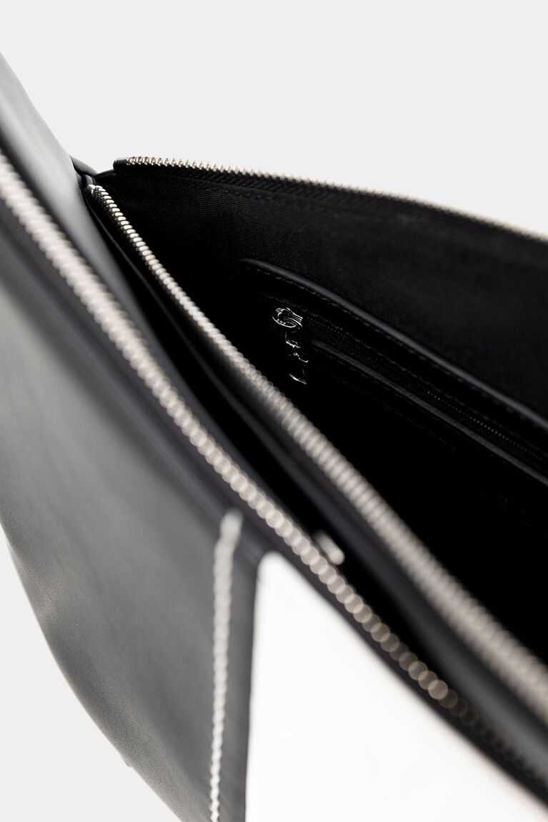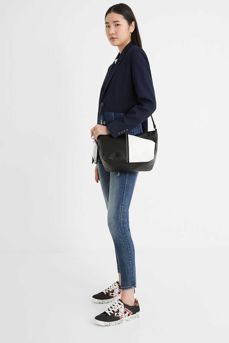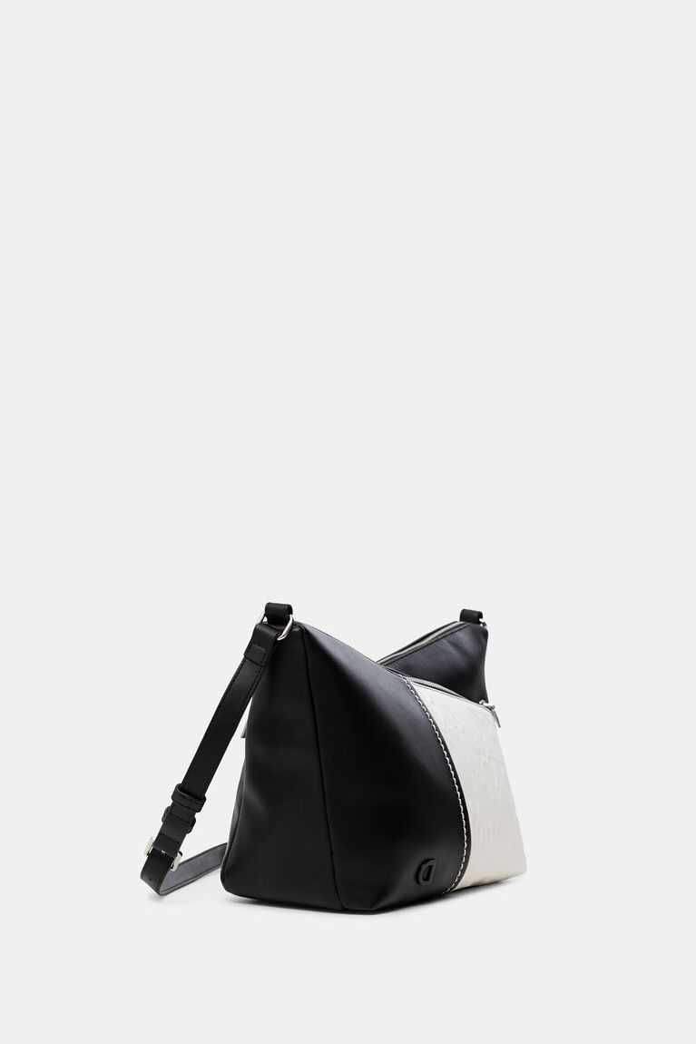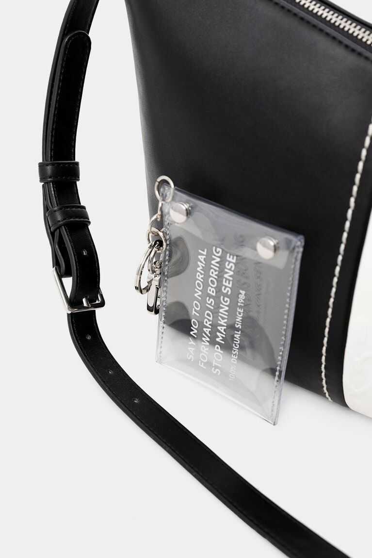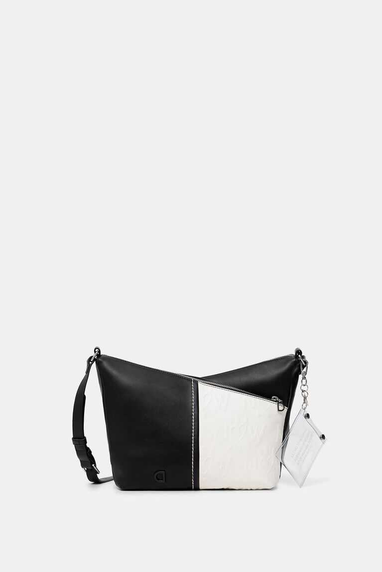 The Black & White mix never fails and the proof is in this mini-bag with crossed silhouette and matching embossed hearts on the white part. It's a sling bag that is both simple and original.