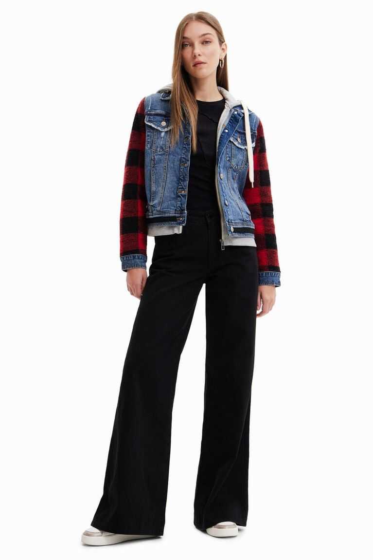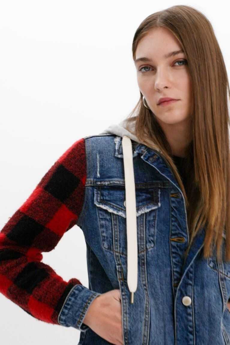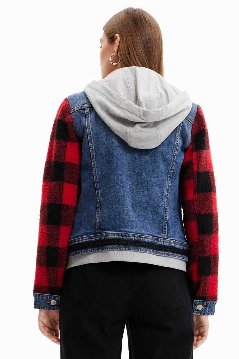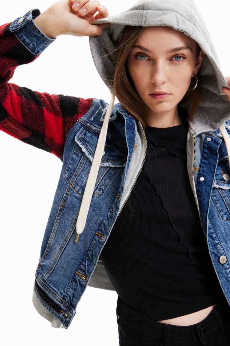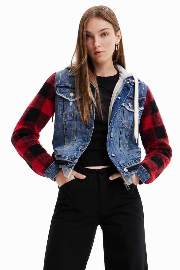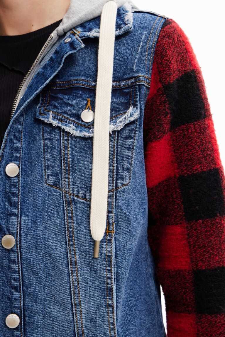 A combination of denim and plaid-print sleeves on this jean jacket with a hood, zip and white drawstrings.Made with cotton.