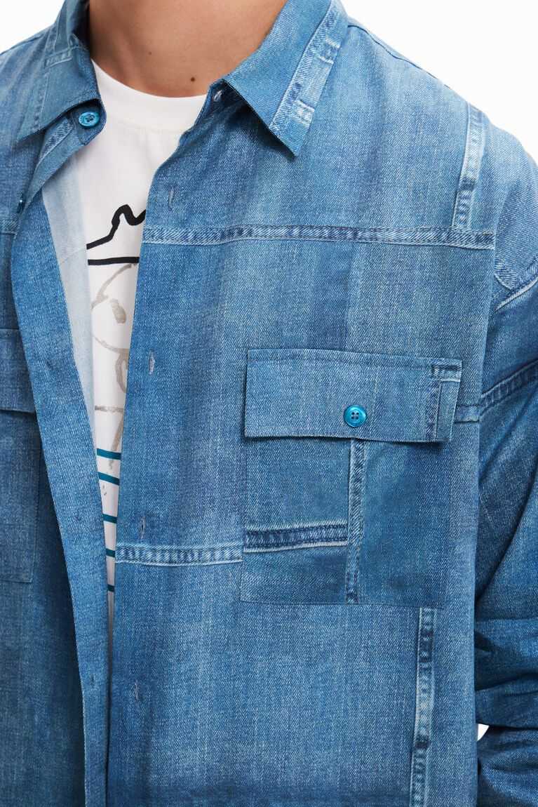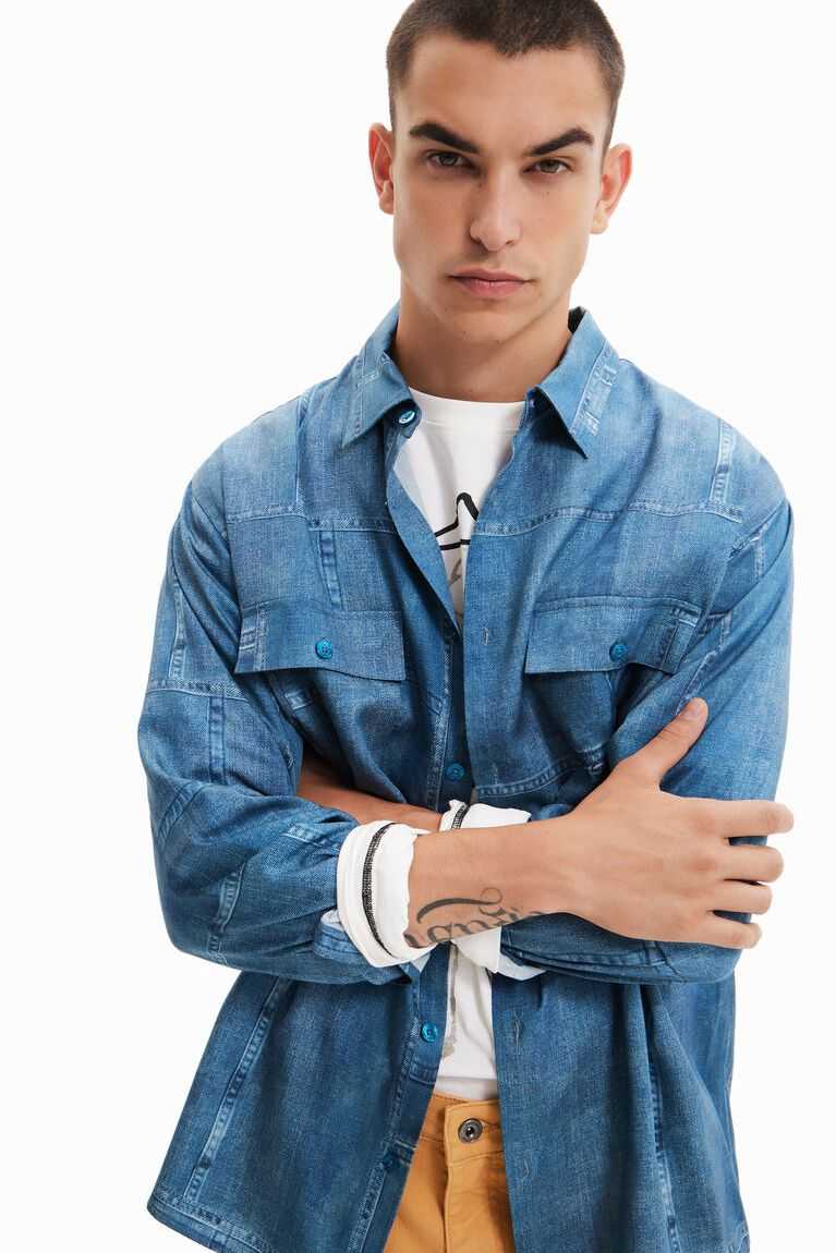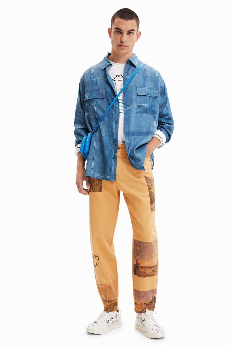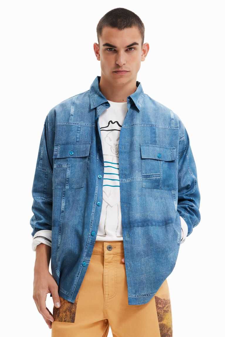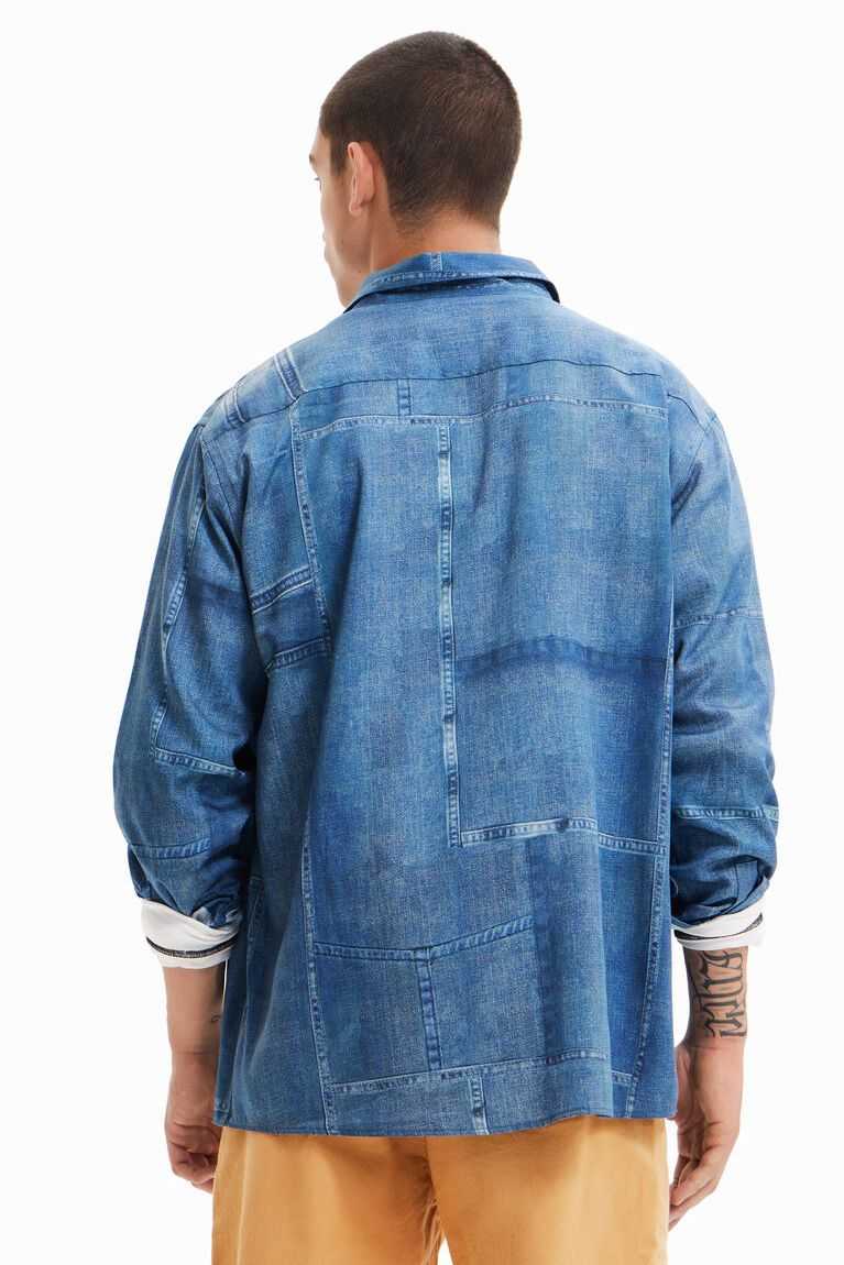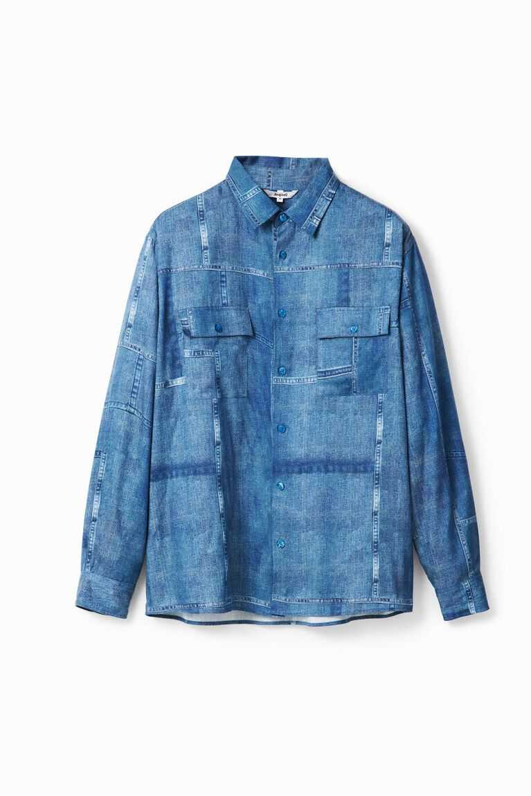 A long-sleeve, straight-cut shirt in a very soft fabric with a denim patchwork-effect print and "Enjoy the ride" message.