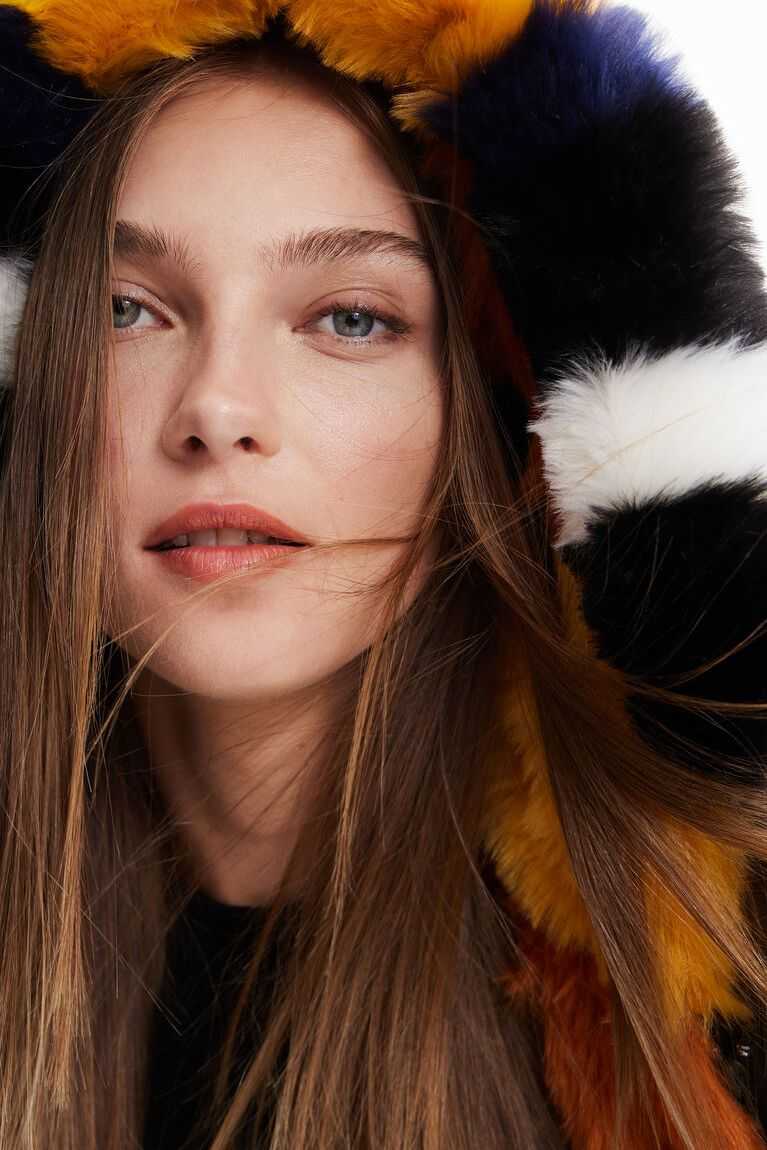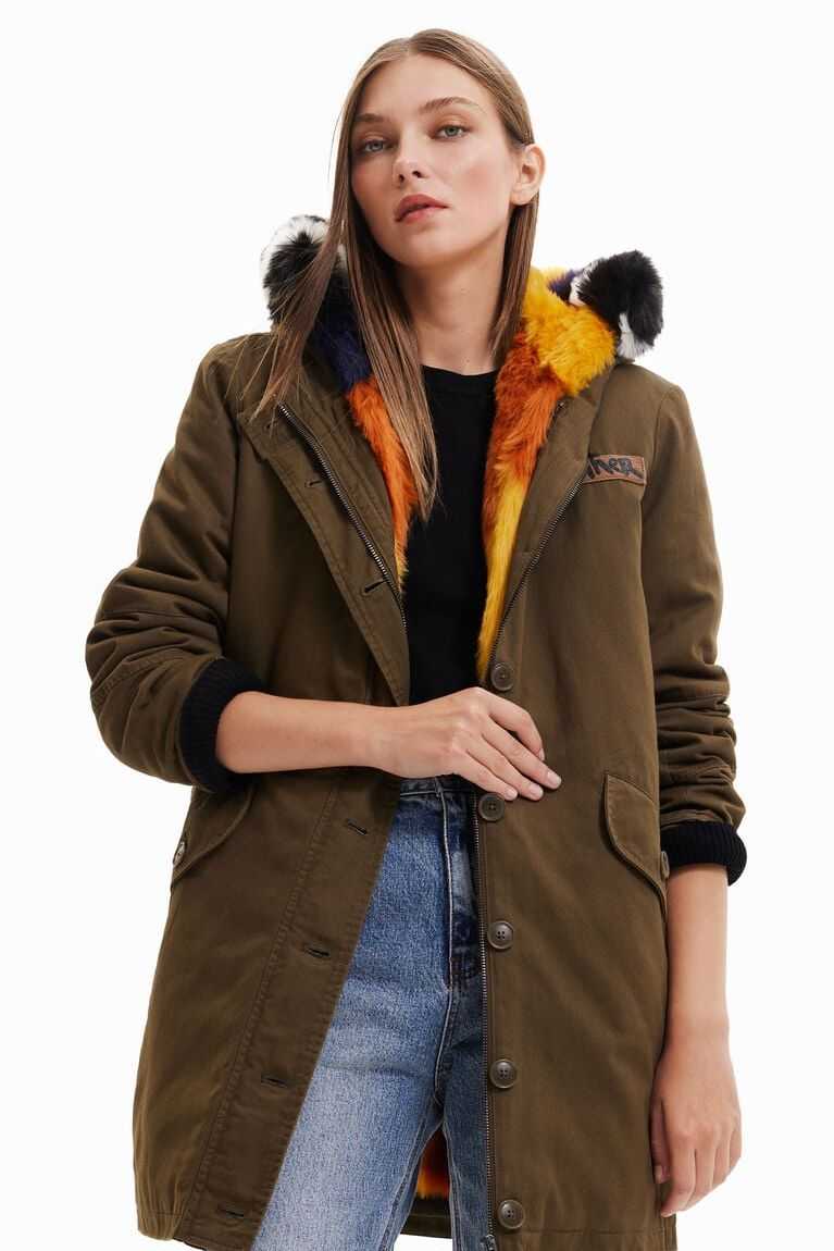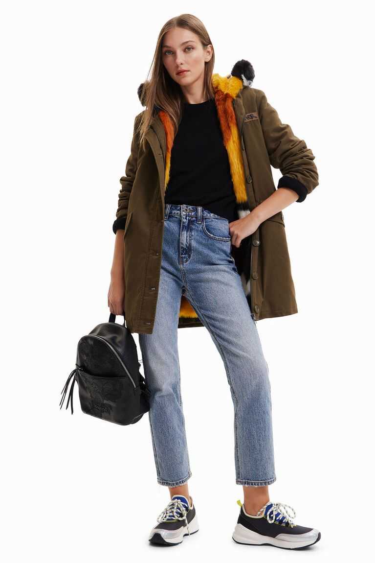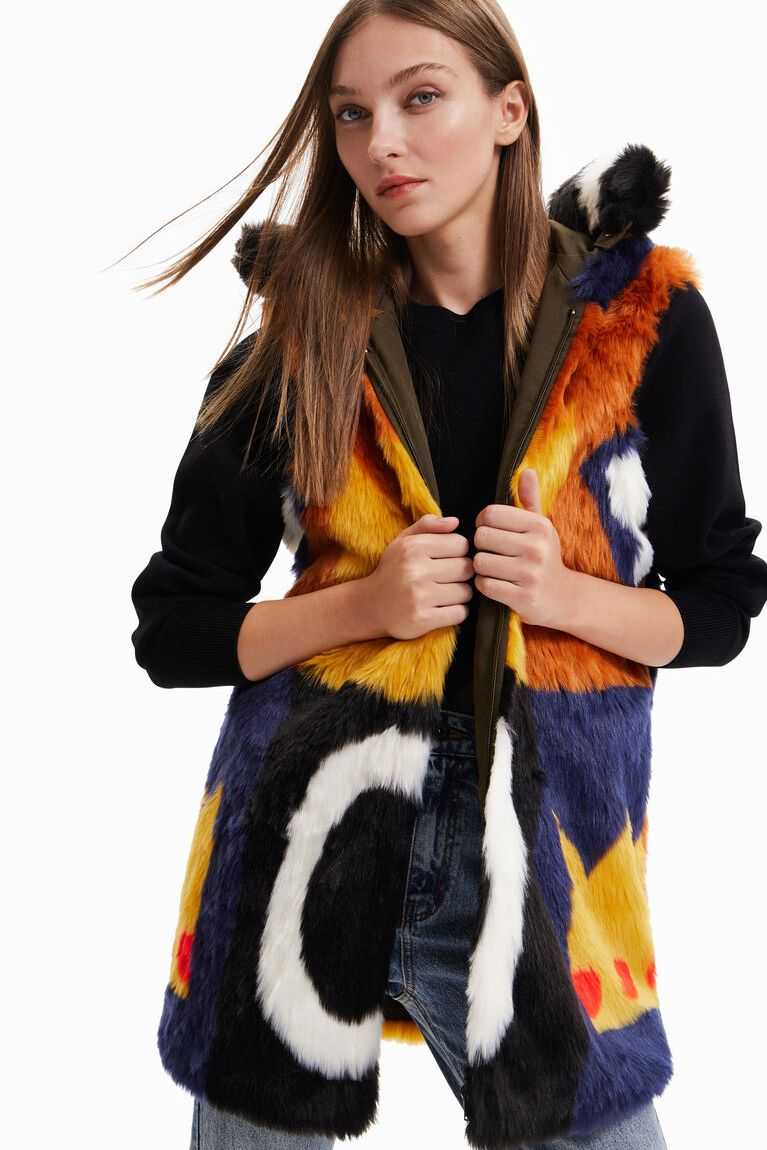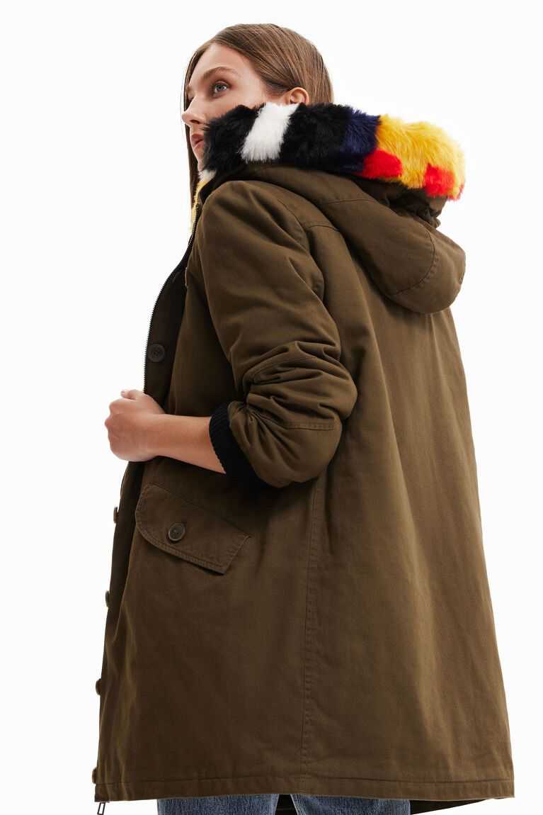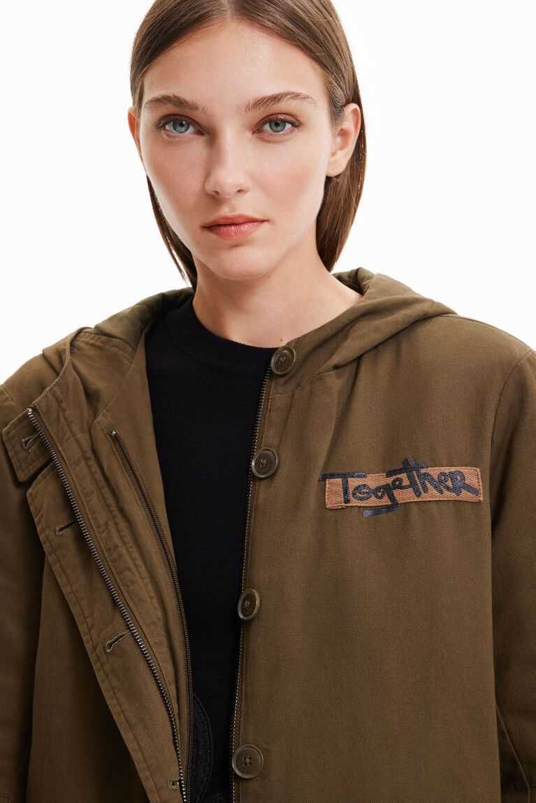 A military-style parka with a hood, lightly padded lining and a detachable contrasting faux-fur gilet. Features a strip with text on the front.
