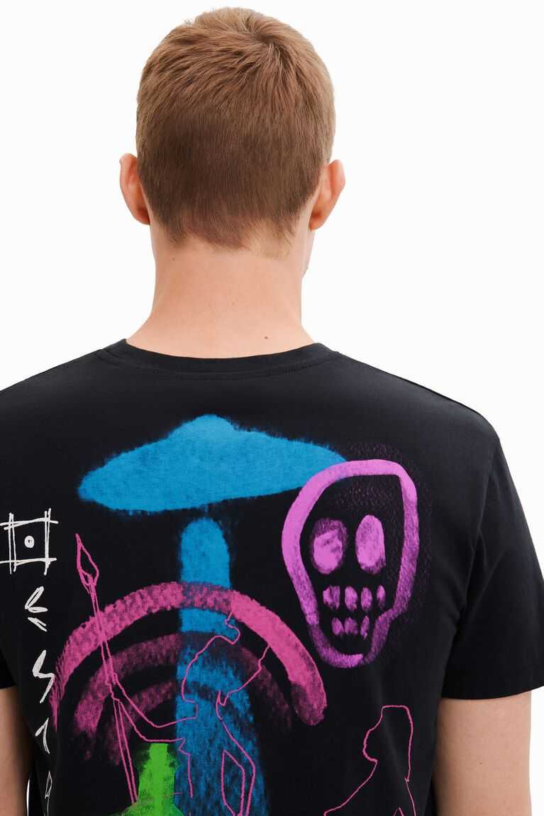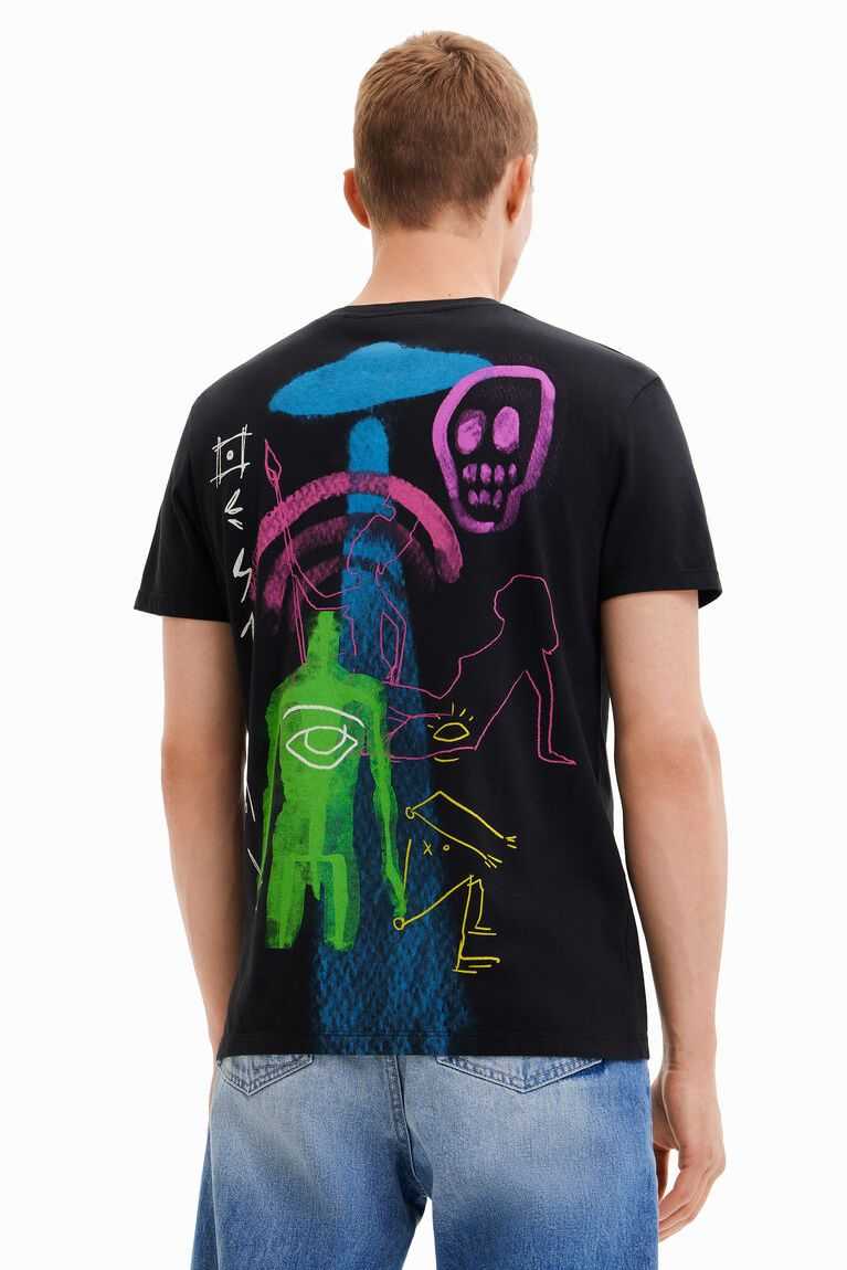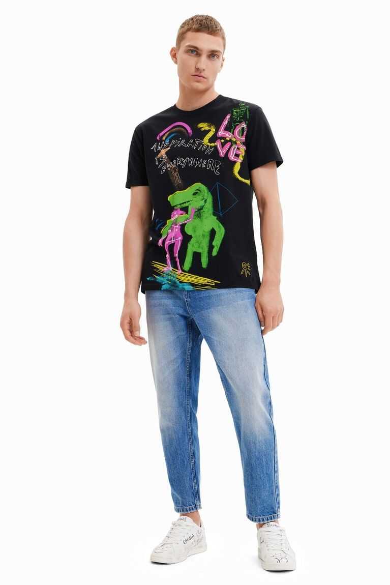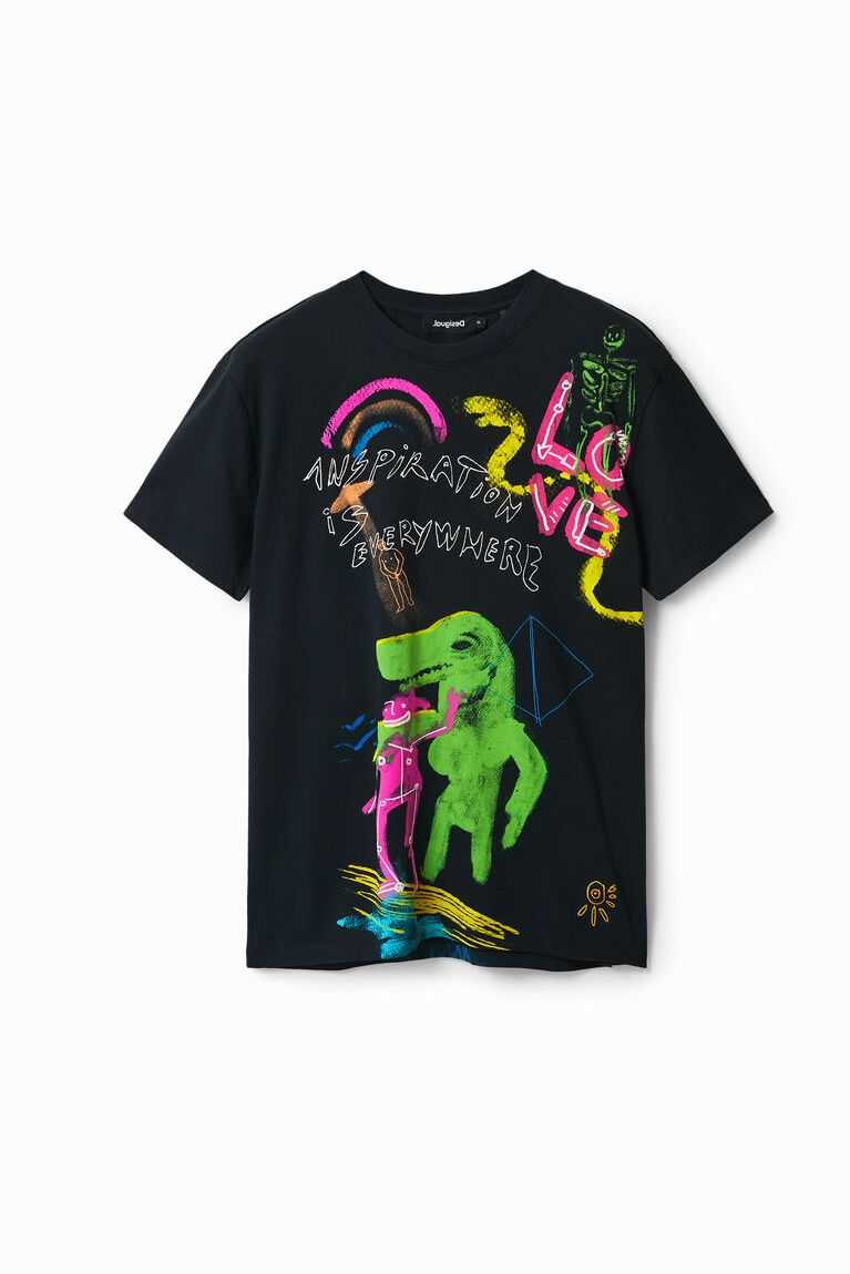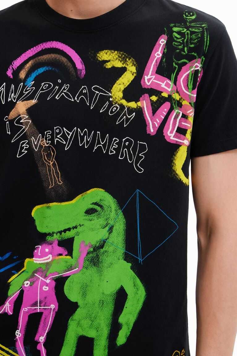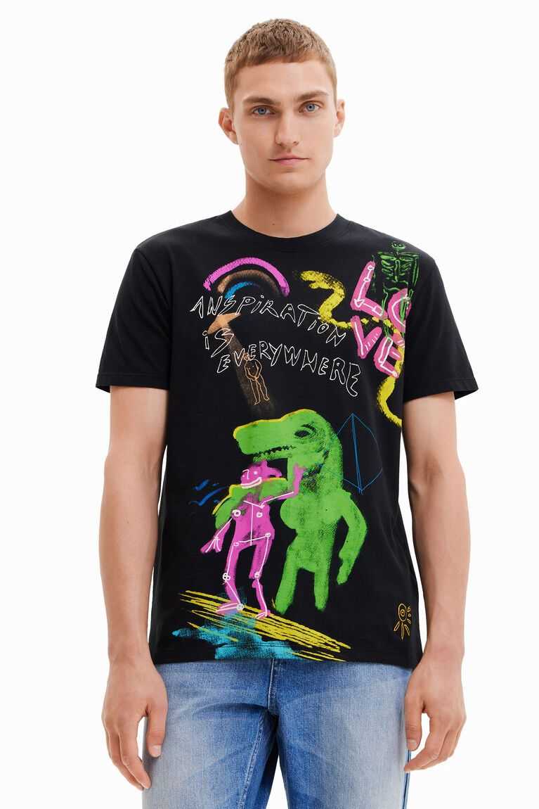 A short-sleeve cotton T-shirt with an arty positional print on the front combining aliens, dinosaurs and messages in fluorescent tones.