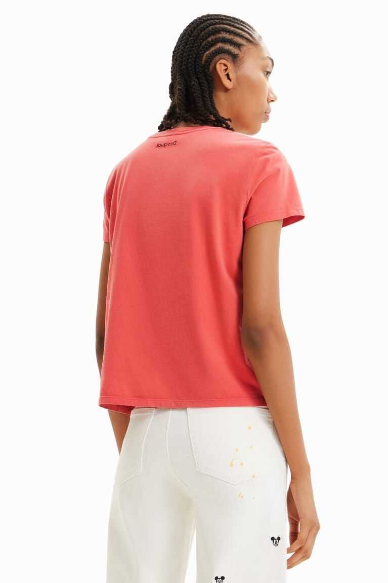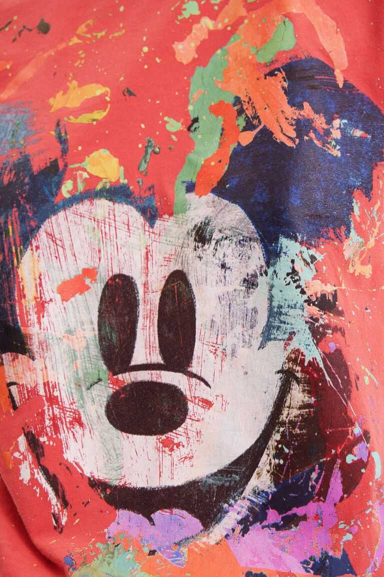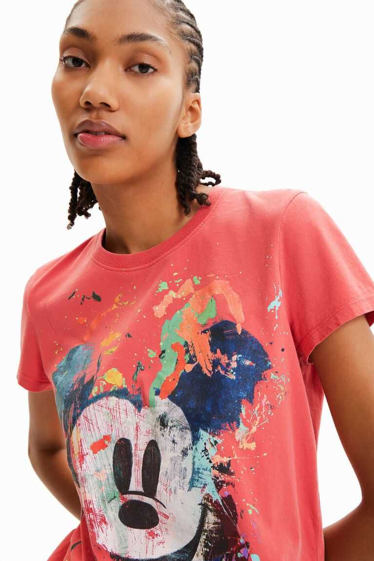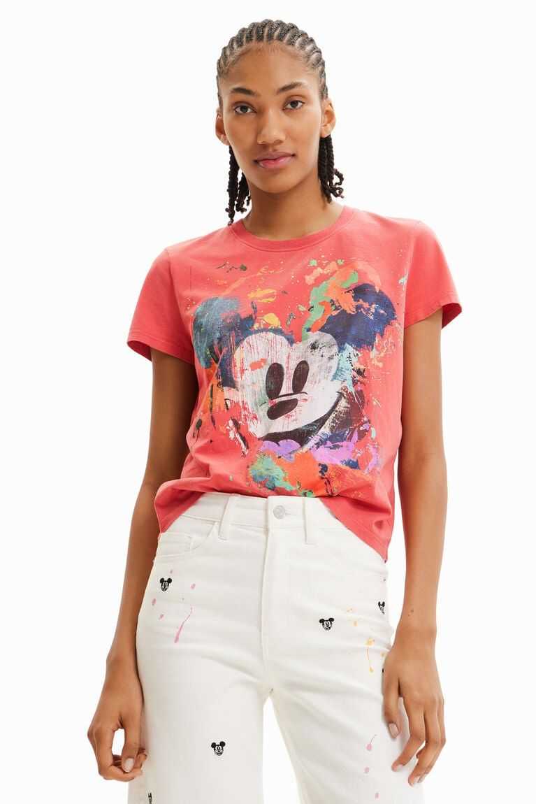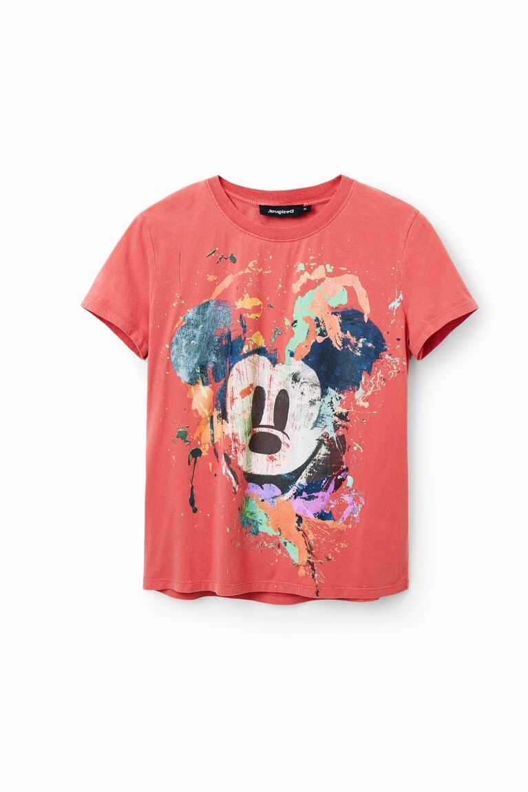 A short-sleeve T-shirt with a front print of Disney's Mickey Mouse by the artist Pink Morro featuring a multicolour splatter effect.