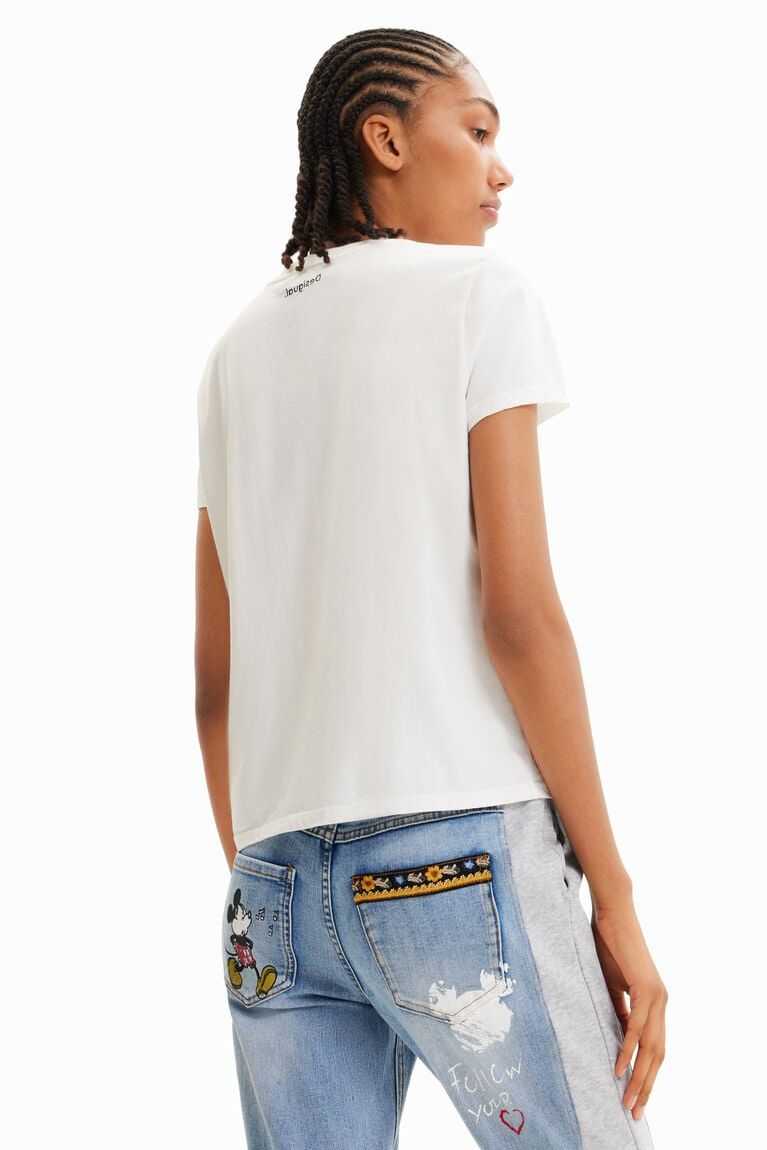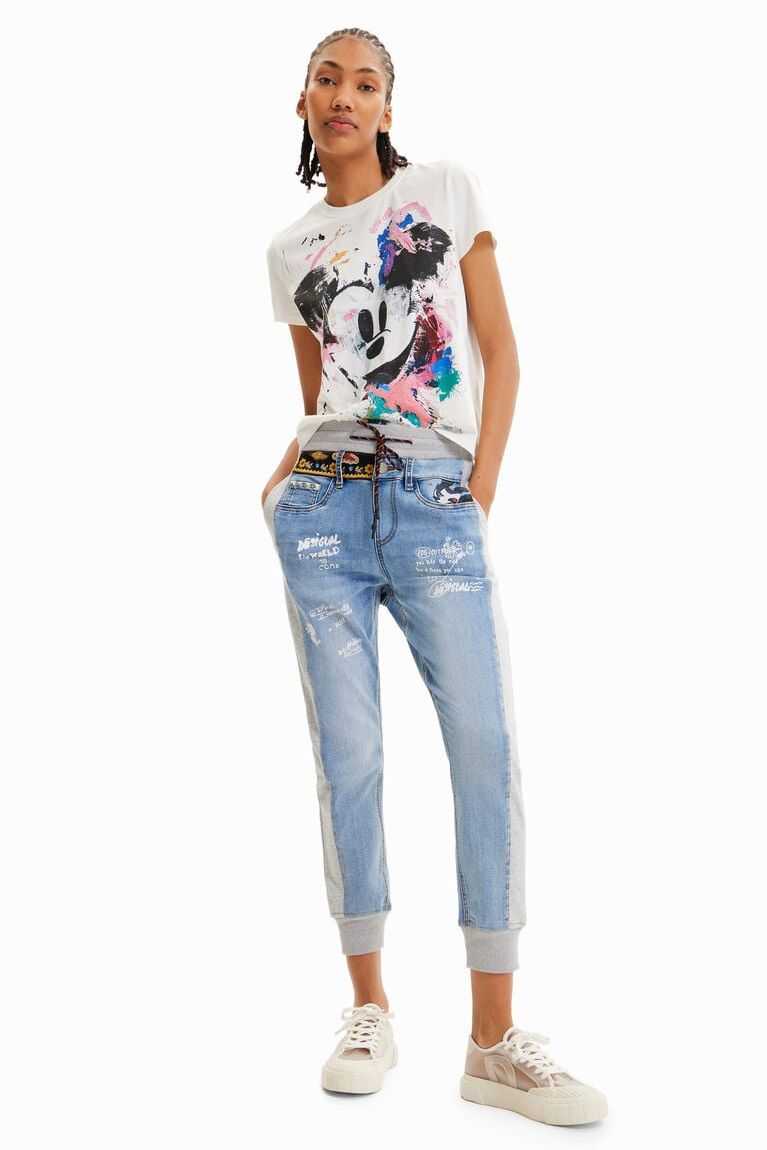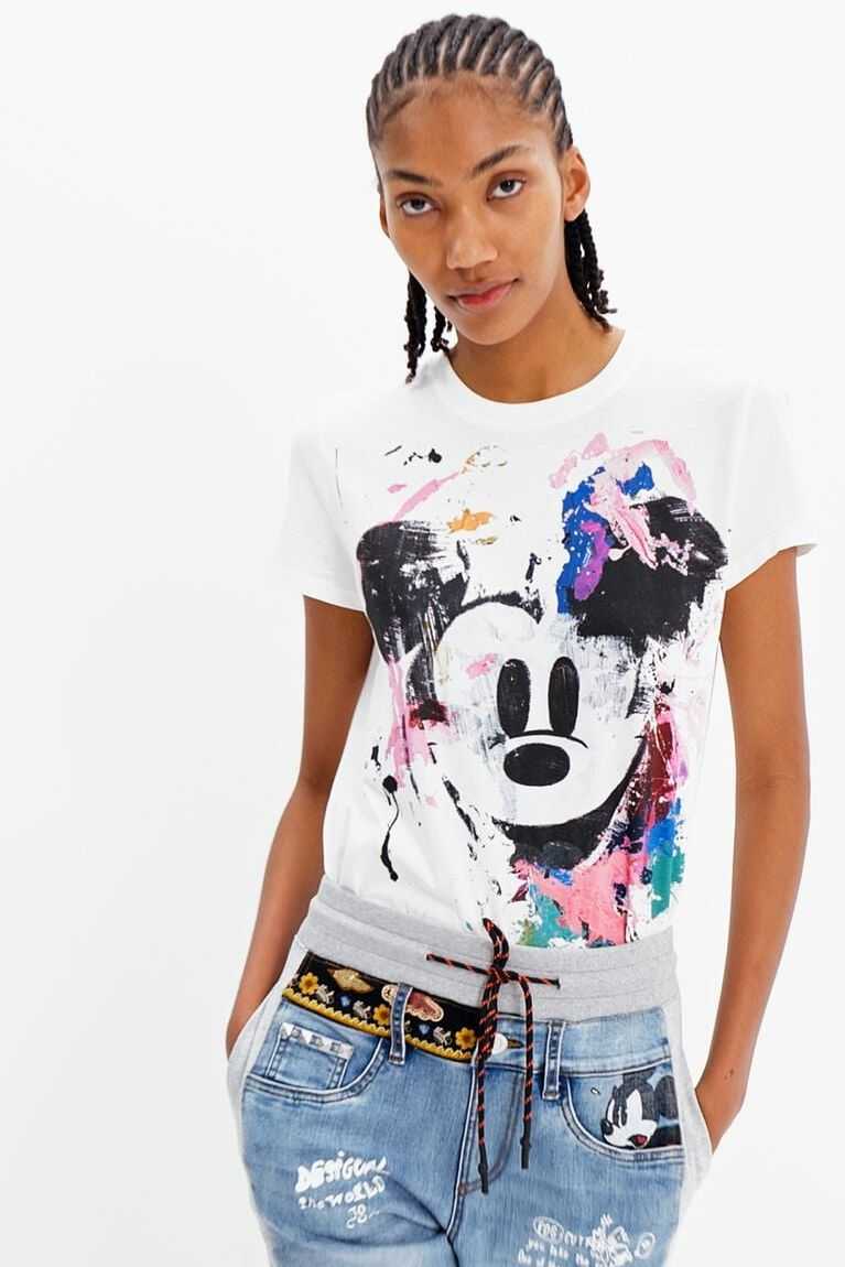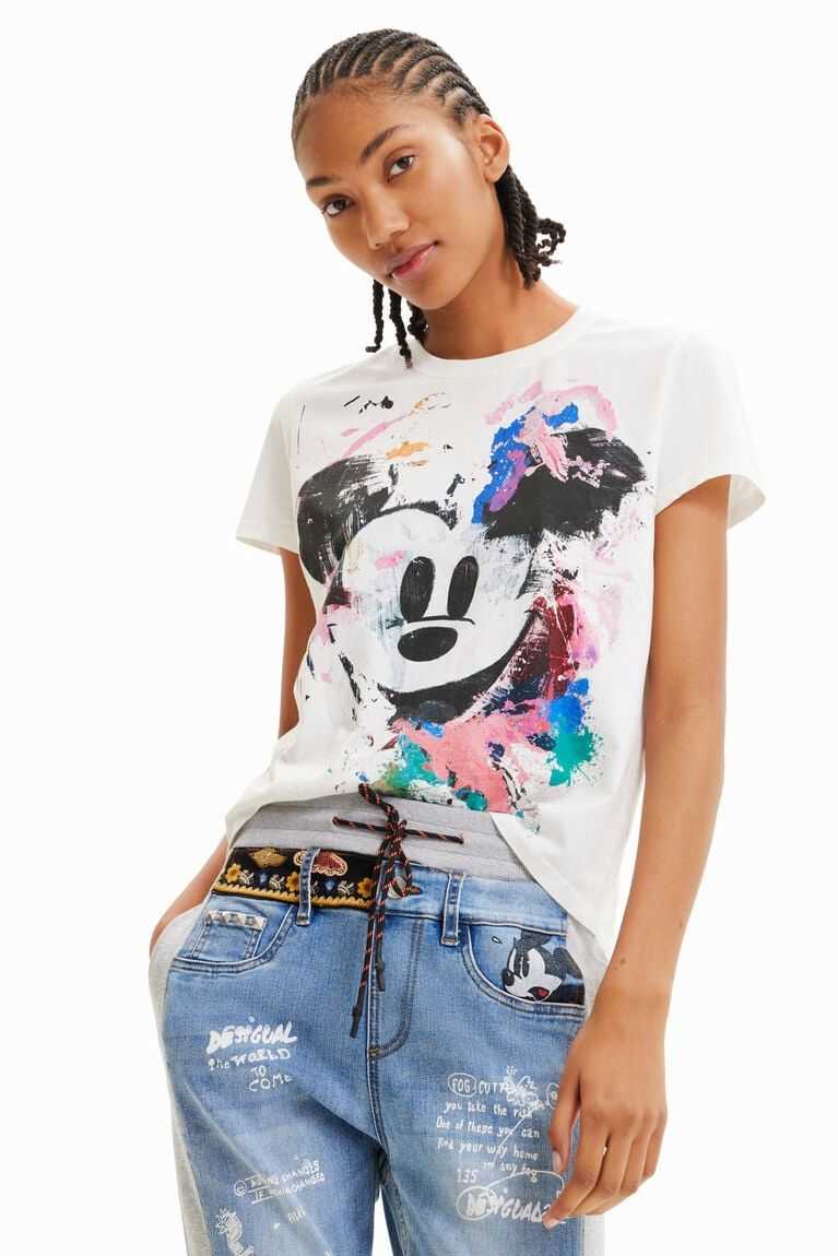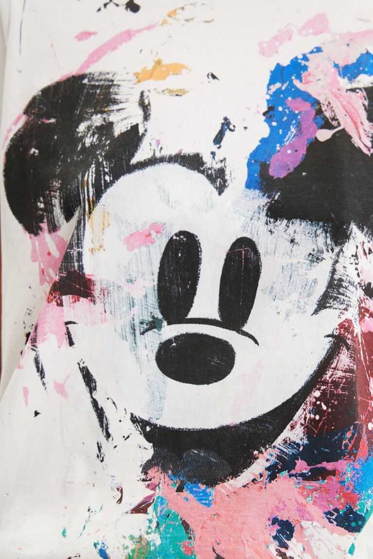 A short-sleeve T-shirt with a front print of Disney's Mickey Mouse by the artist Pink Morro featuring a multicolour splatter effect.