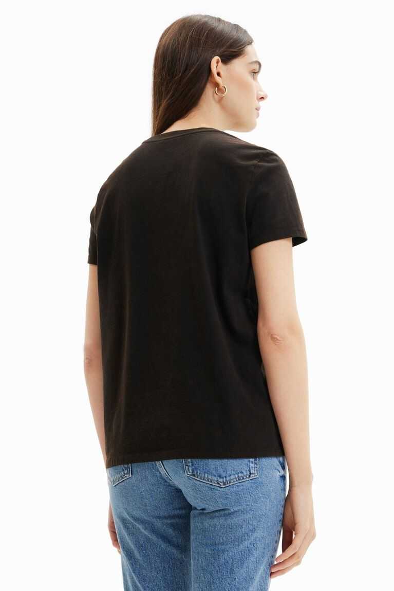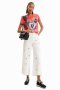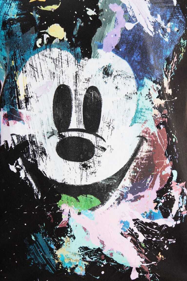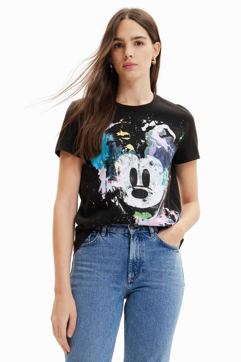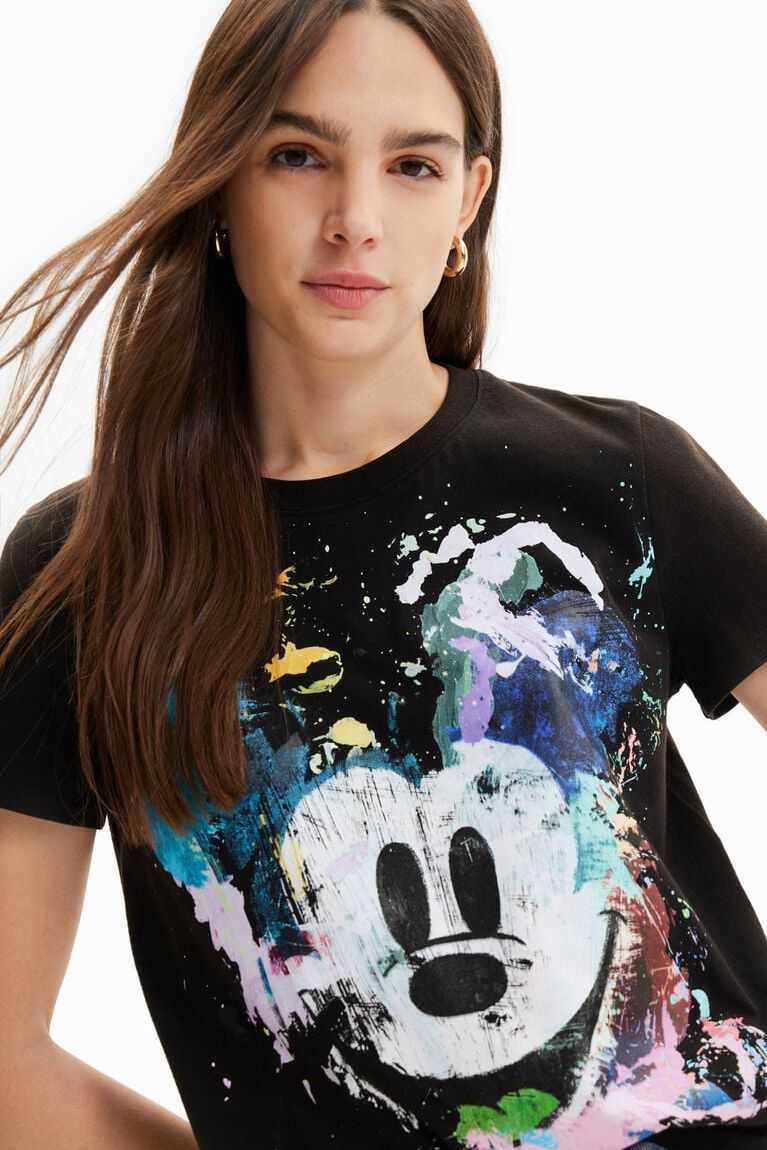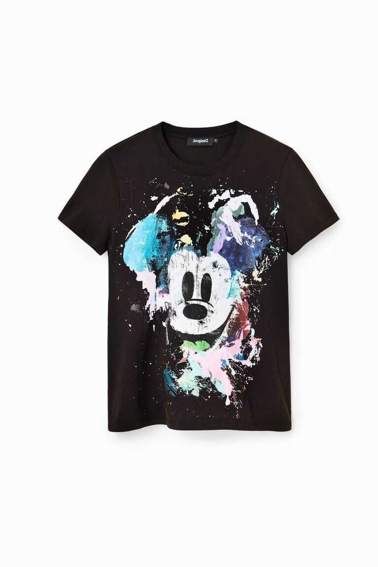A short-sleeve T-shirt with a front print of Disney's Mickey Mouse by the artist Pink Morro featuring a multicolour splatter effect.