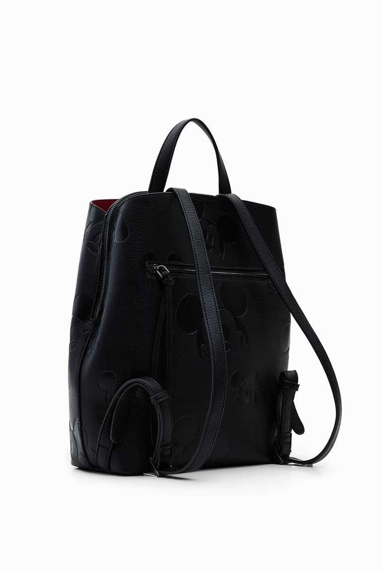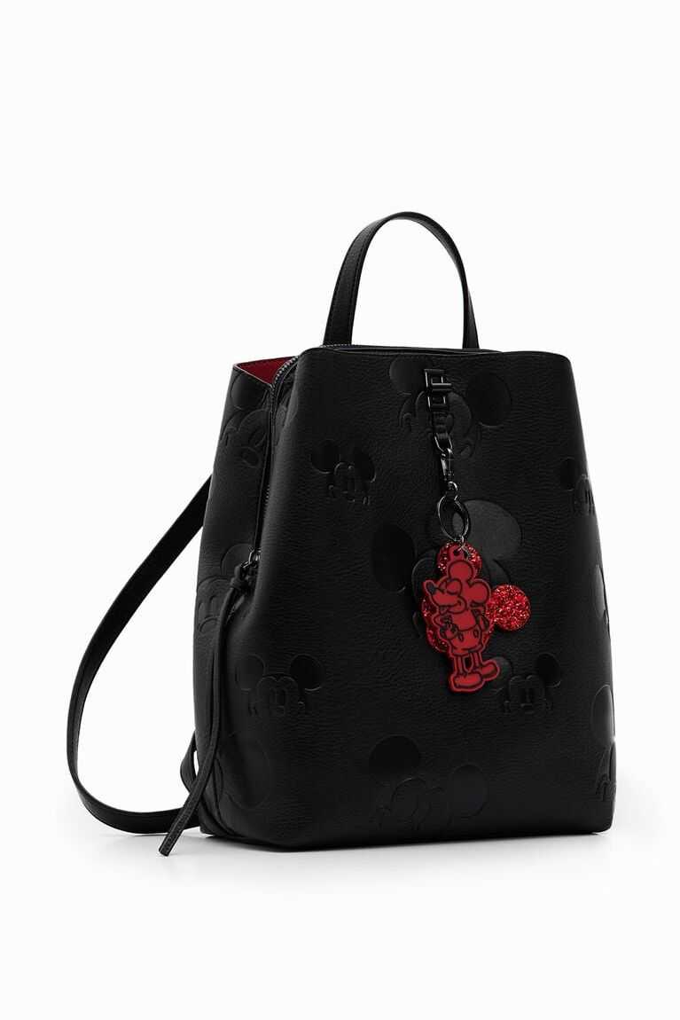 Backpack embossed with tone-on-tone silhouettes of Disney's Mickey Mouse. Comes with a large, decorative silicone charm. Can be carried as a handbag due to its size and handles.