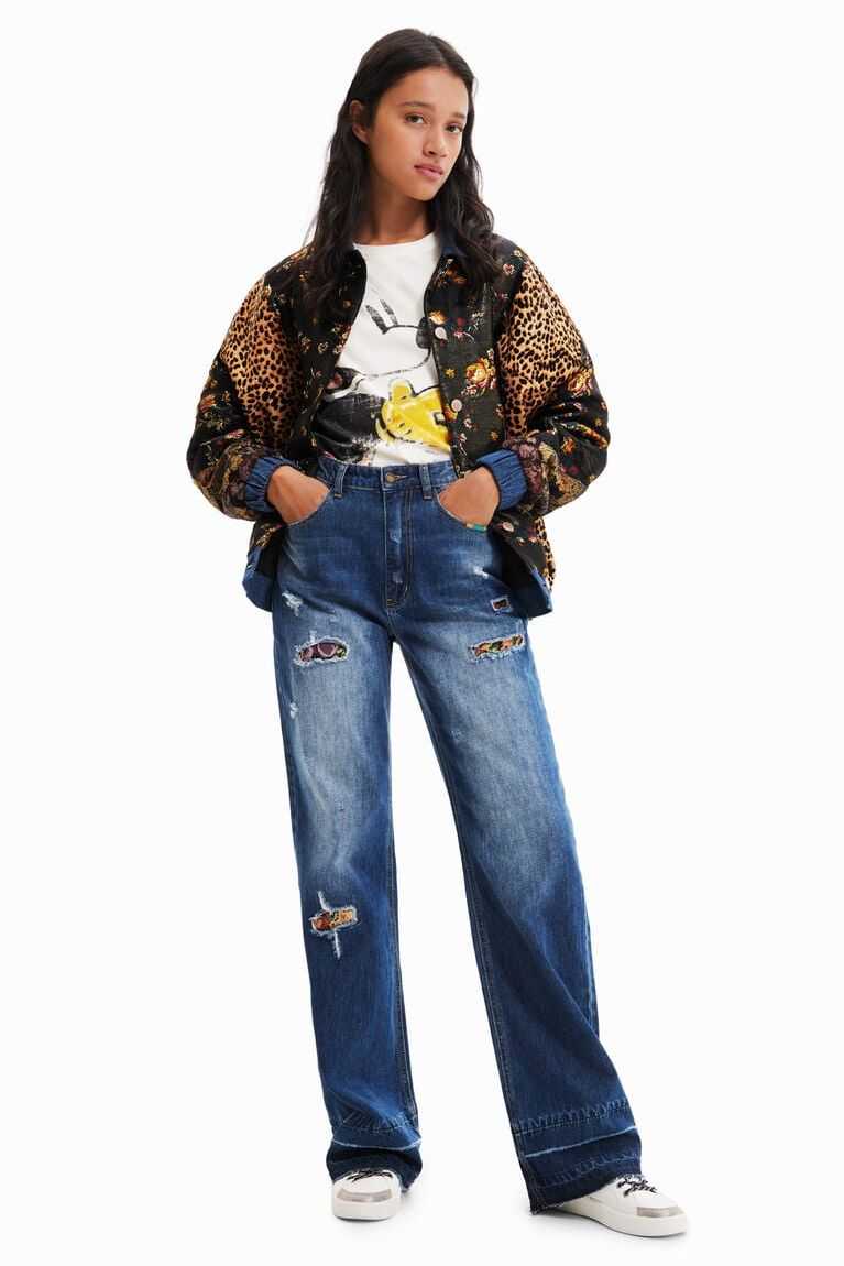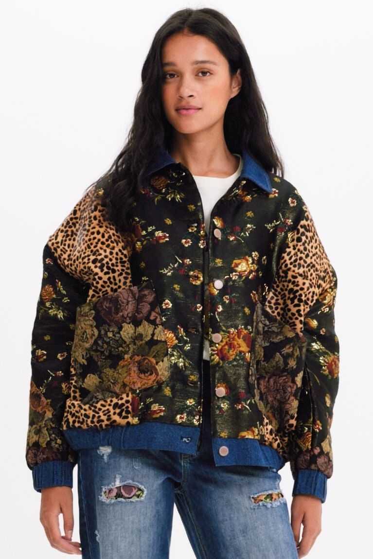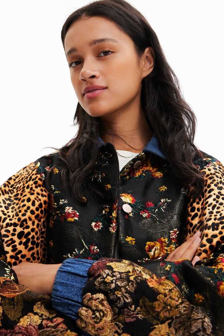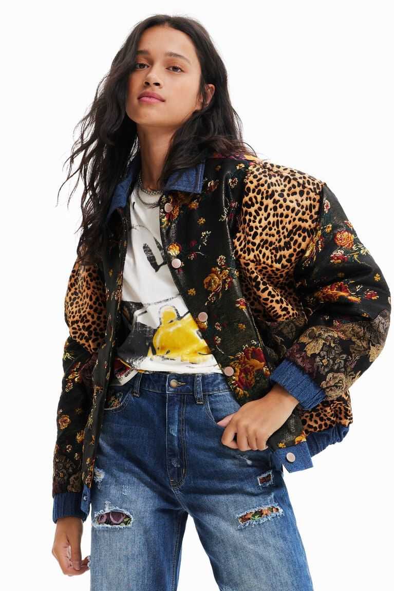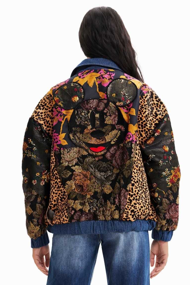 An oversize jacket with a patchwork of faux-fur in leopard print, floral jacquard and denim. Featuring a large patch of Disney's Mickey Mouse on the back.