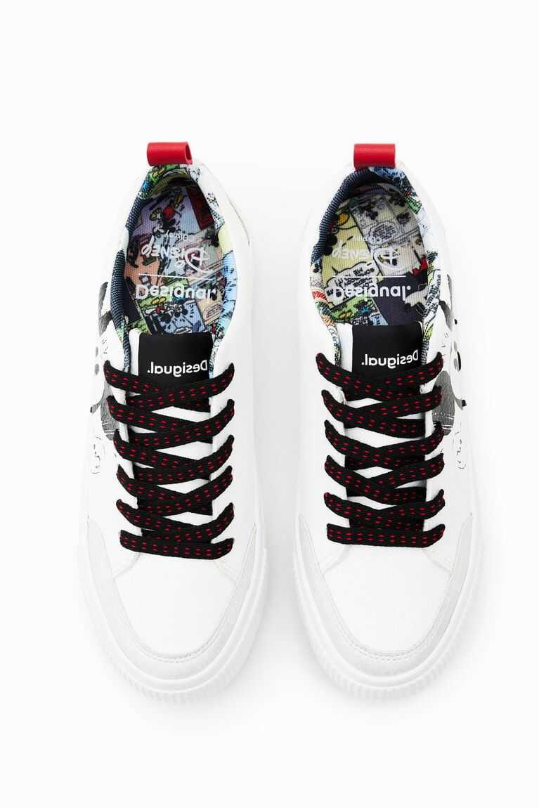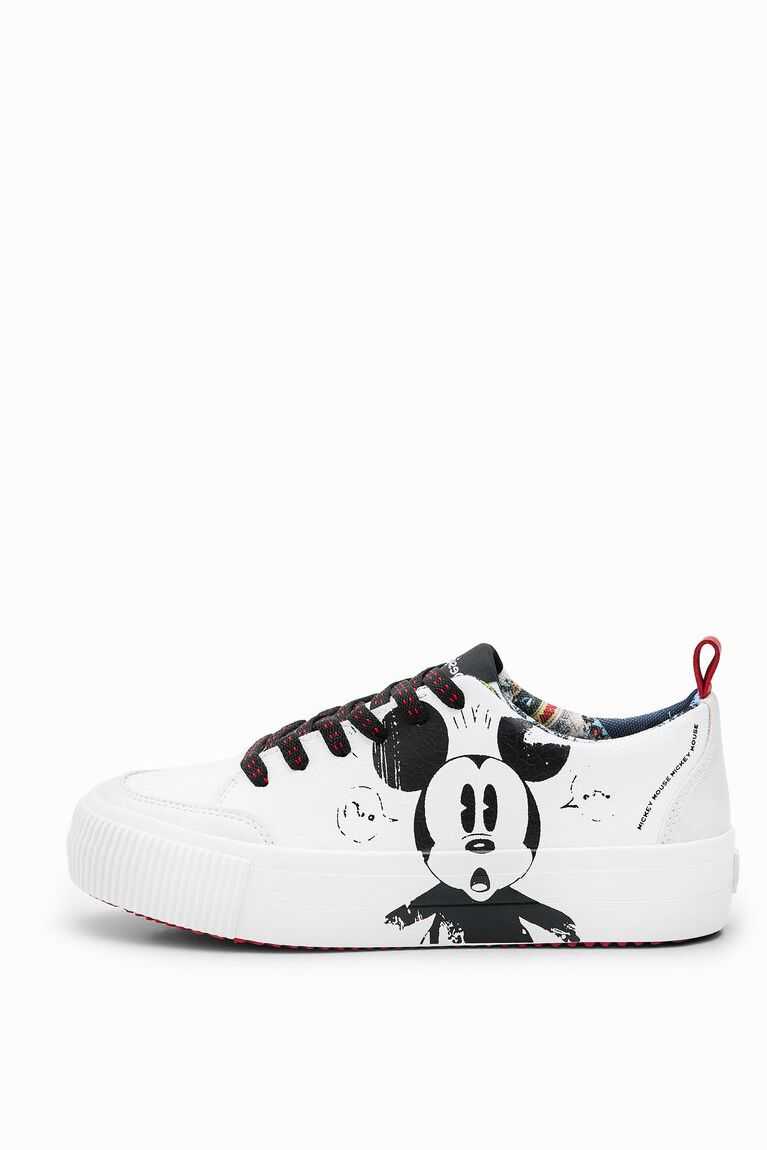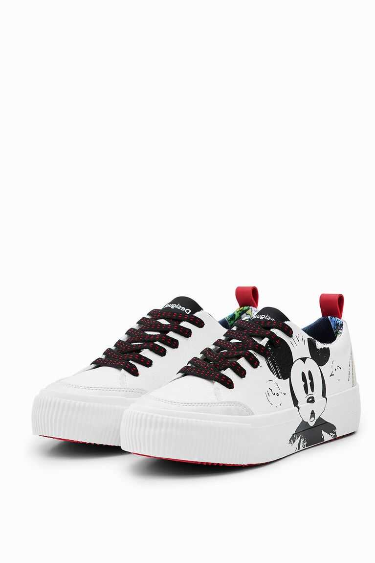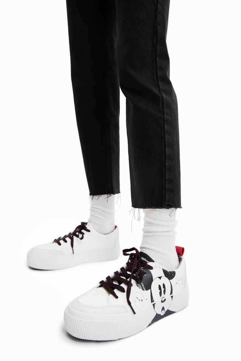 White platform sneakers with metallic details and a distressed-effect Disney's Mickey Mouse painted on the side. Featuring a red sole made from recycled rubber.