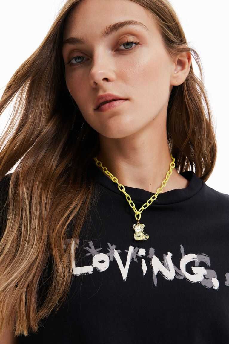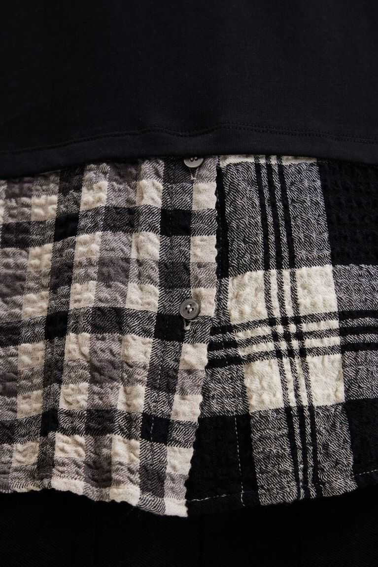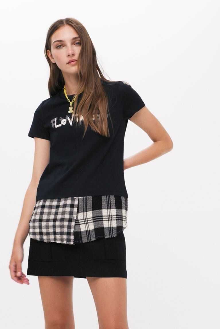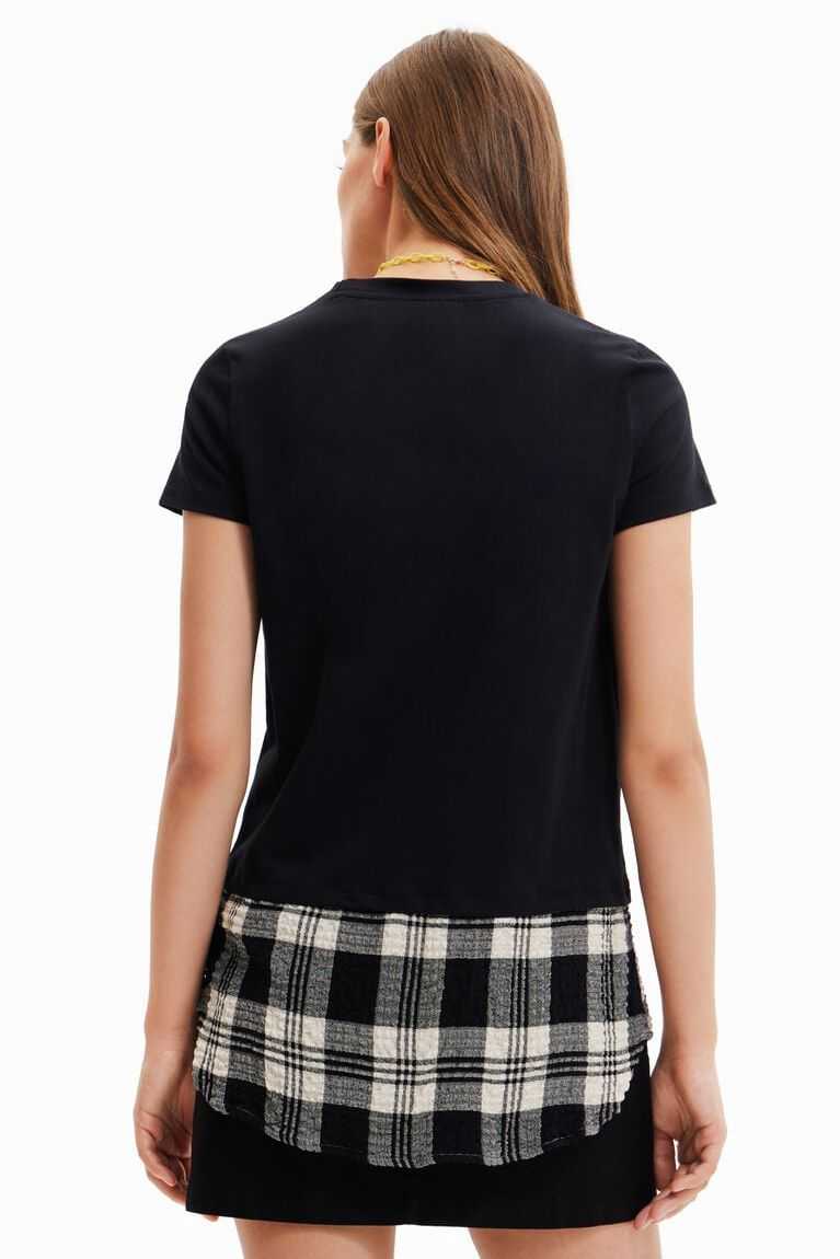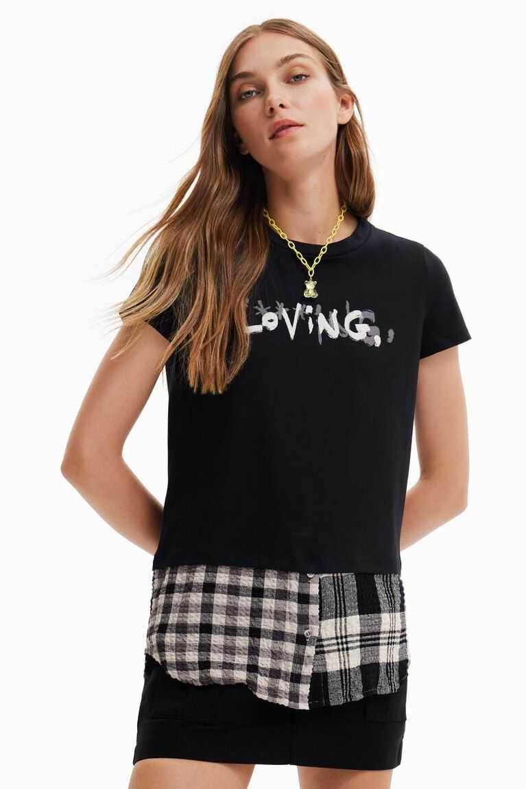 A double layer-effect short-sleeve T-shirt, with a message on the front and a buttoned shirt-style hem in plaid fabric.