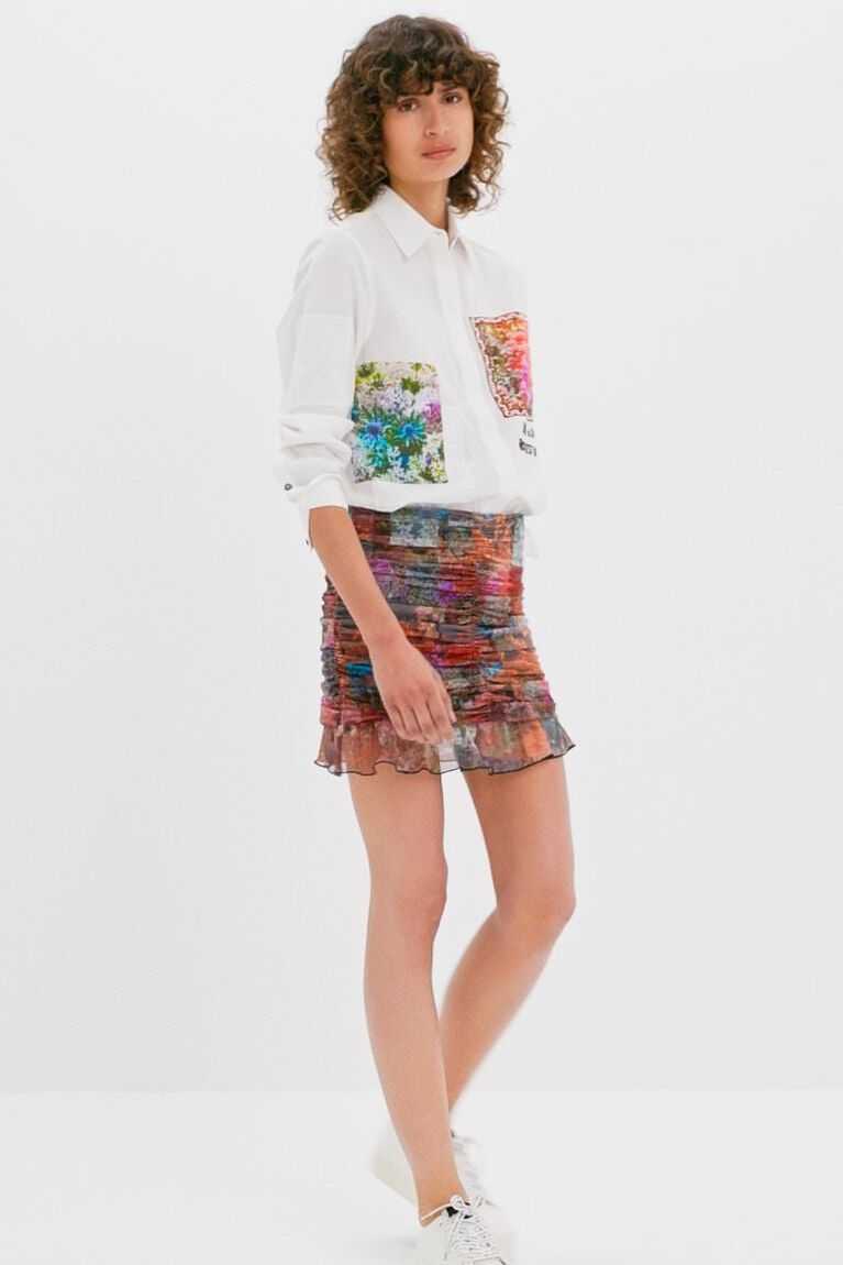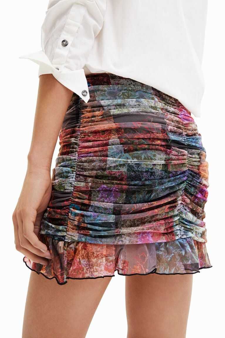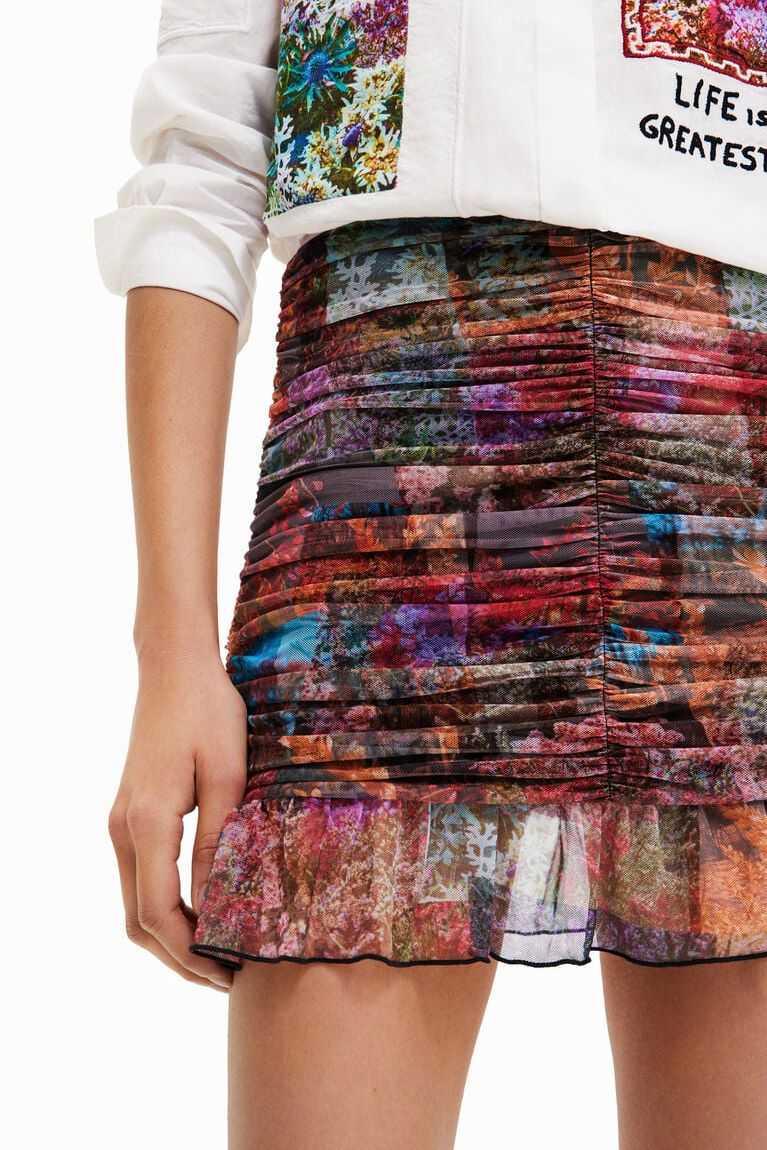 Crafted in a soft and very lightweight stretch fabric, this mini skirt features a digital floral patchwork print. Gathering and ruffles at the hem for more movement.
