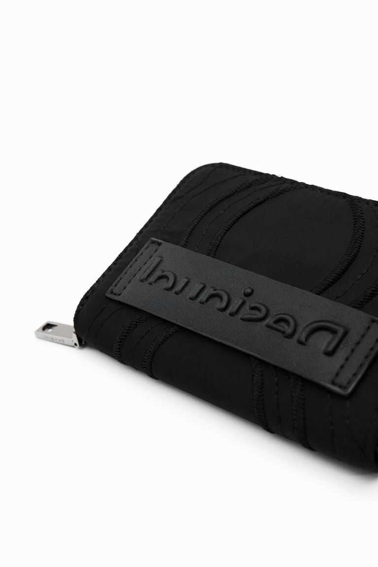 A plain-colour wallet made from a recycled-fibre fabric with embossed circles and a large logo on the front. Features multiple pockets and compartments.