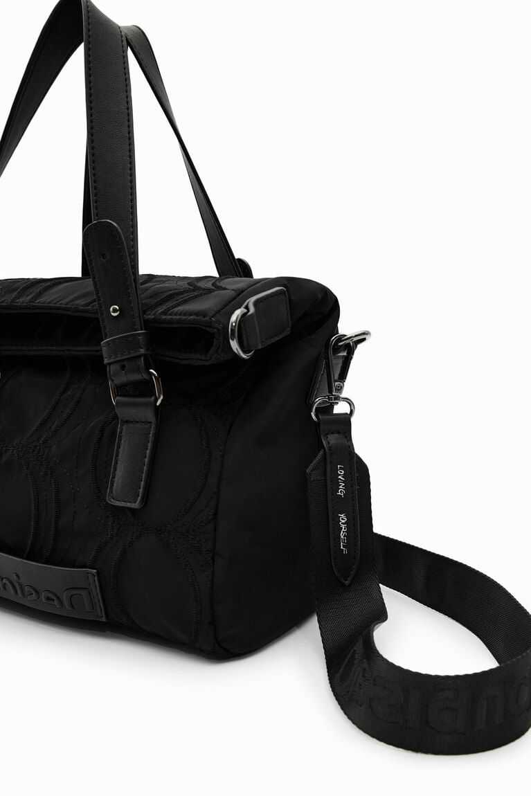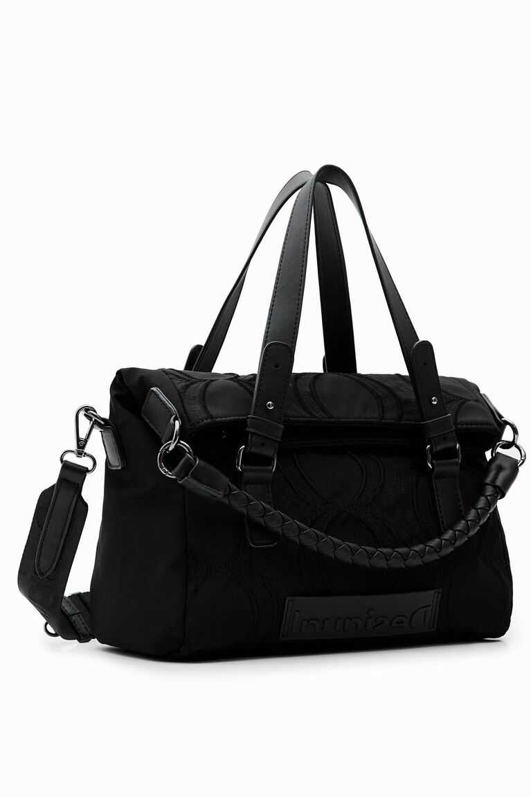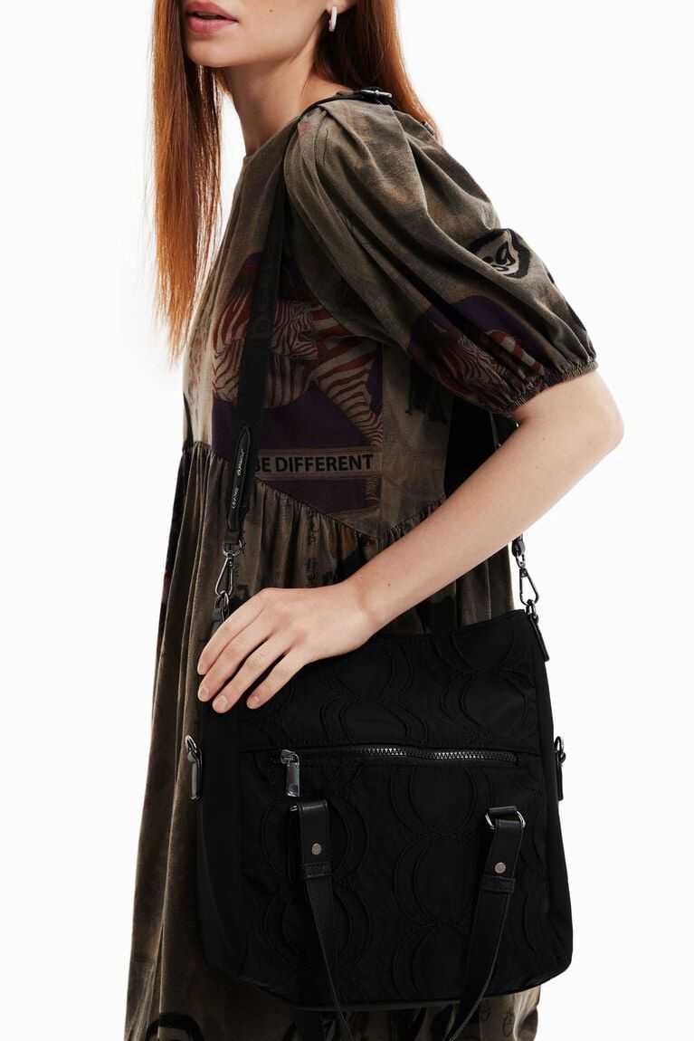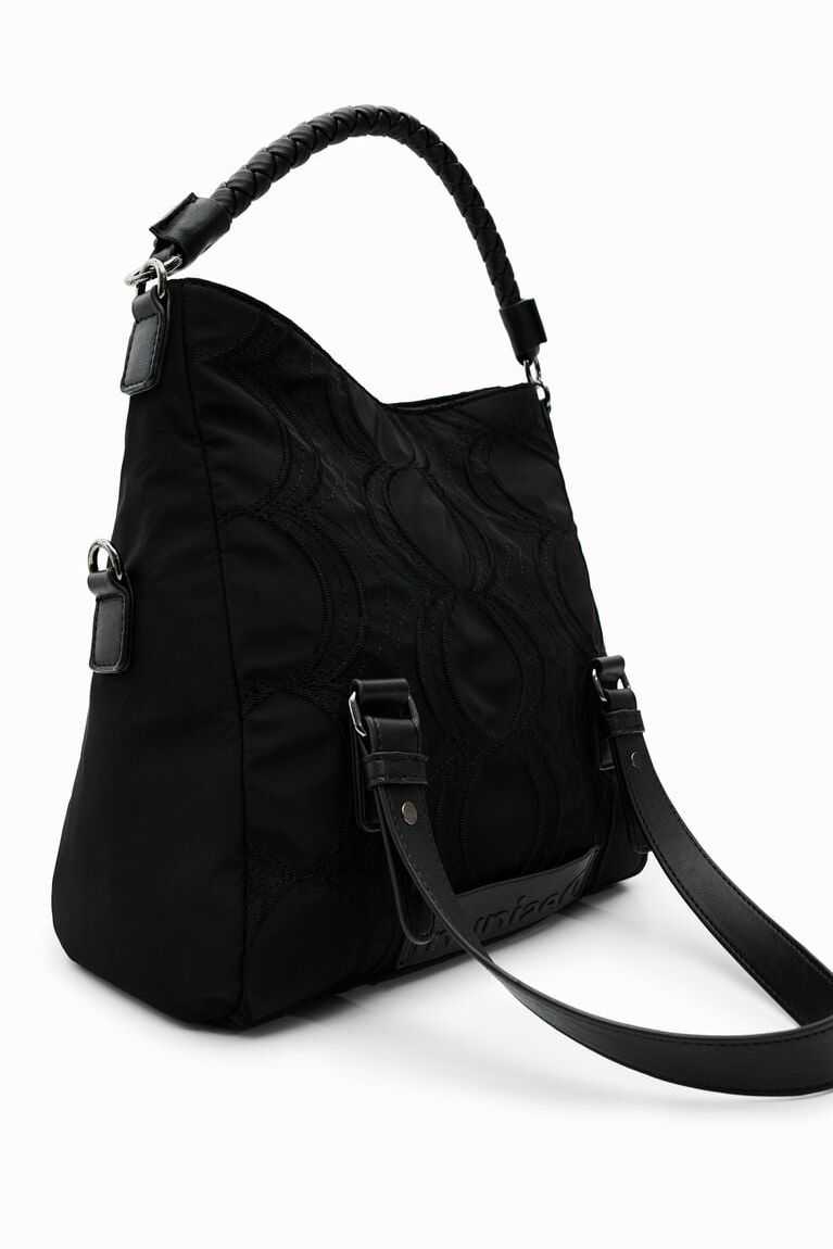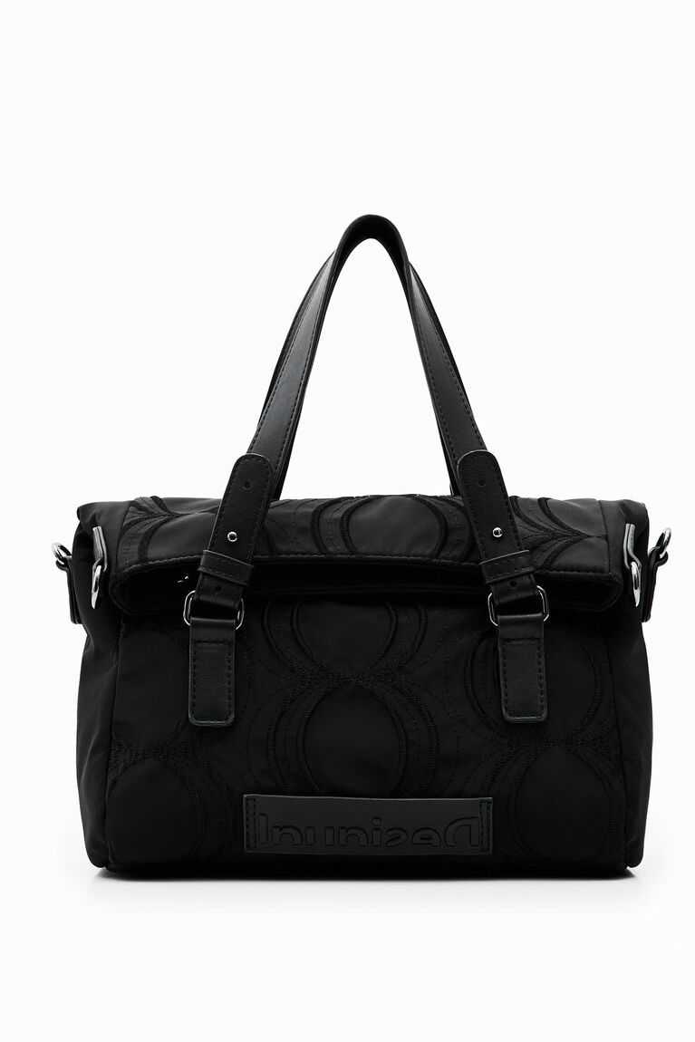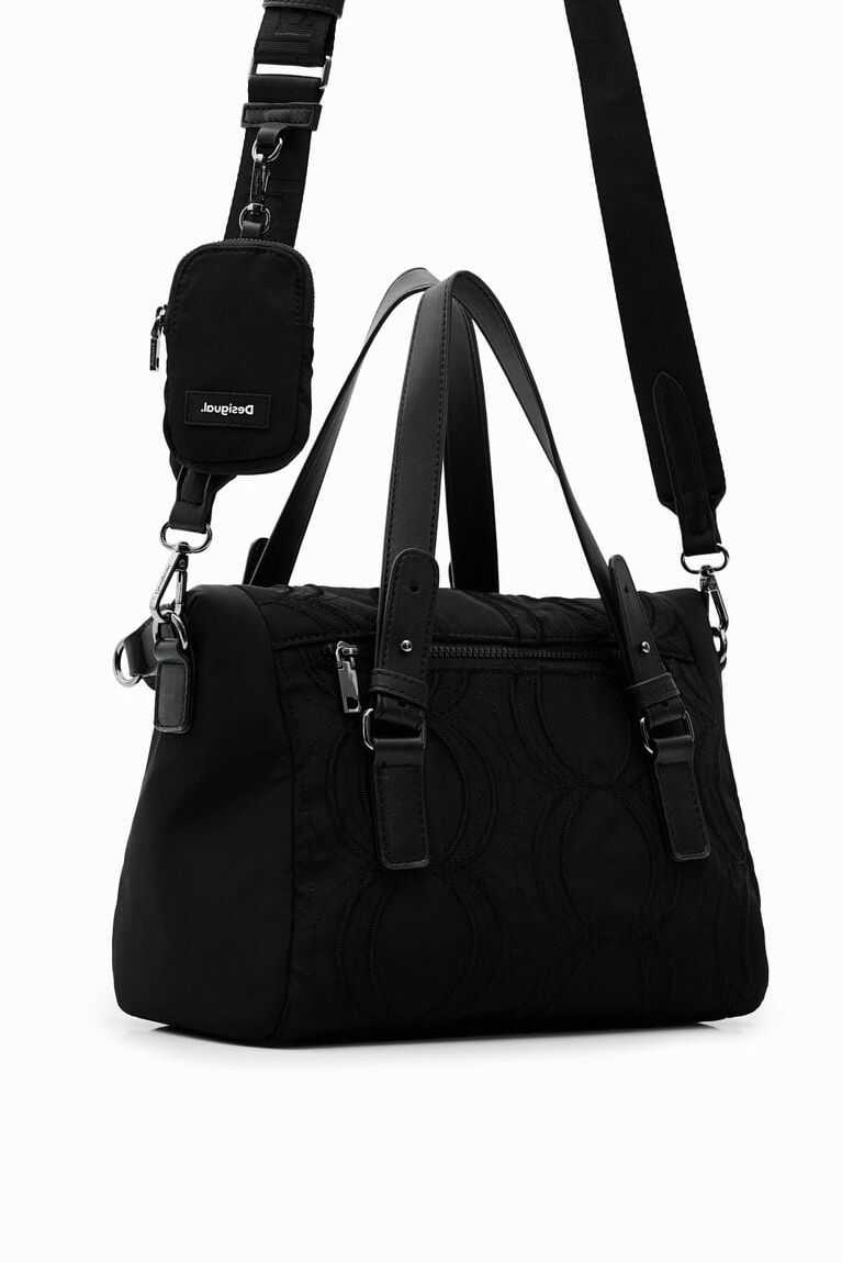 A highly versatile handbag, made from recycled fibres that create a plain-colour fabric embossed with circles. Features multiple handles.