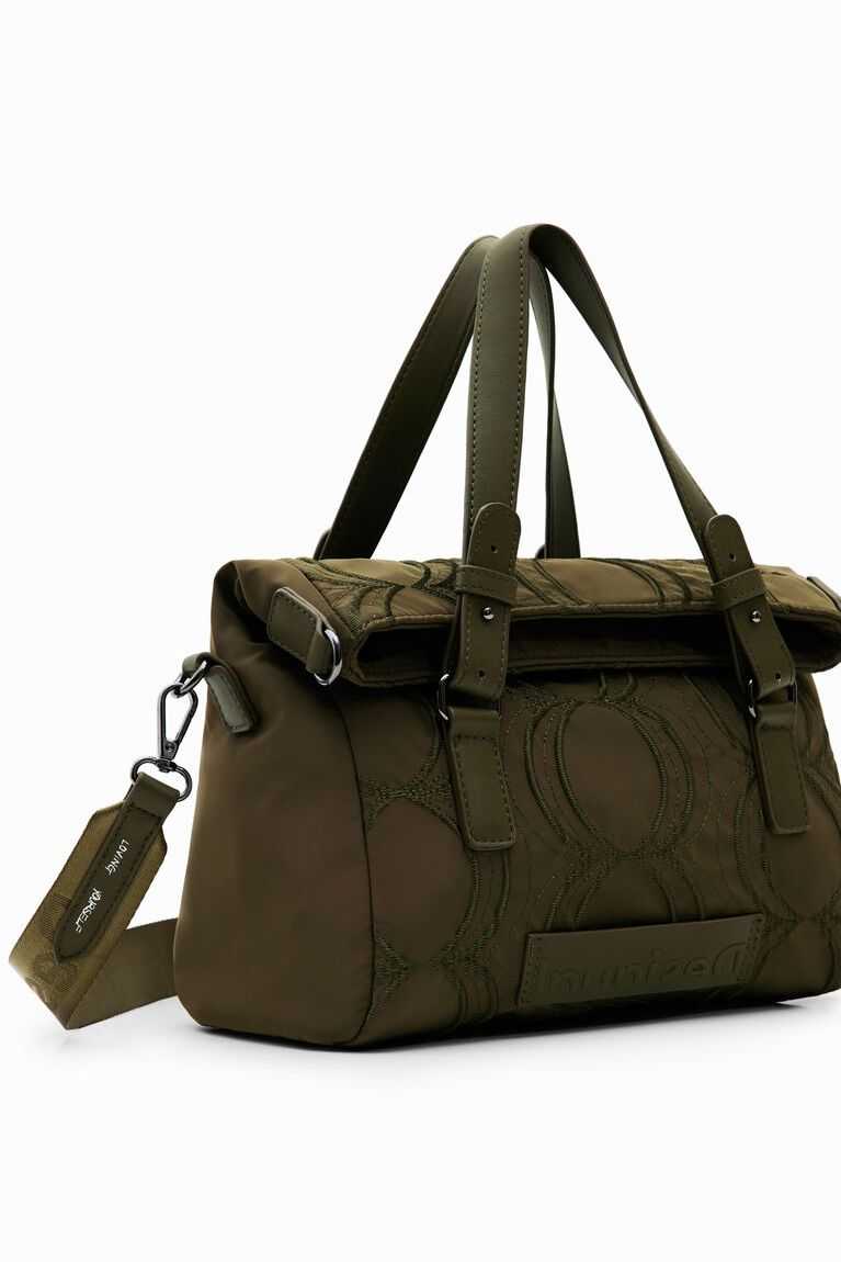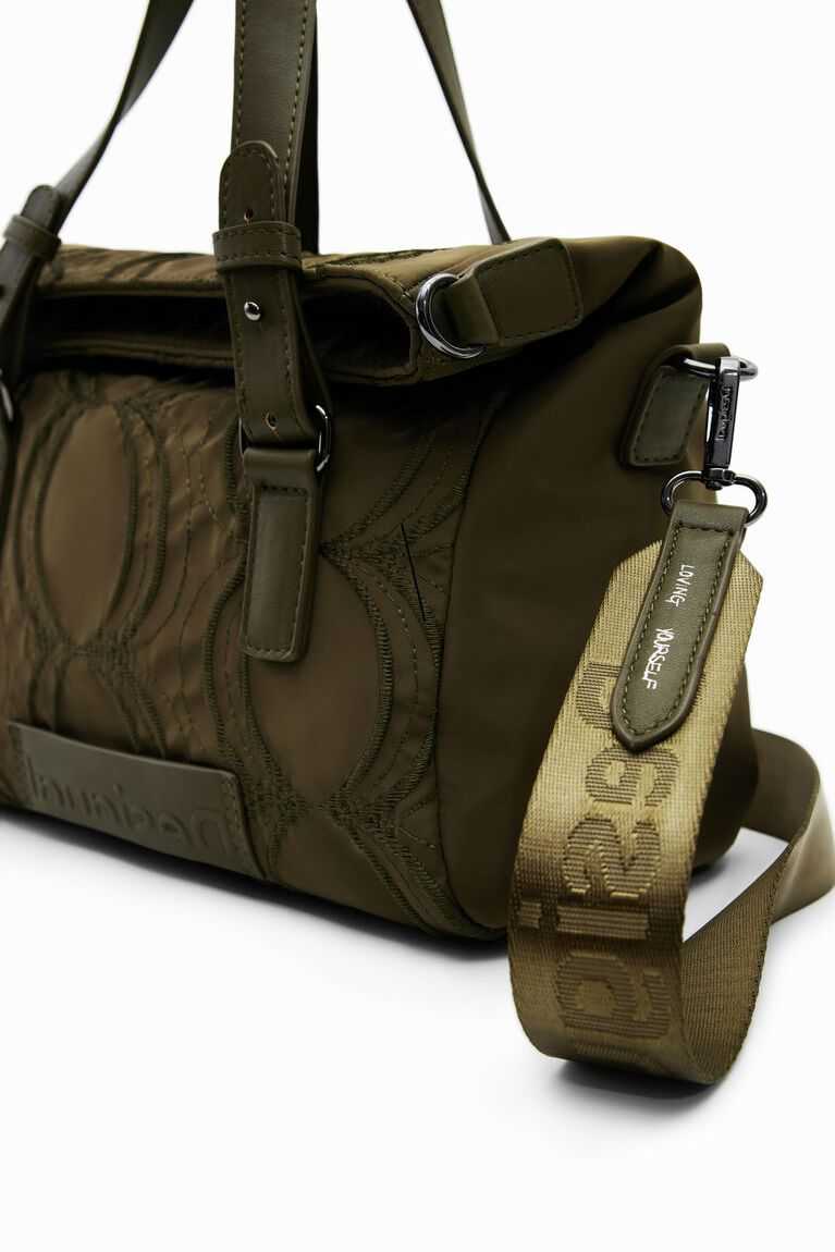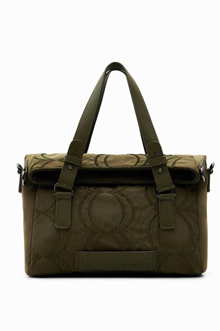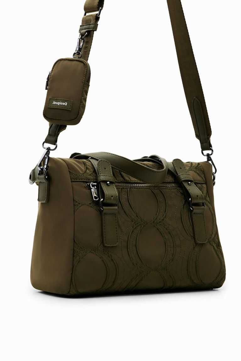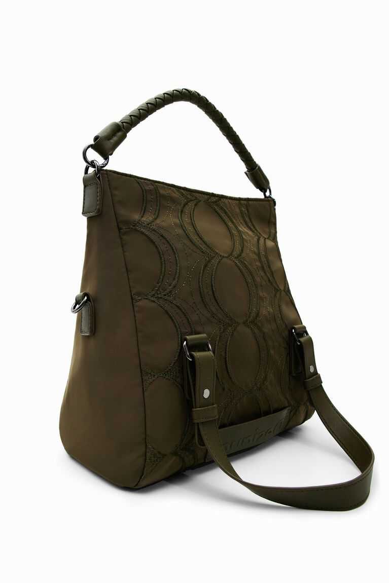 A highly versatile handbag, made from recycled fibres that create a plain-colour fabric embossed with circles. Features multiple handles.