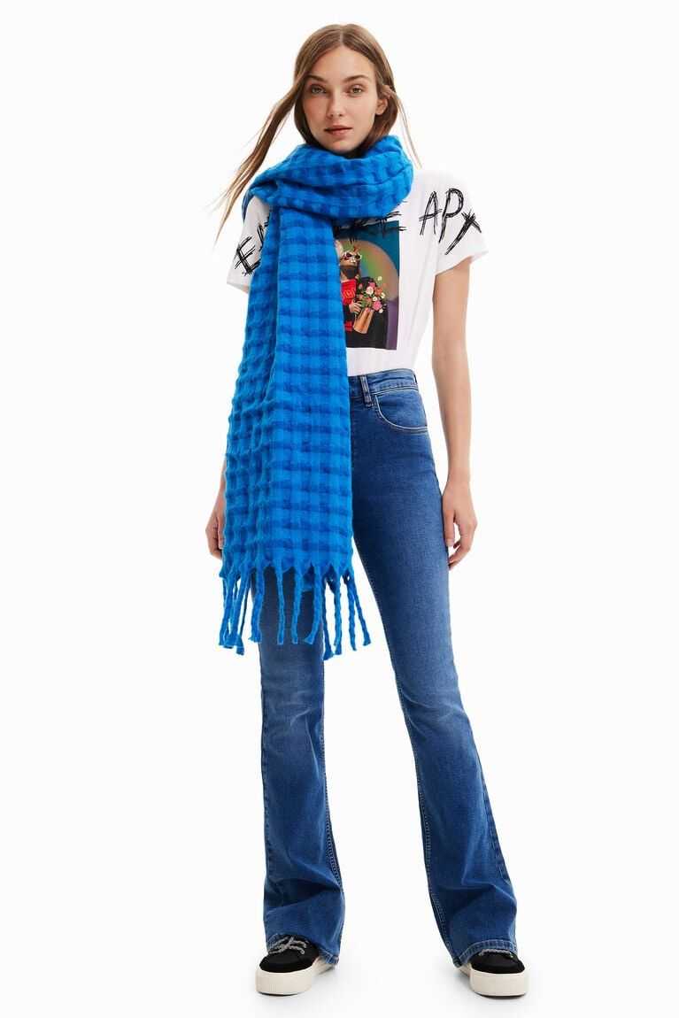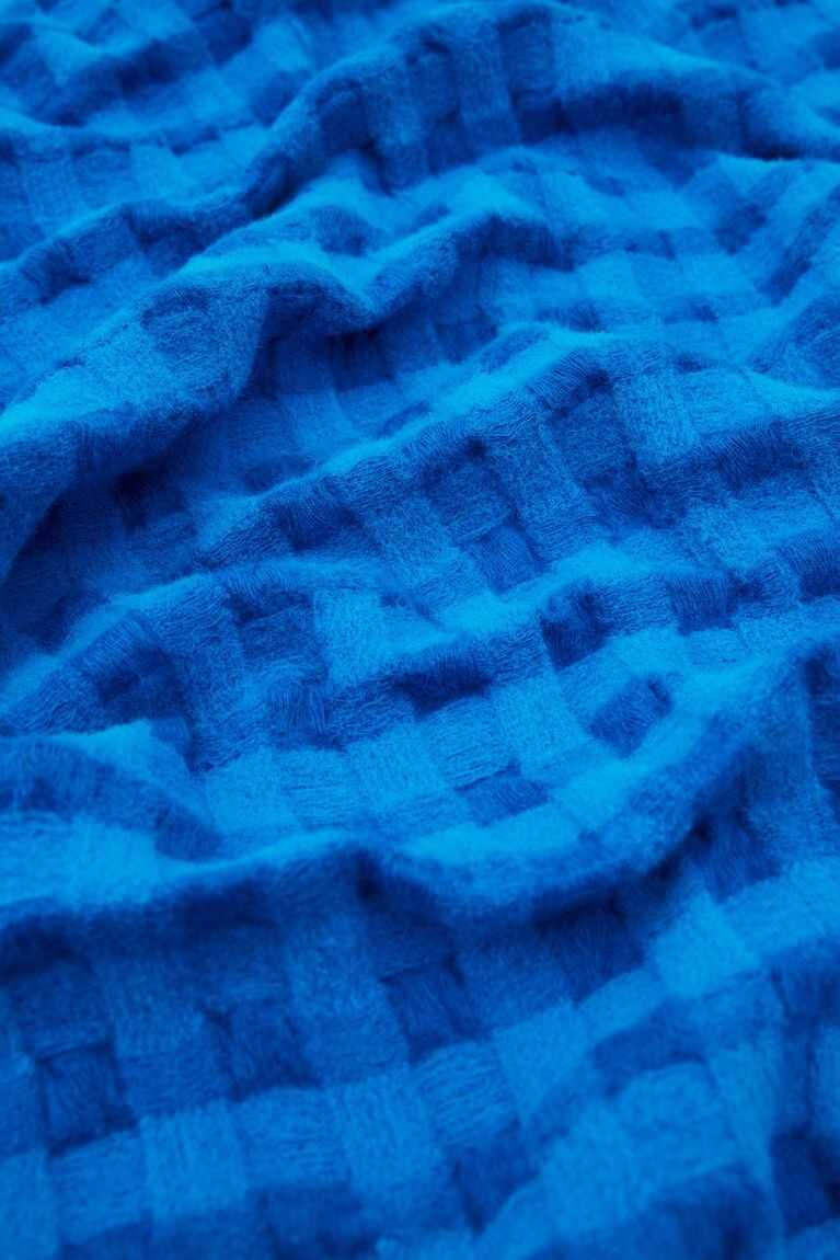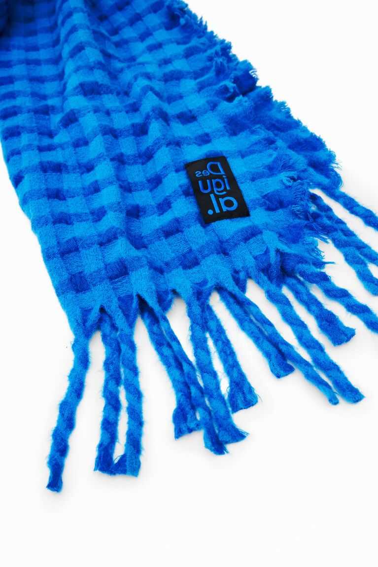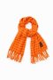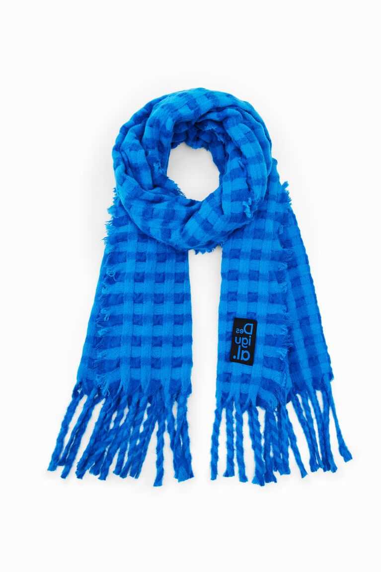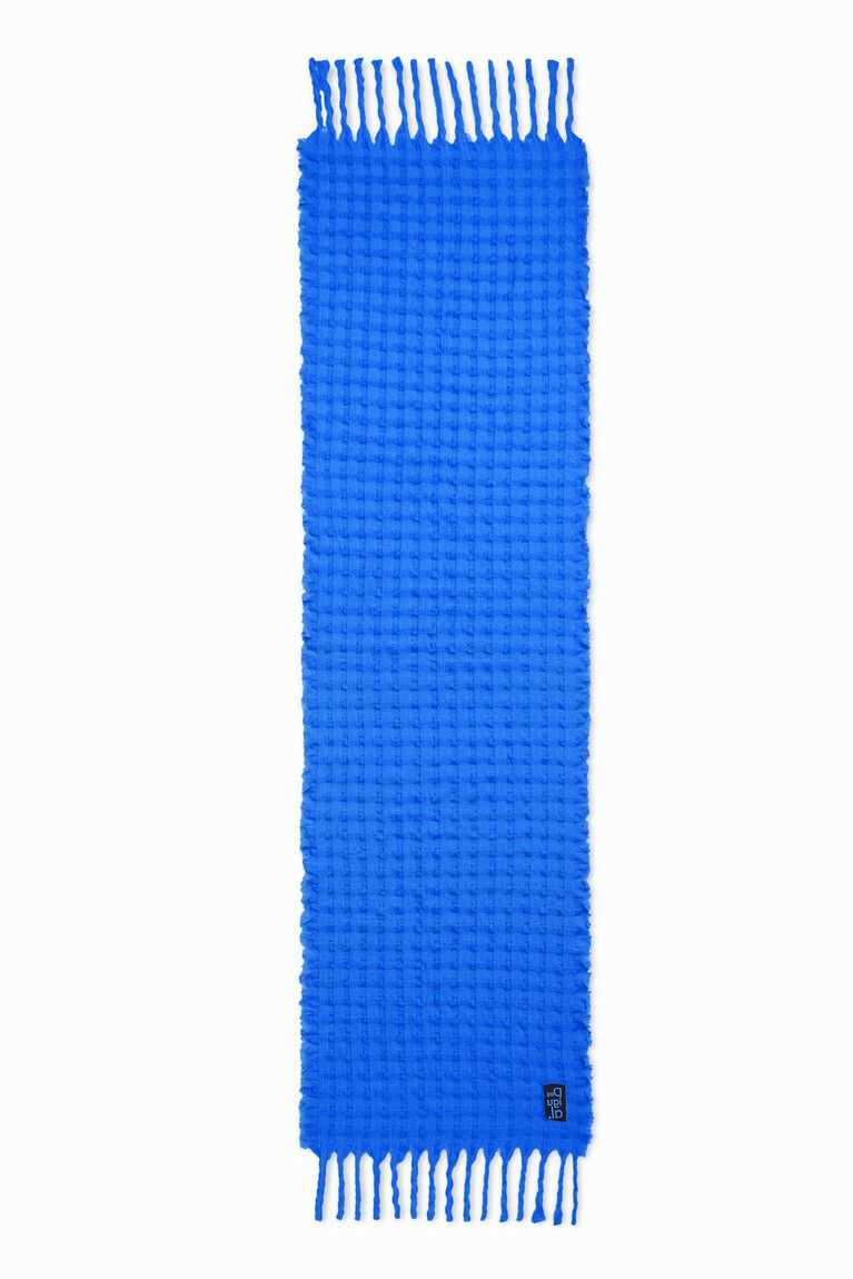 A scarf made from recycled fibres with an embossed texture and fringing on the ends. In a striking colour to match other accessories from the collection.