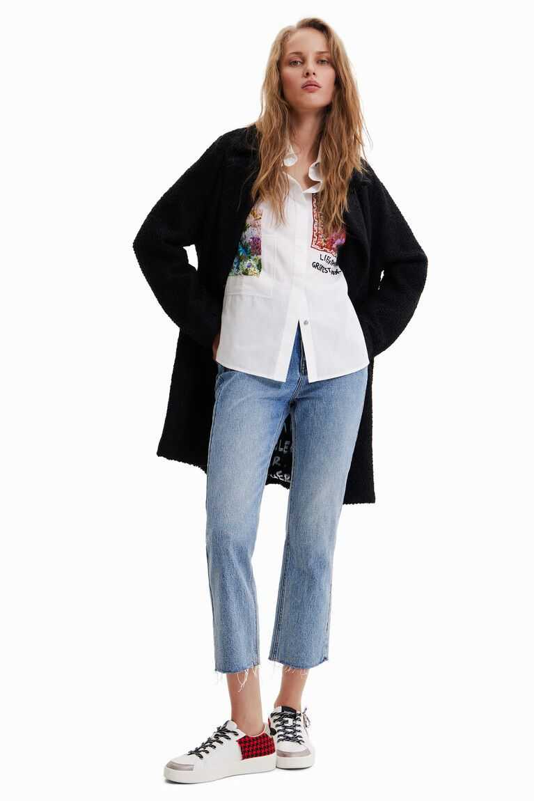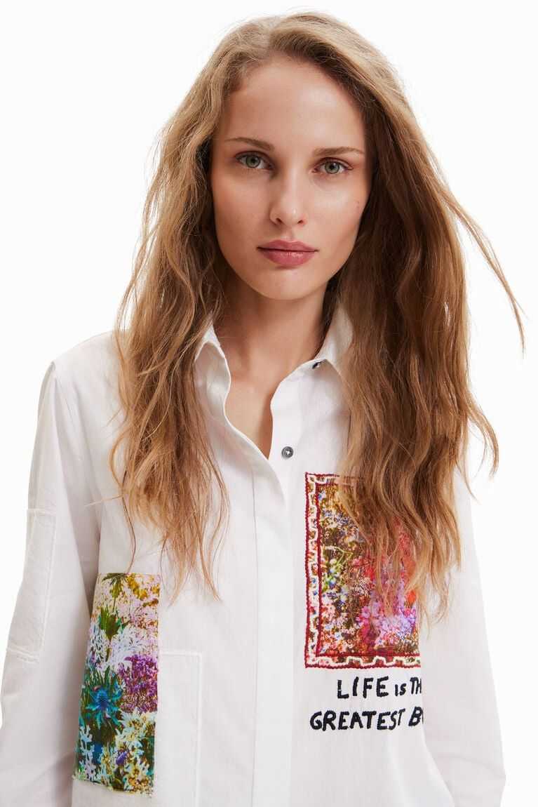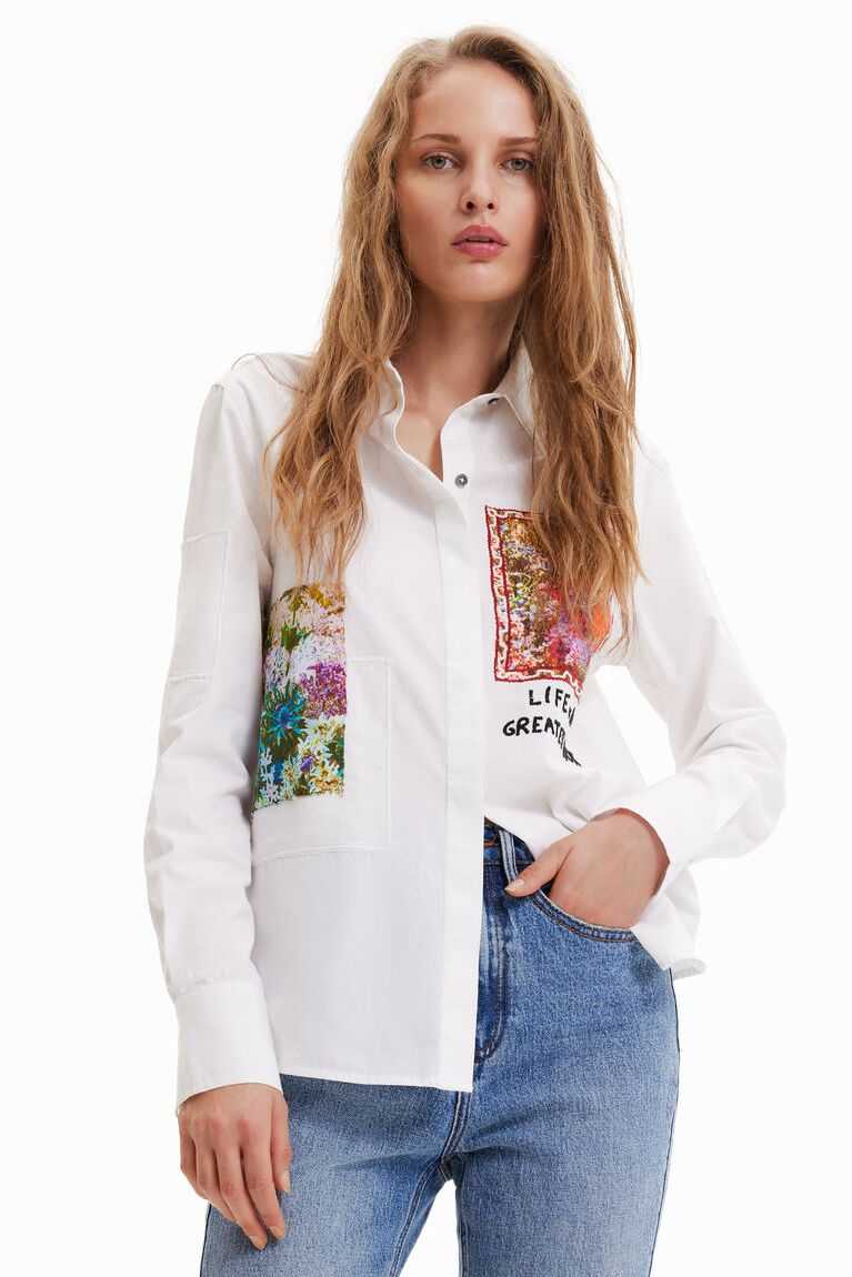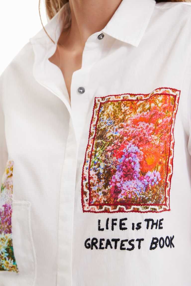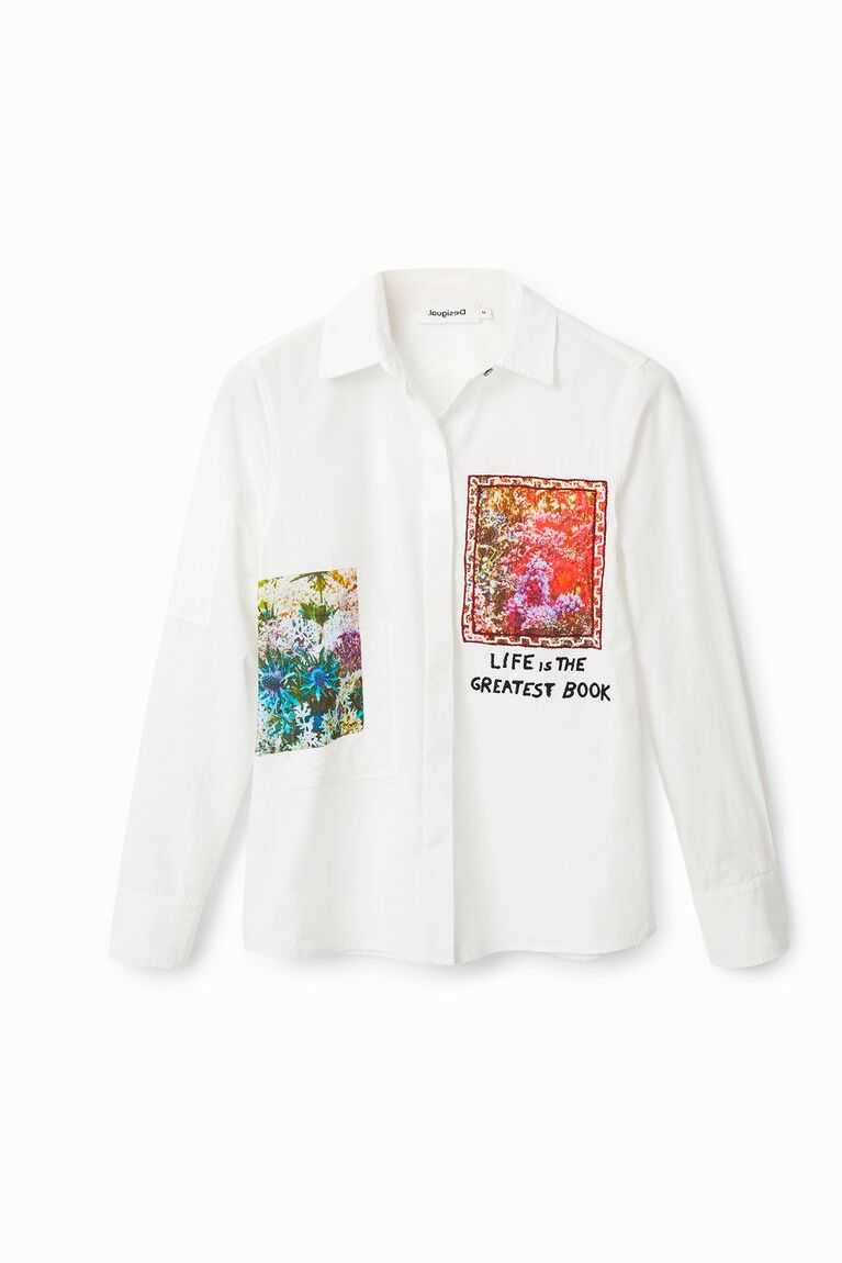 With embroidered patches in vivid colours, this shirt spreads the message "Life is the greatest book" which is embroidered on the front. Made from more sustainable cotton.