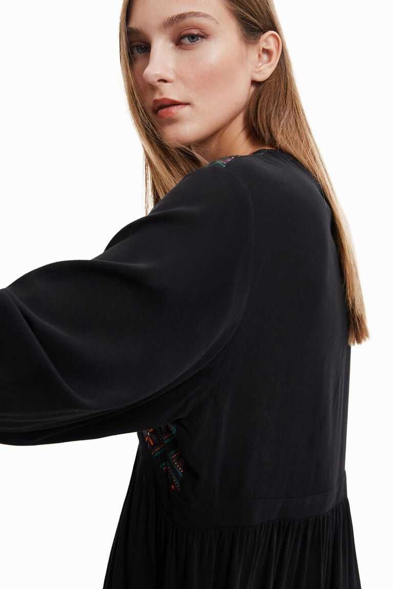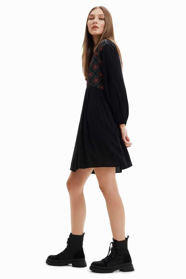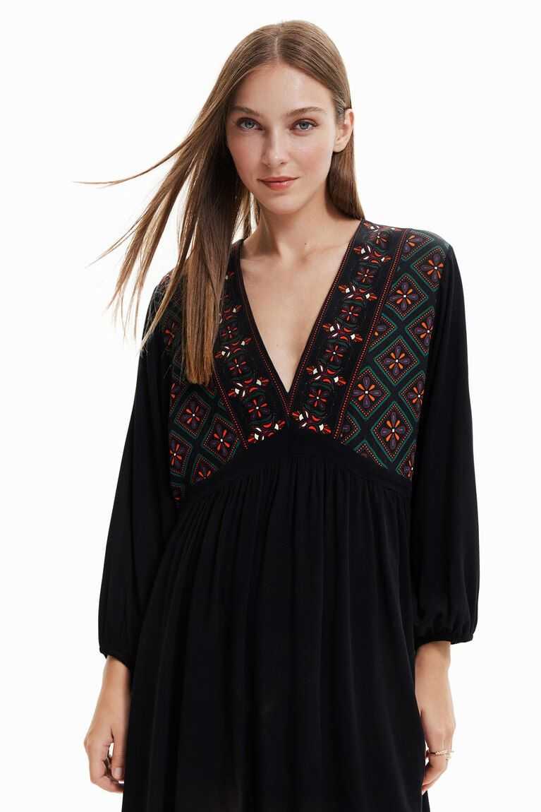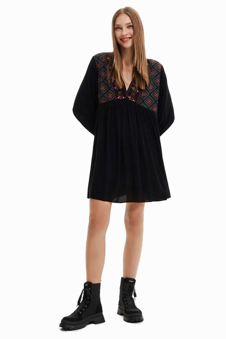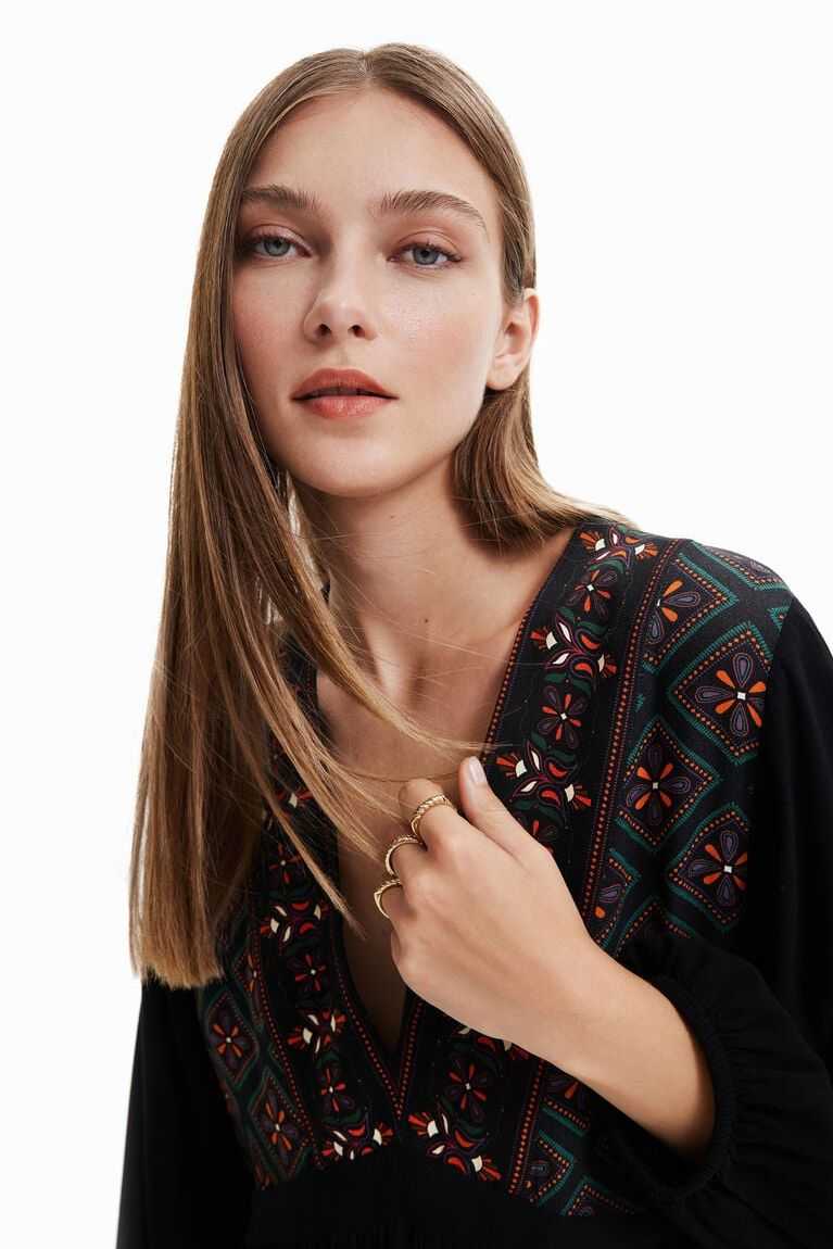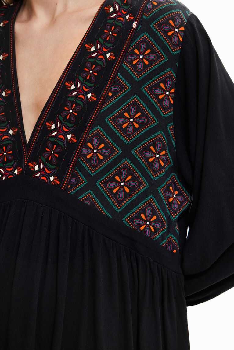 A short dress with 3/4 sleeves and a V-neck adorned with a geometric print. Made with eco-friendly fibres.
