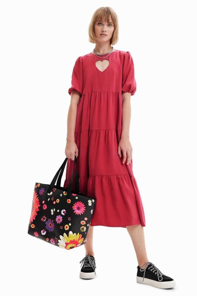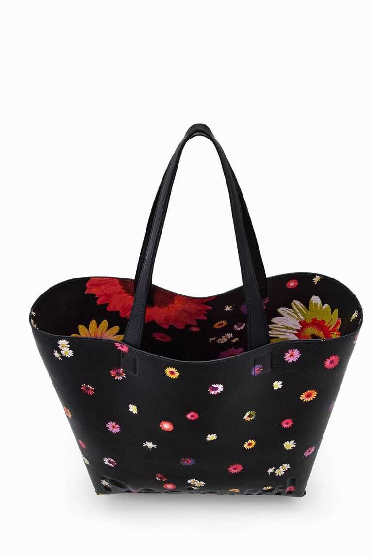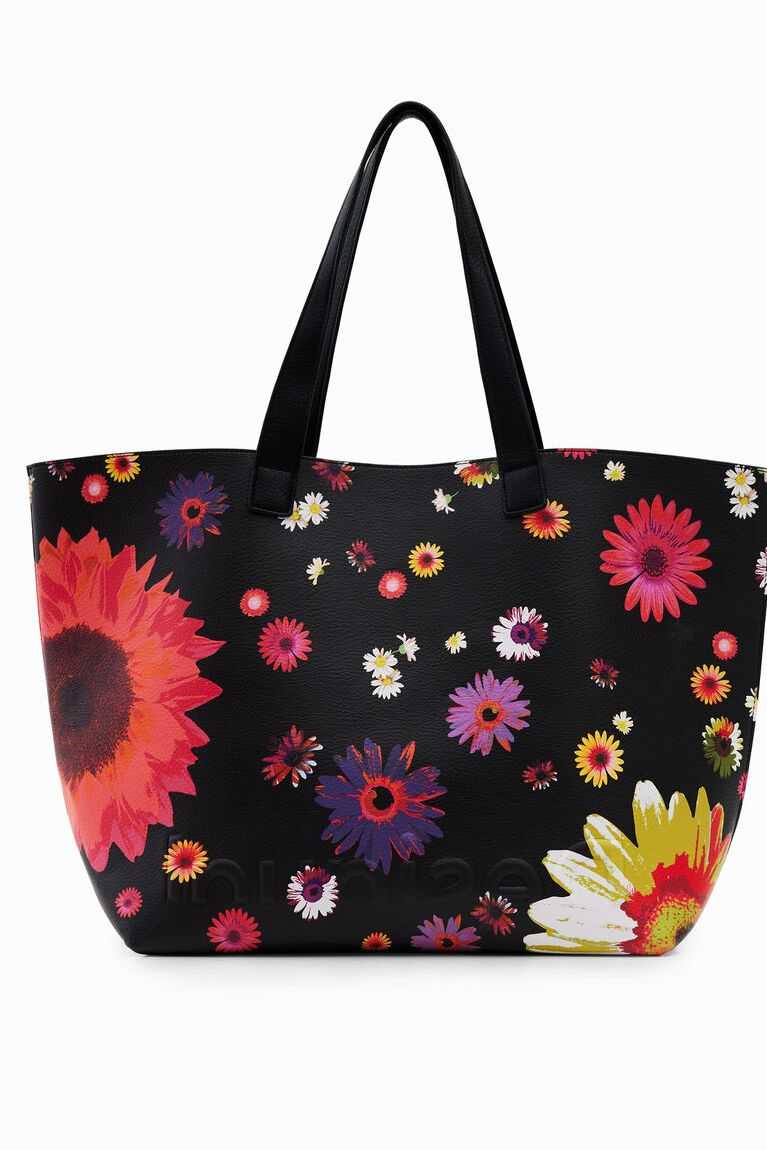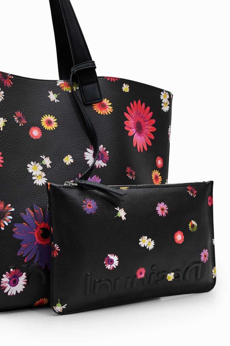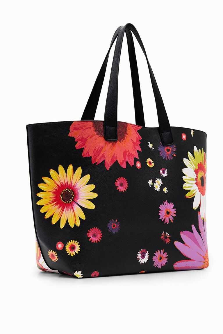 A large-capacity reversible shopper bag. Floral on one side and polka dot on the other. Contains a toiletry bag that doubles as a pocket. Very light.