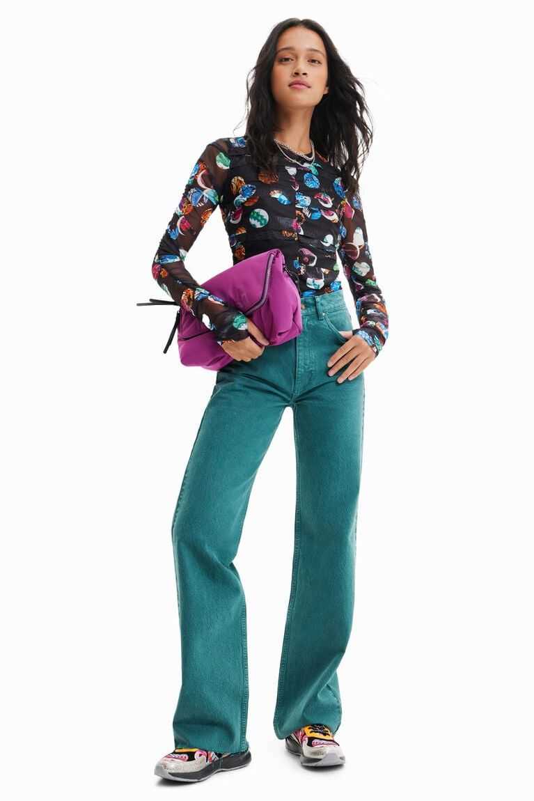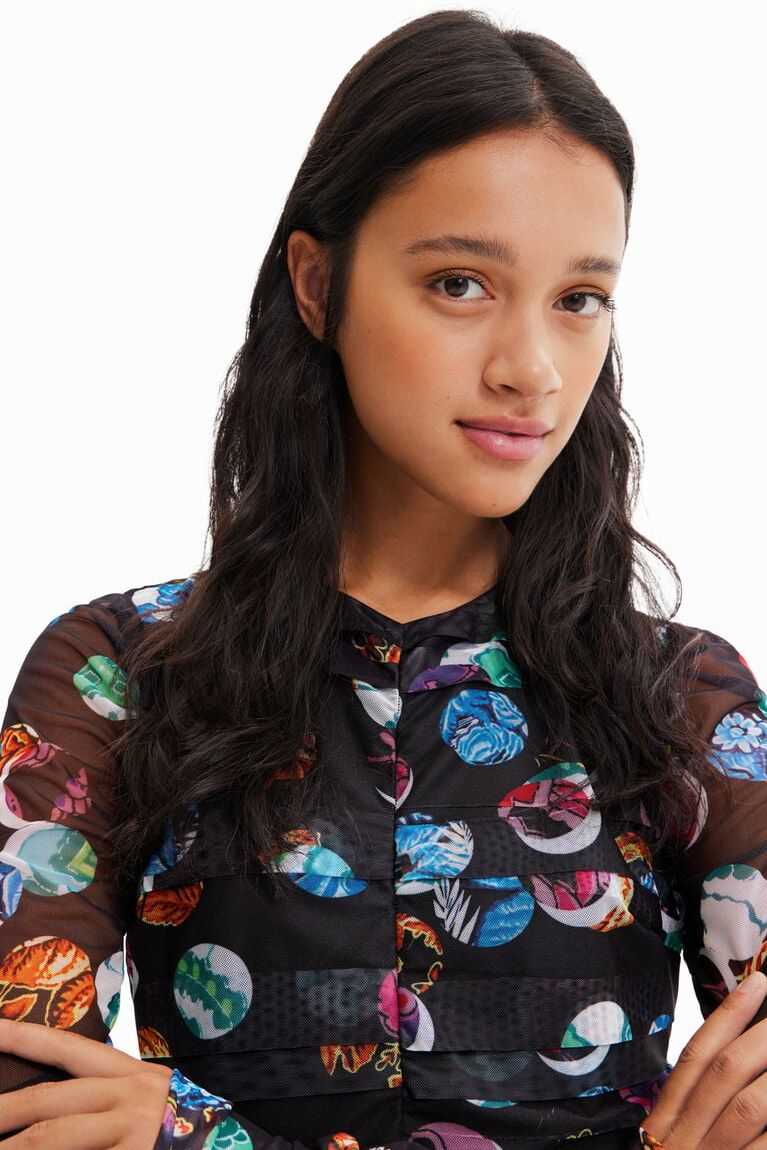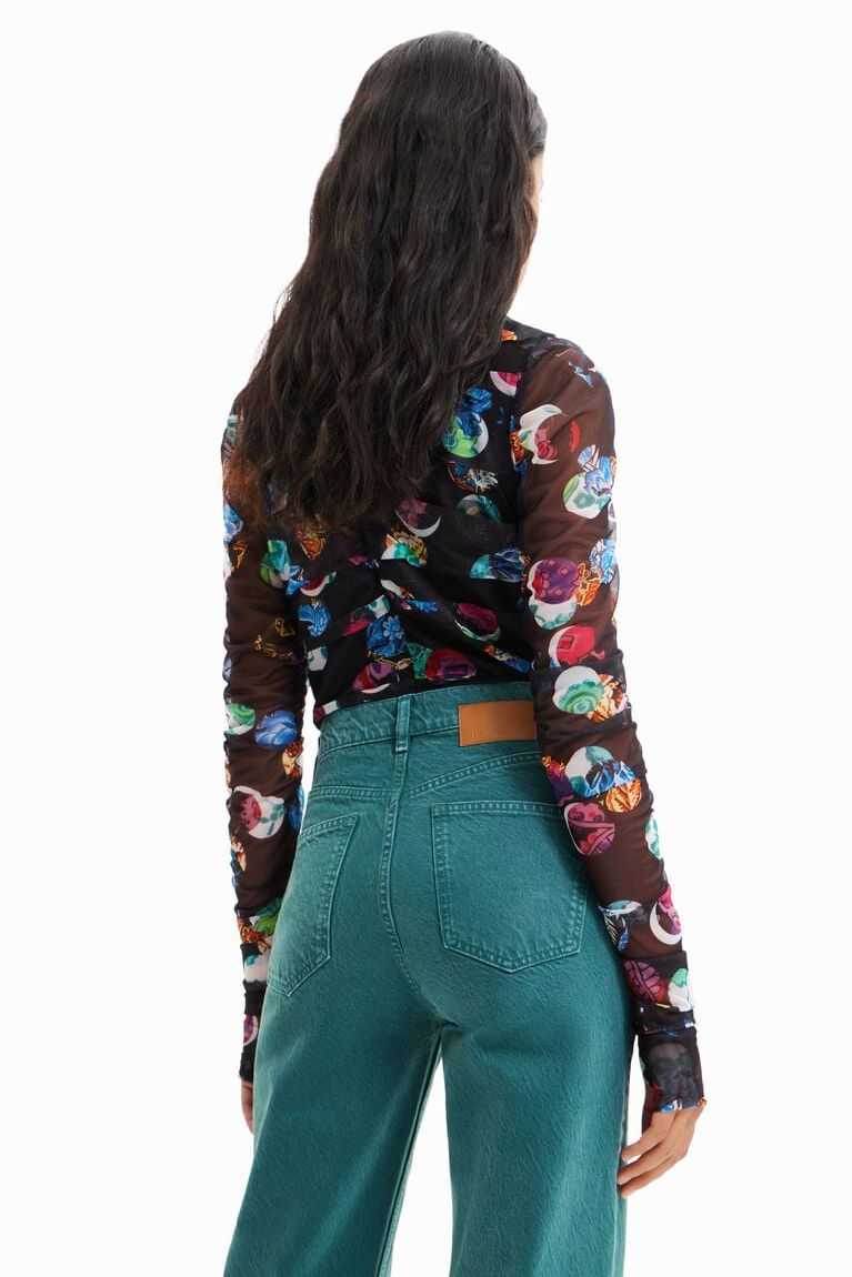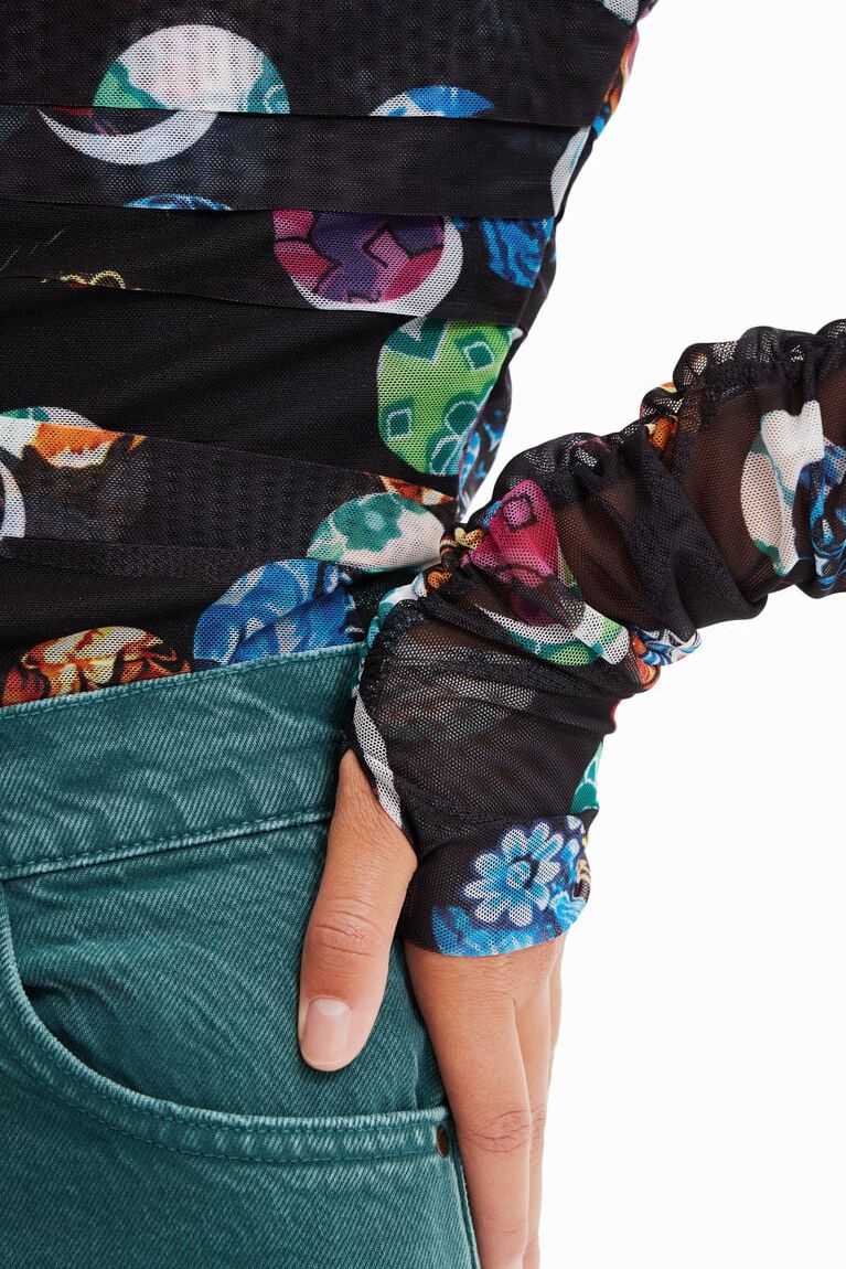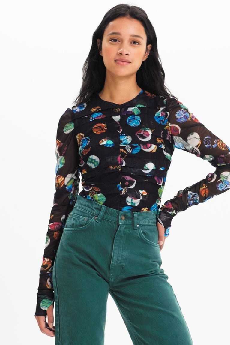 Multicoloured polka dots in digital print on tulle are the focal point of this body with central draping. Made from eco-friendly fibres with long sleeves and snap fasteners at the bottom.