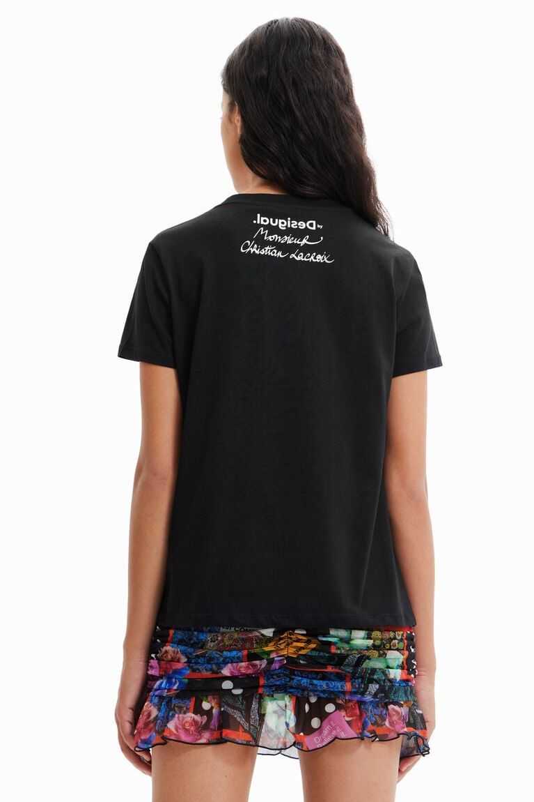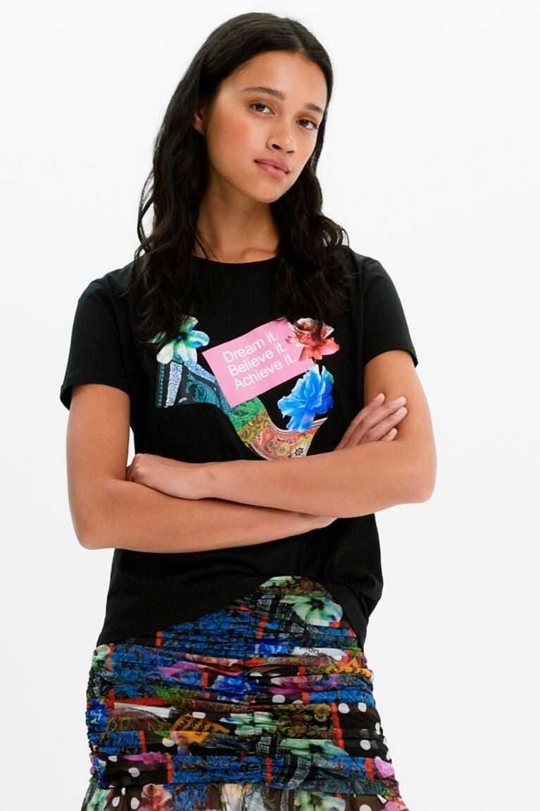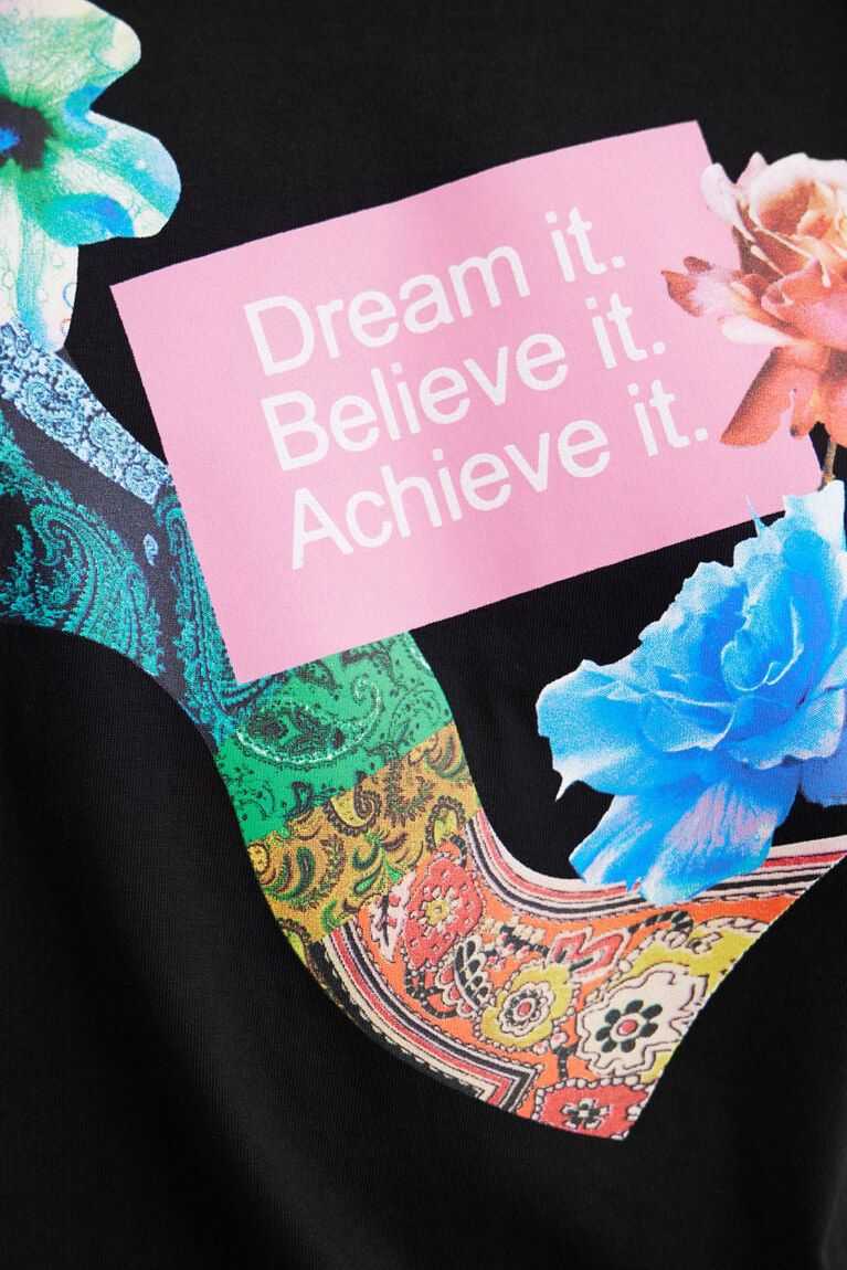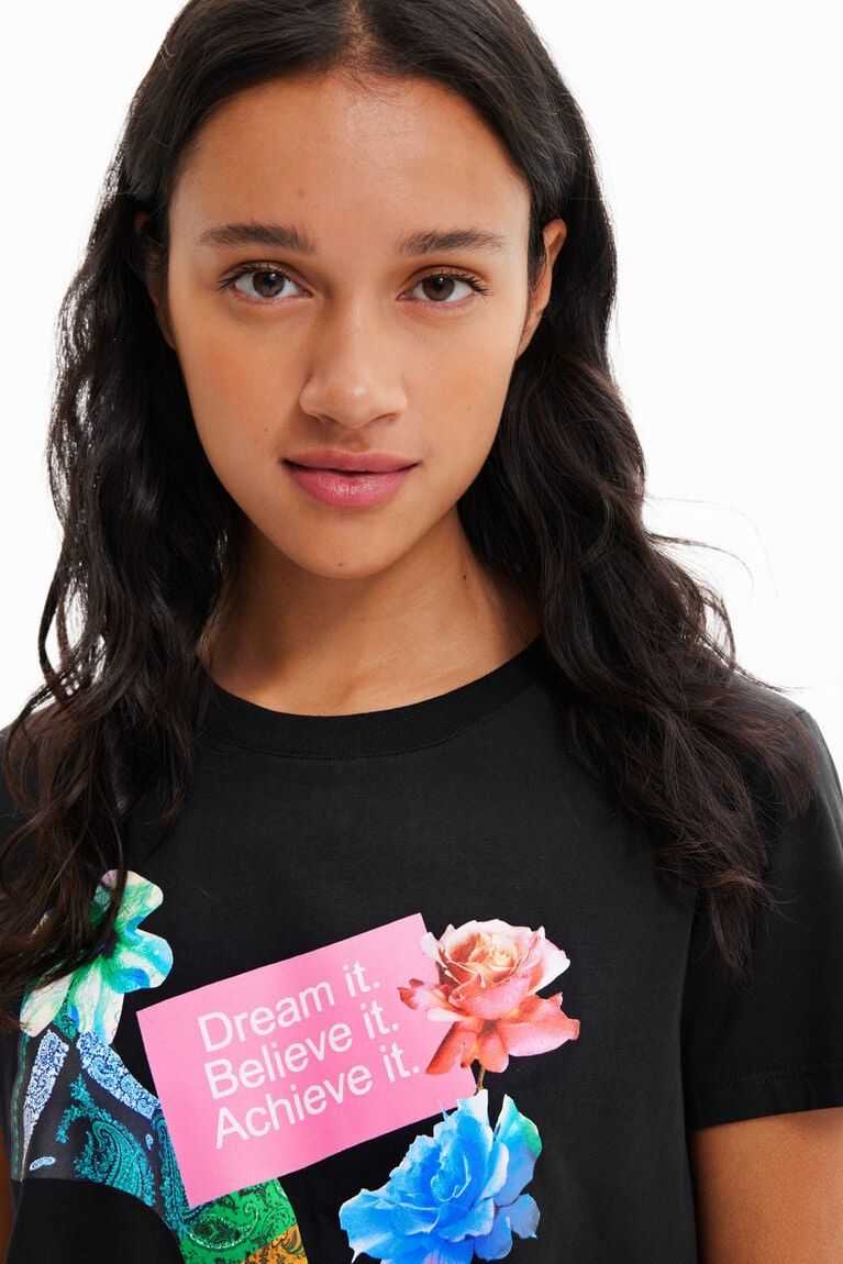 A basic T-shirt with a floral print and a joyful and inspiring message: "Dream it. Believe it. Achieve it." on the chest. Designed by M. Christian Lacroix.