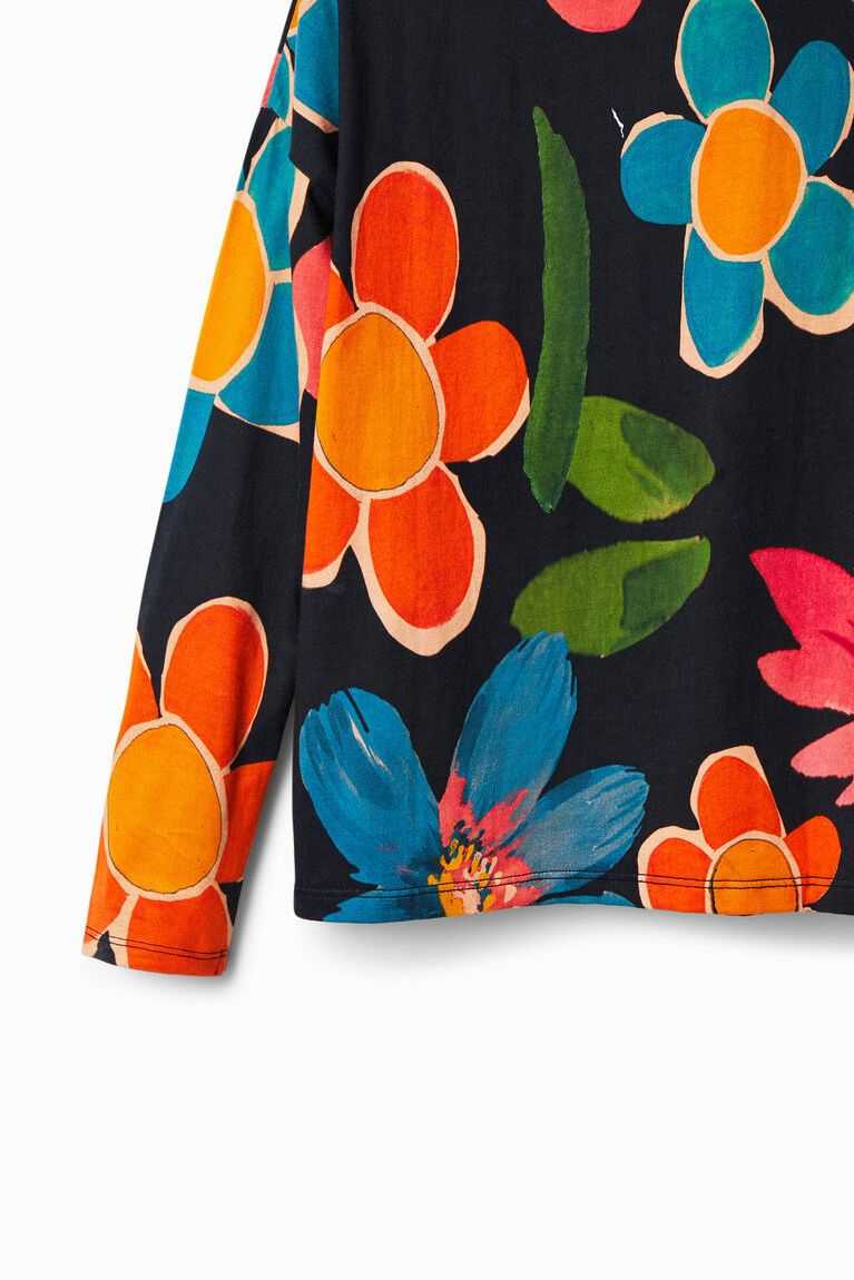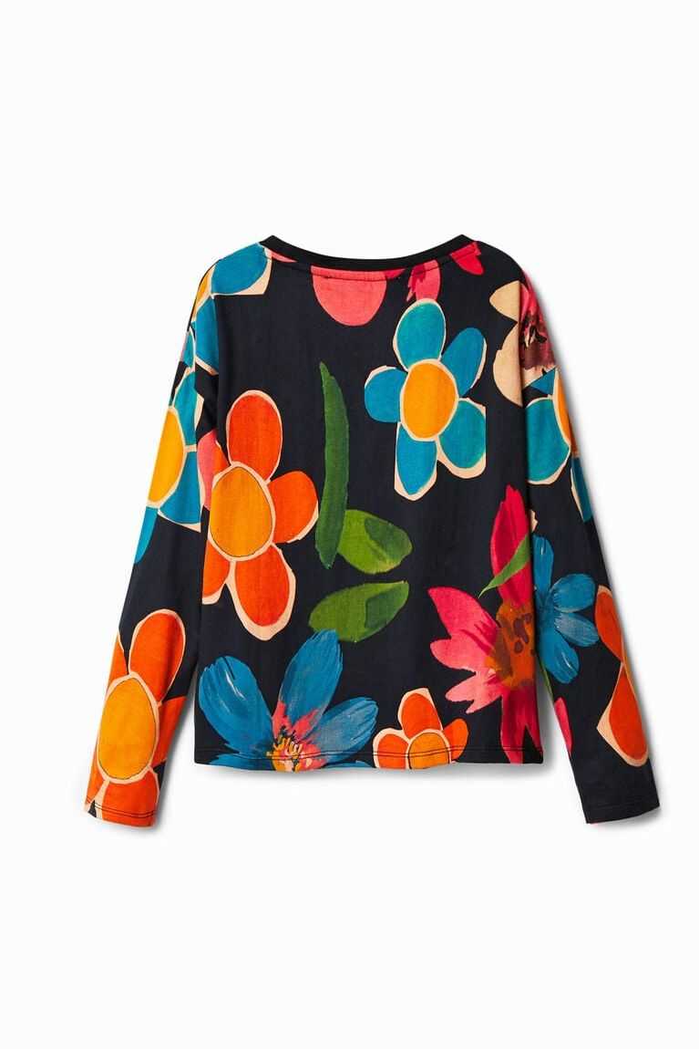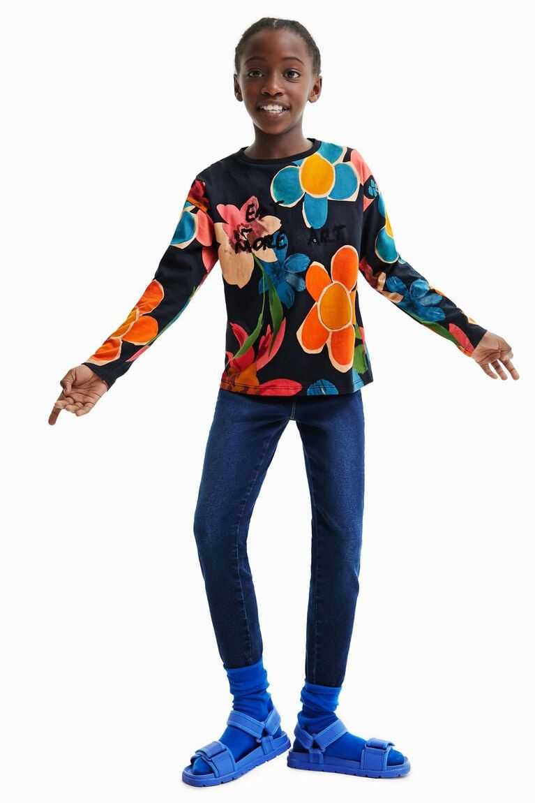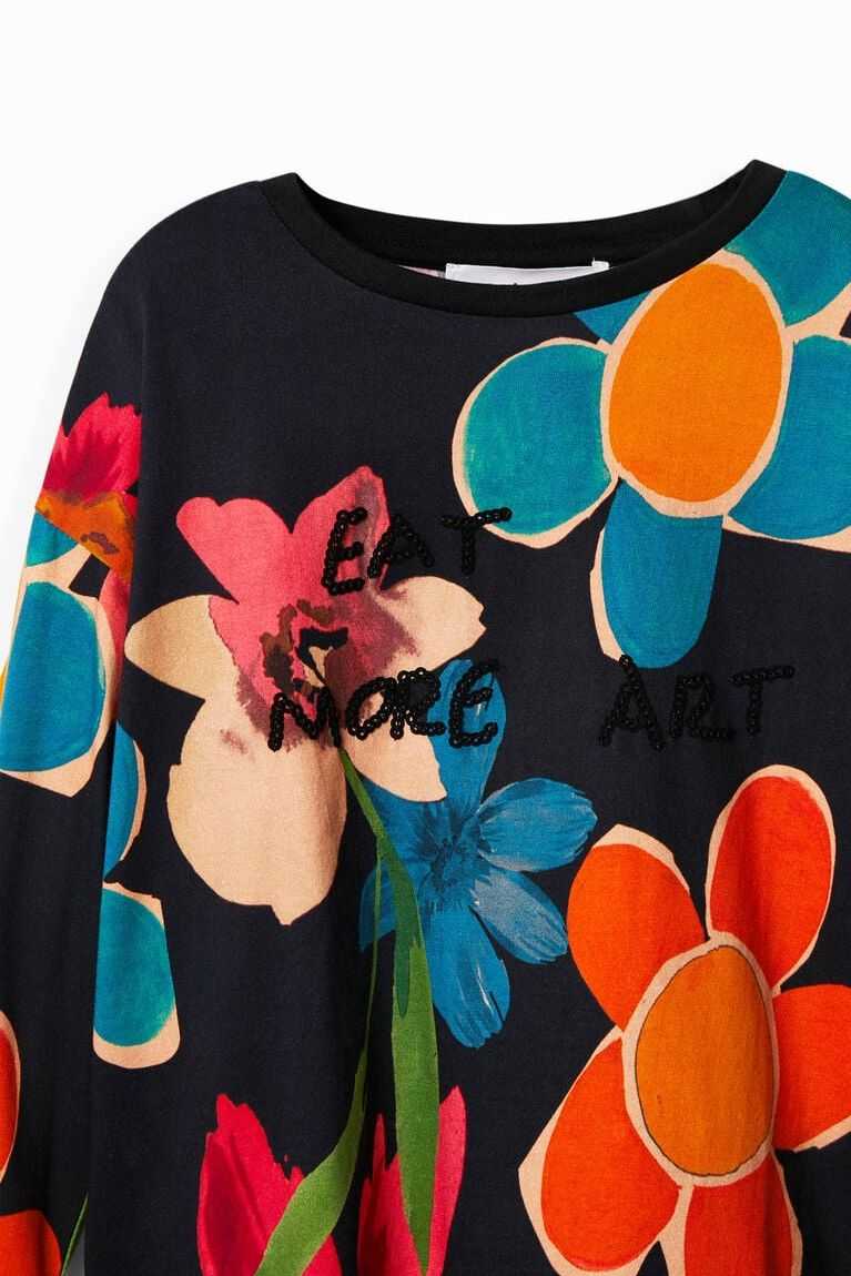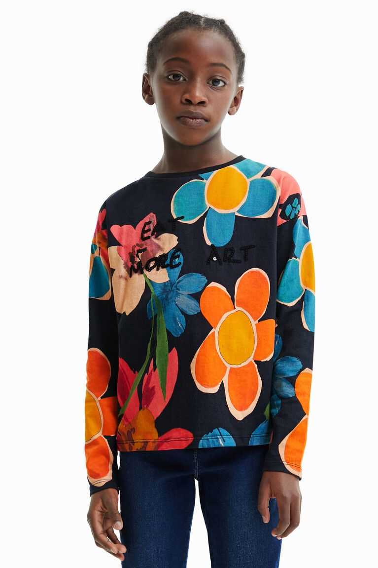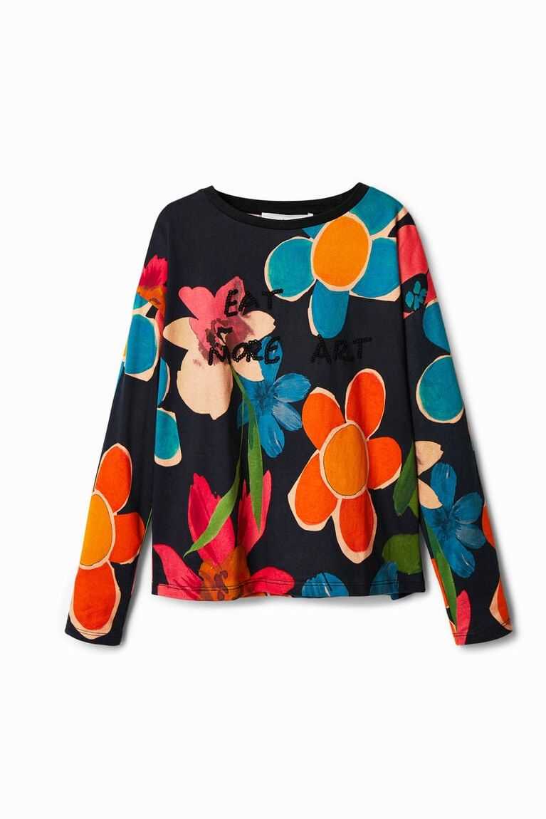 A cheerful long-sleeve T-shirt with an all-over floral print and the message "Eat More Art" embroidered in sequins on the chest.